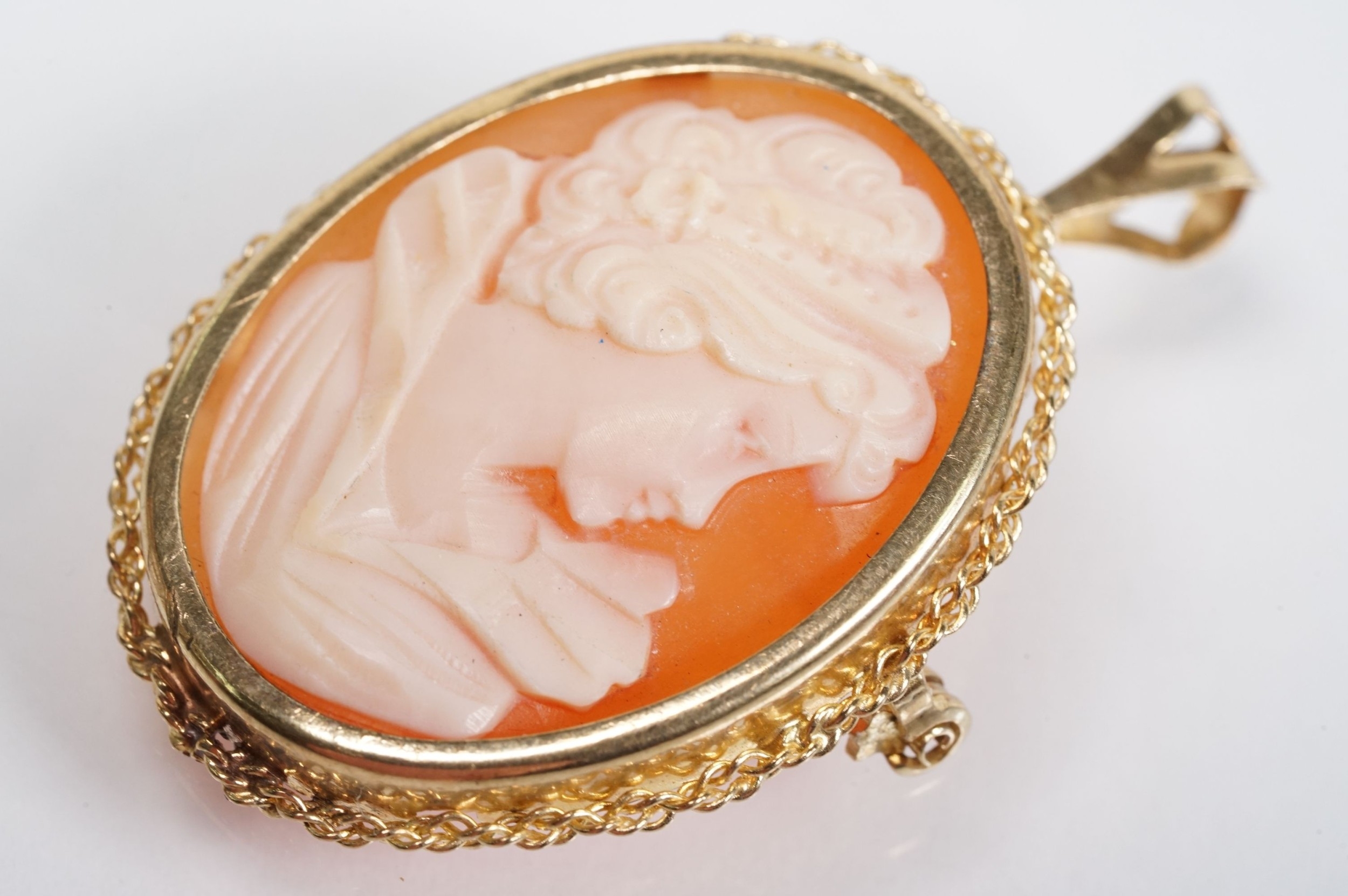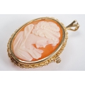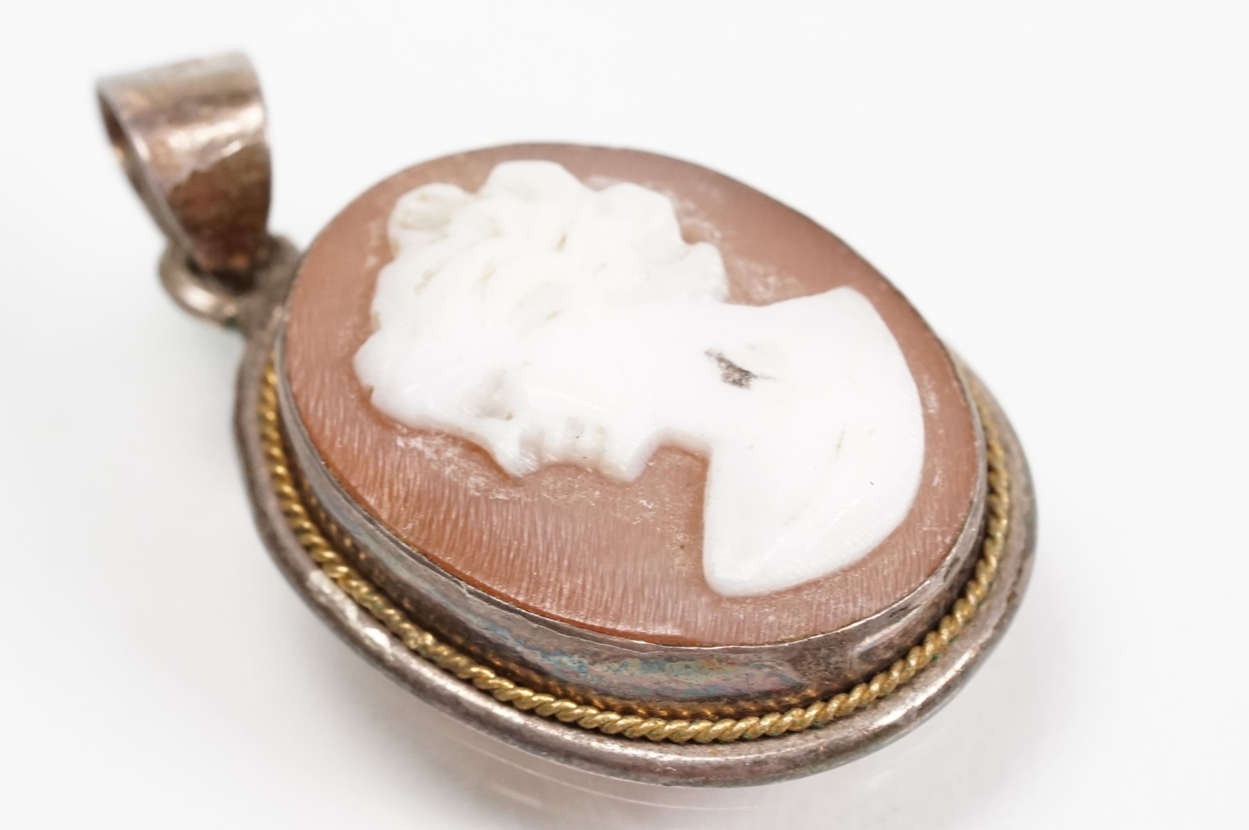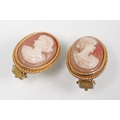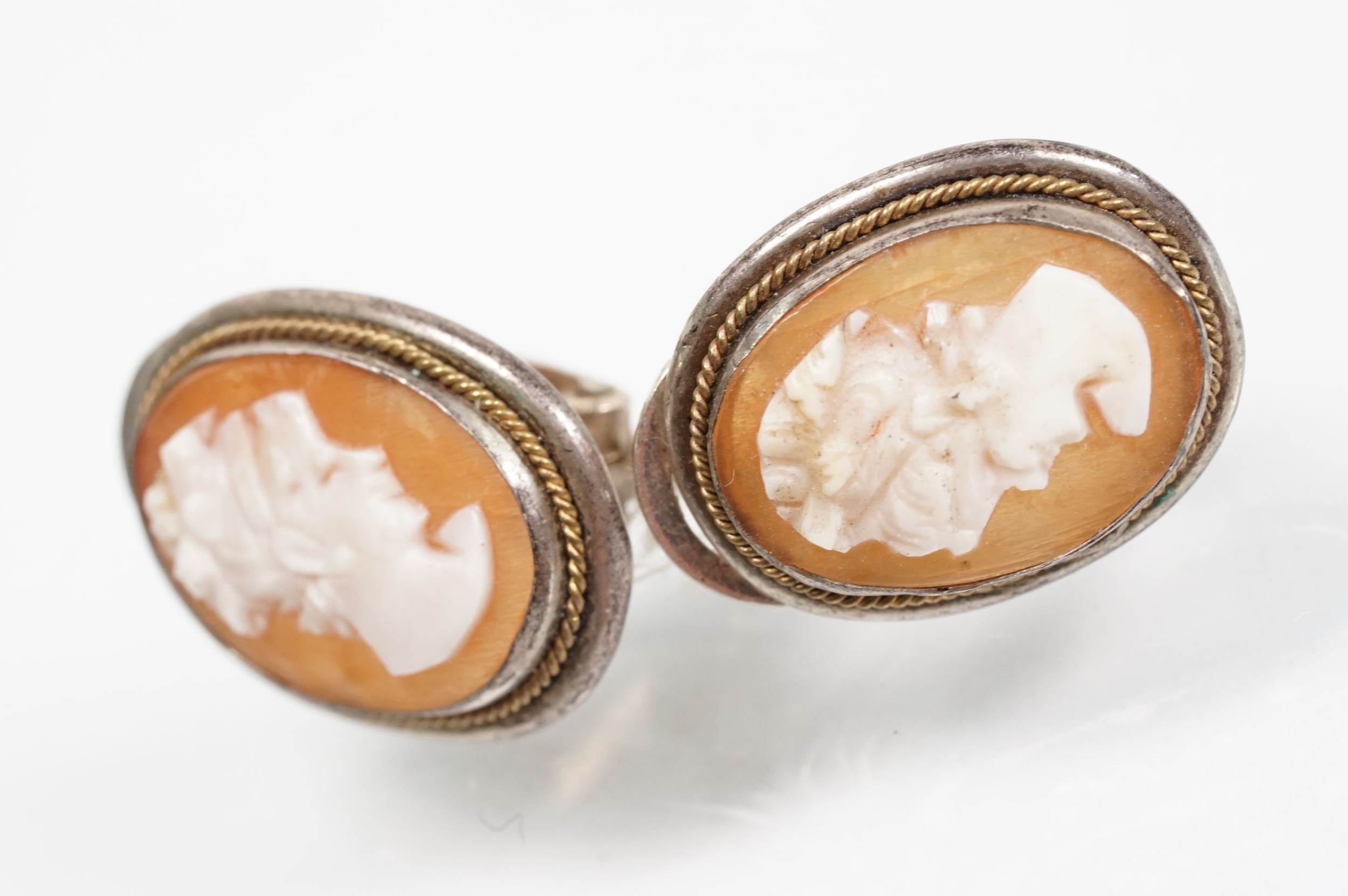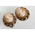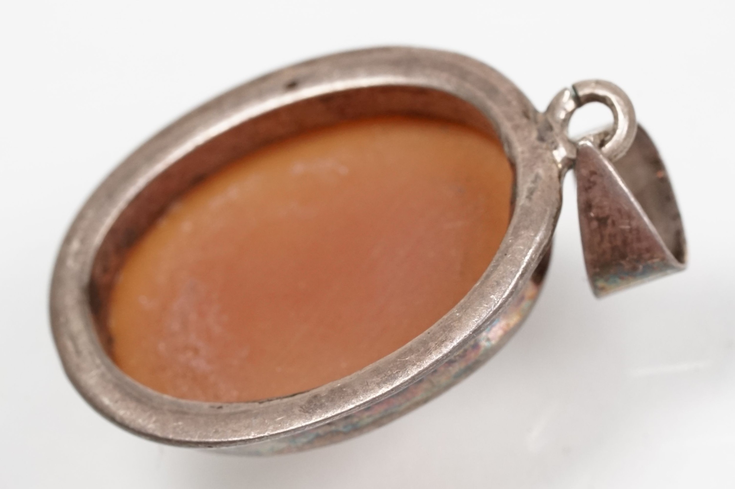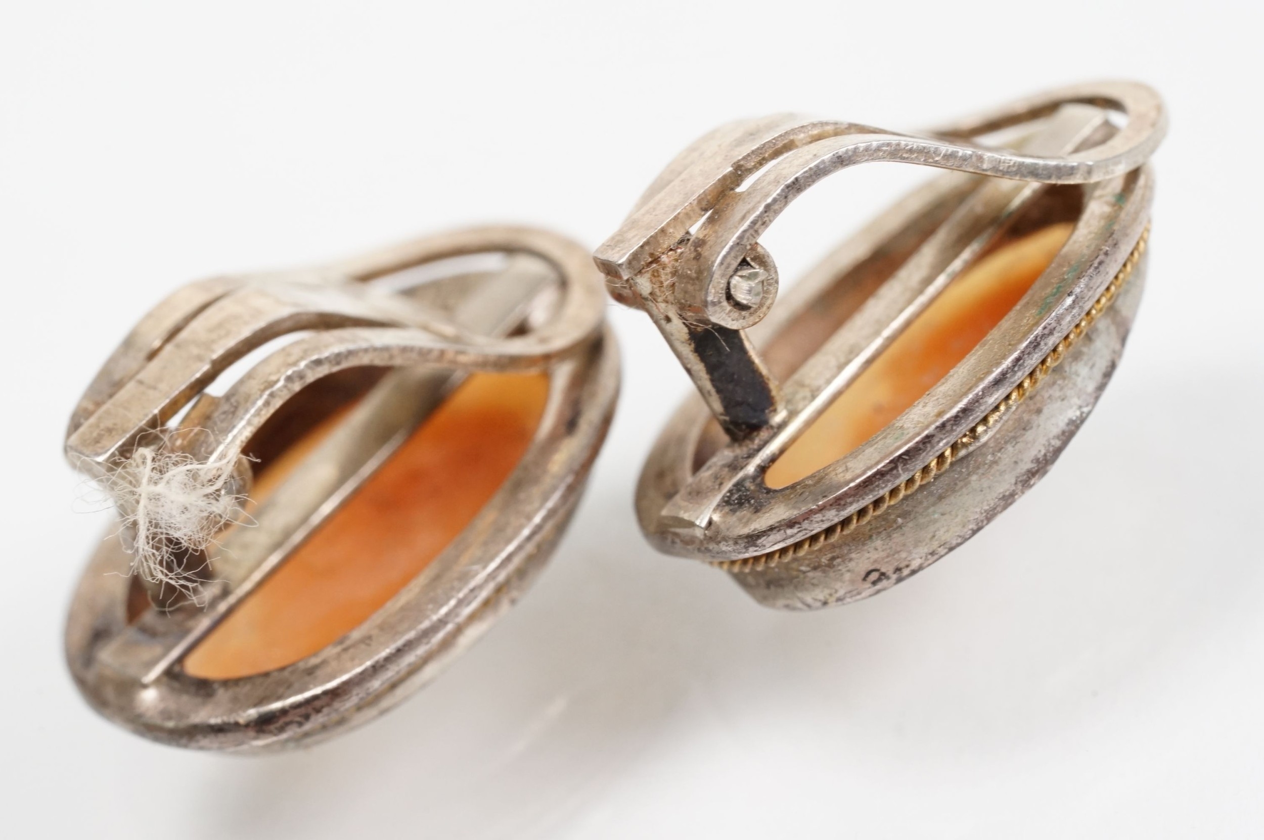 Group of cameo jewellery to include yellow metal and carved shell cameo pendant (partial hallmark to bale), three pairs of clip on earrings, a rolled gold cameo brooch and a silver set cameo brooch. Largest measures 6cm wide.