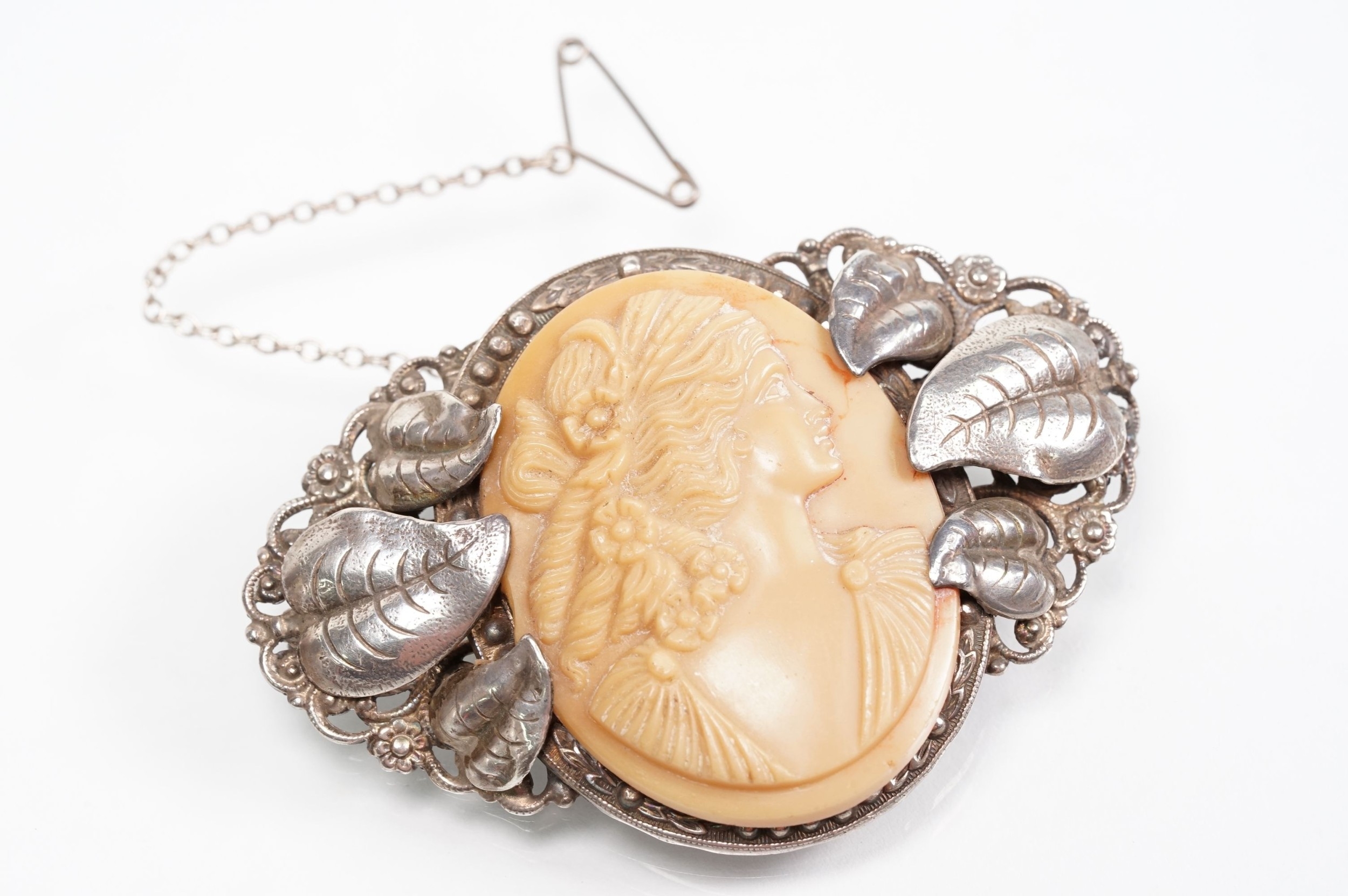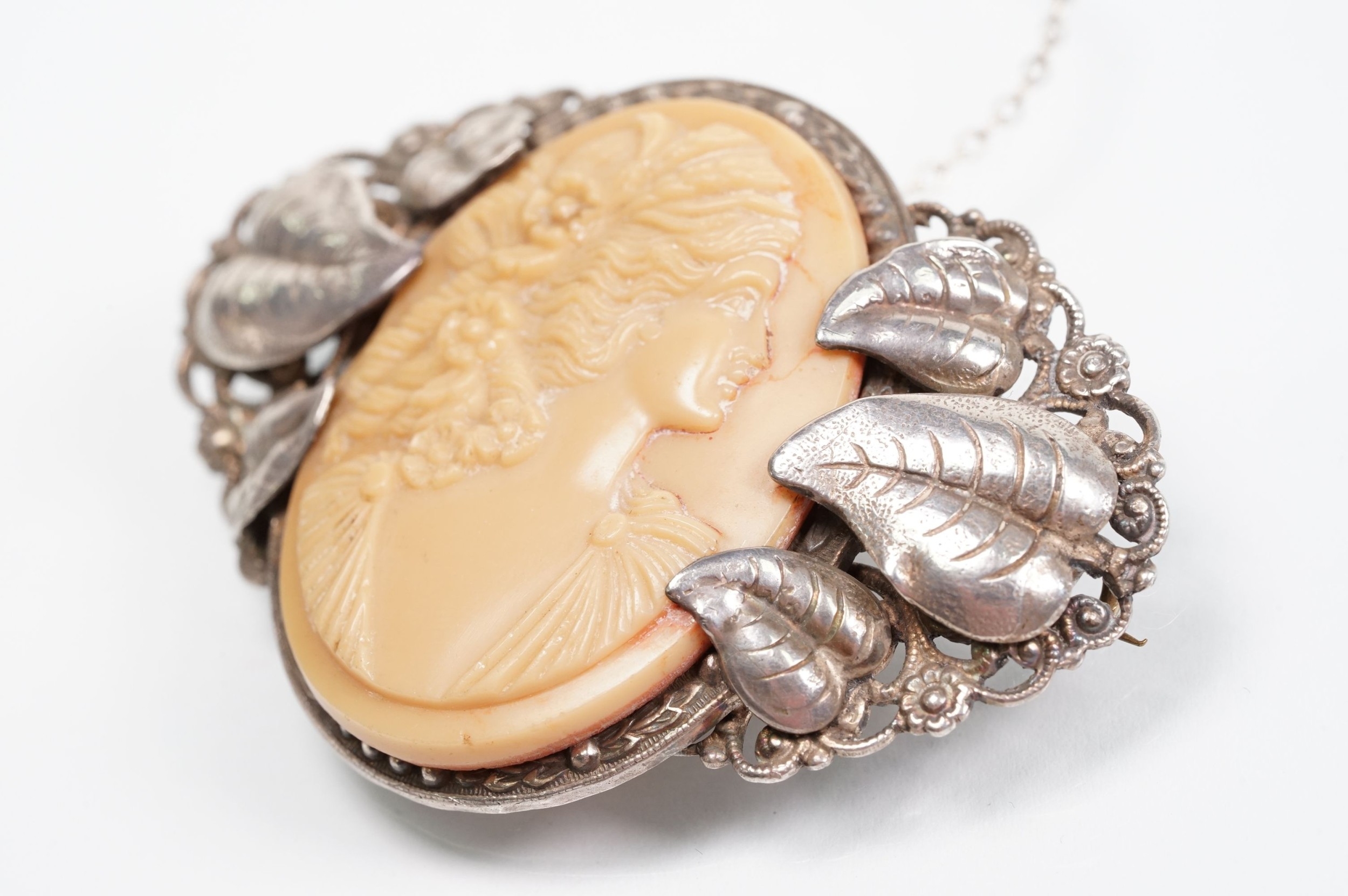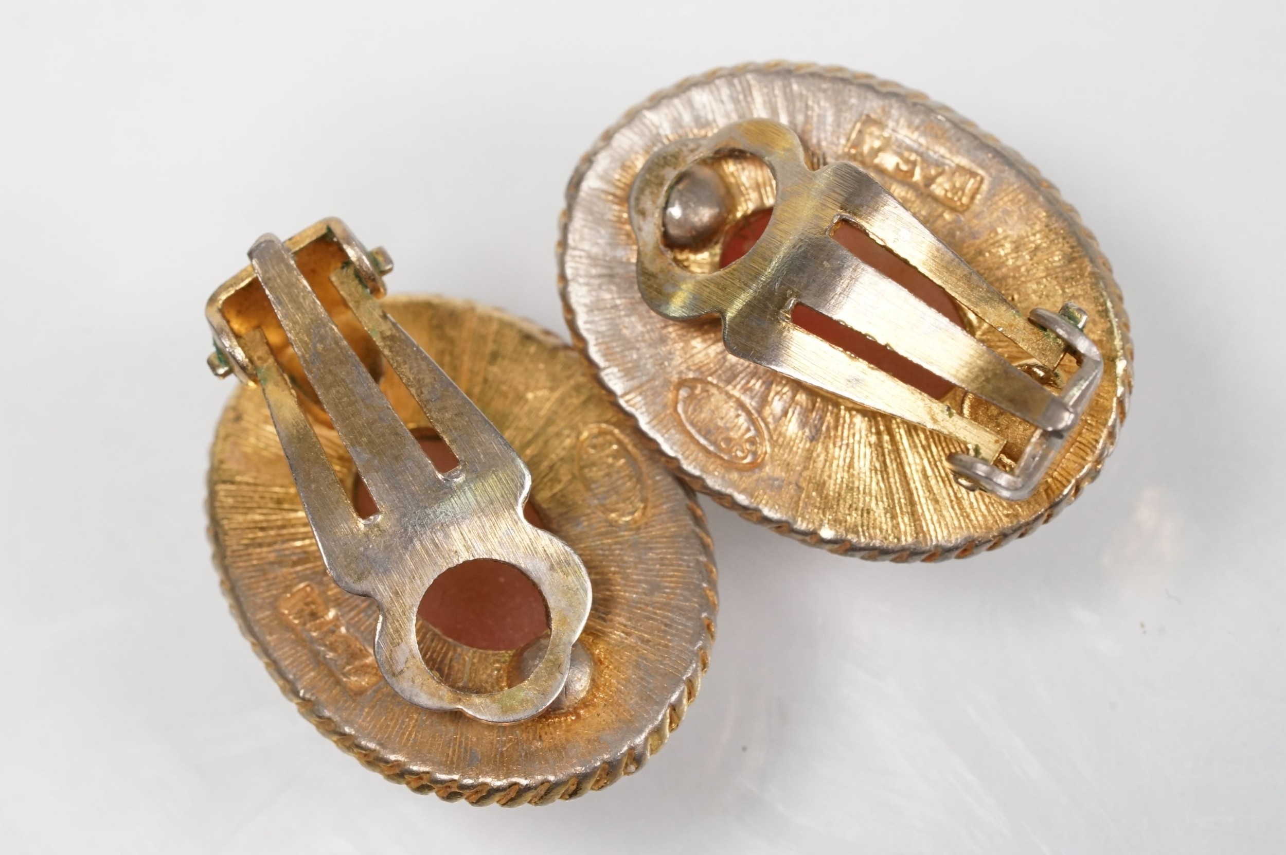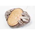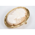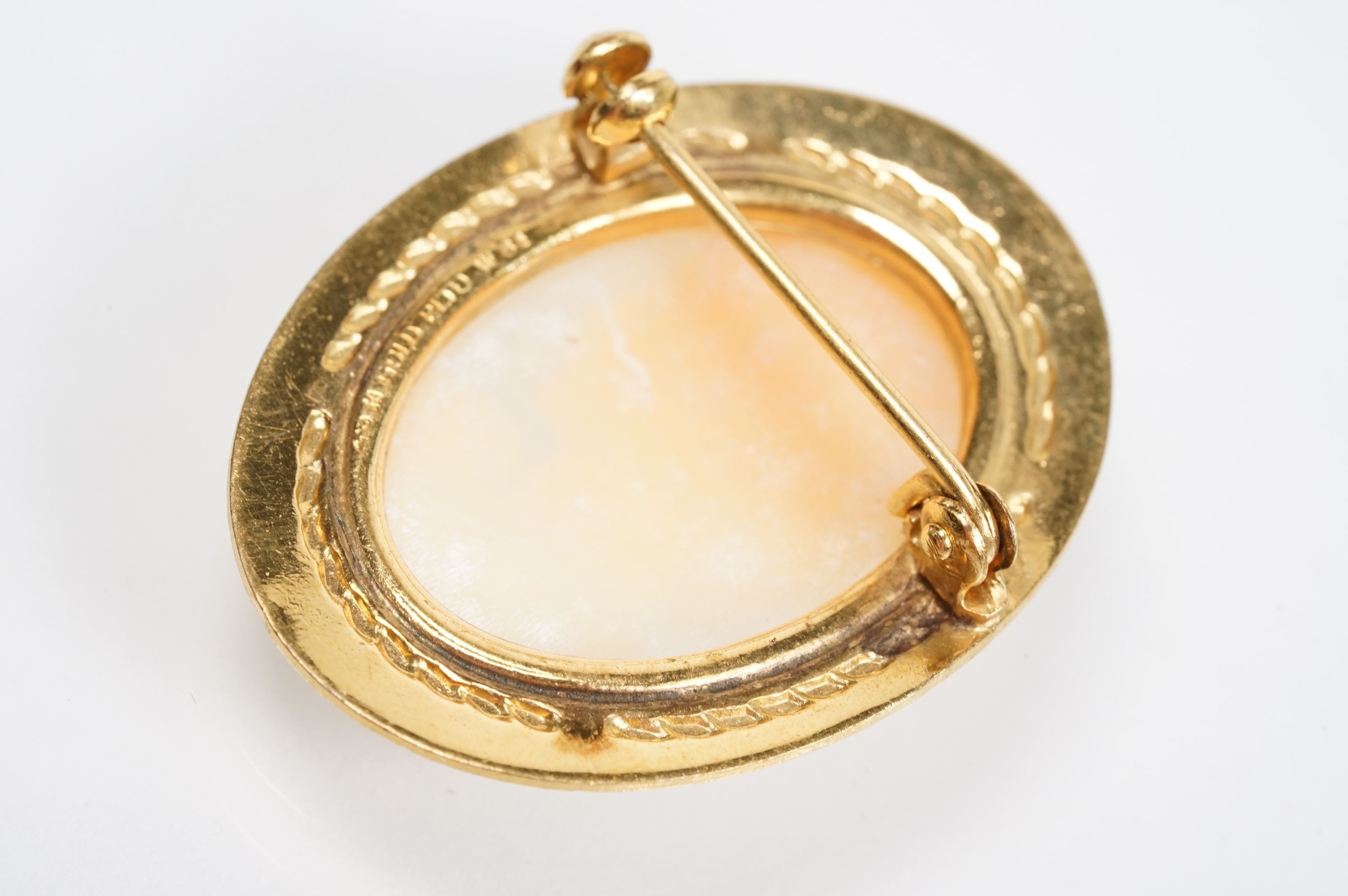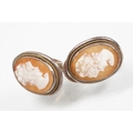 Group of cameo jewellery to include yellow metal and carved shell cameo pendant (partial hallmark to bale), three pairs of clip on earrings, a rolled gold cameo brooch and a silver set cameo brooch. Largest measures 6cm wide.