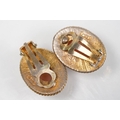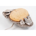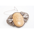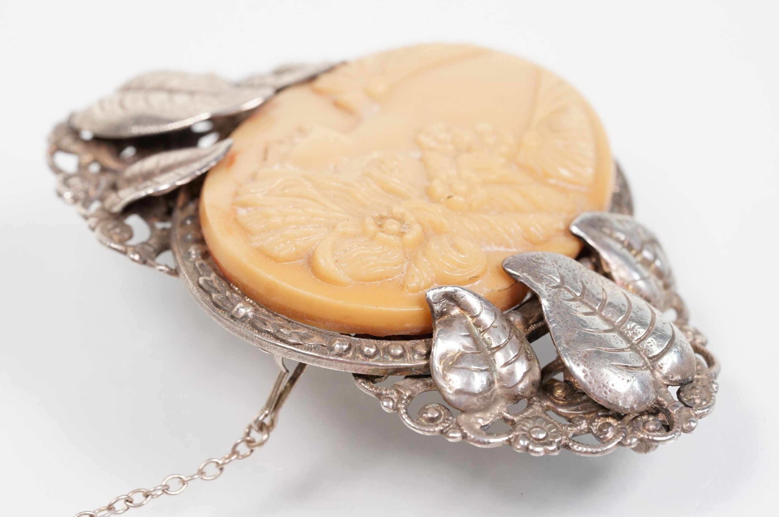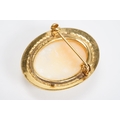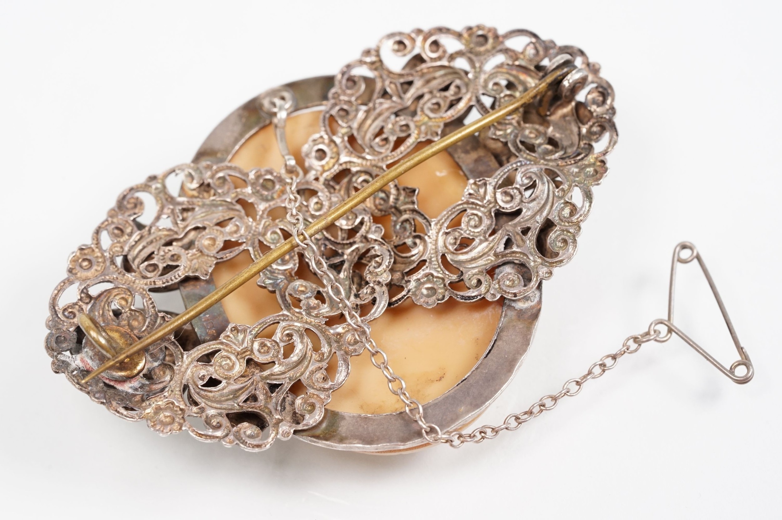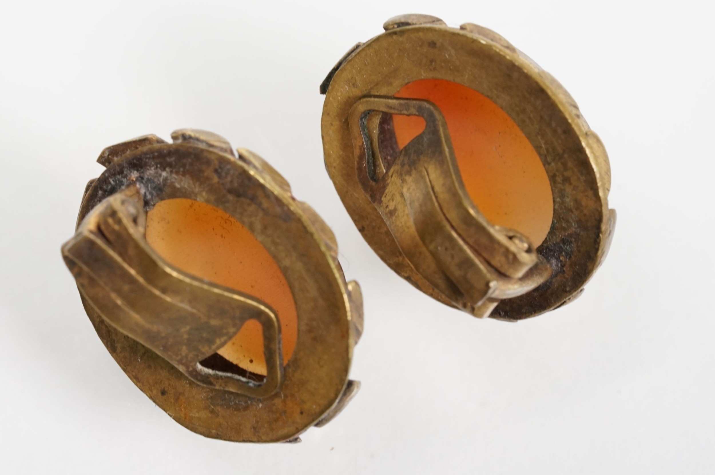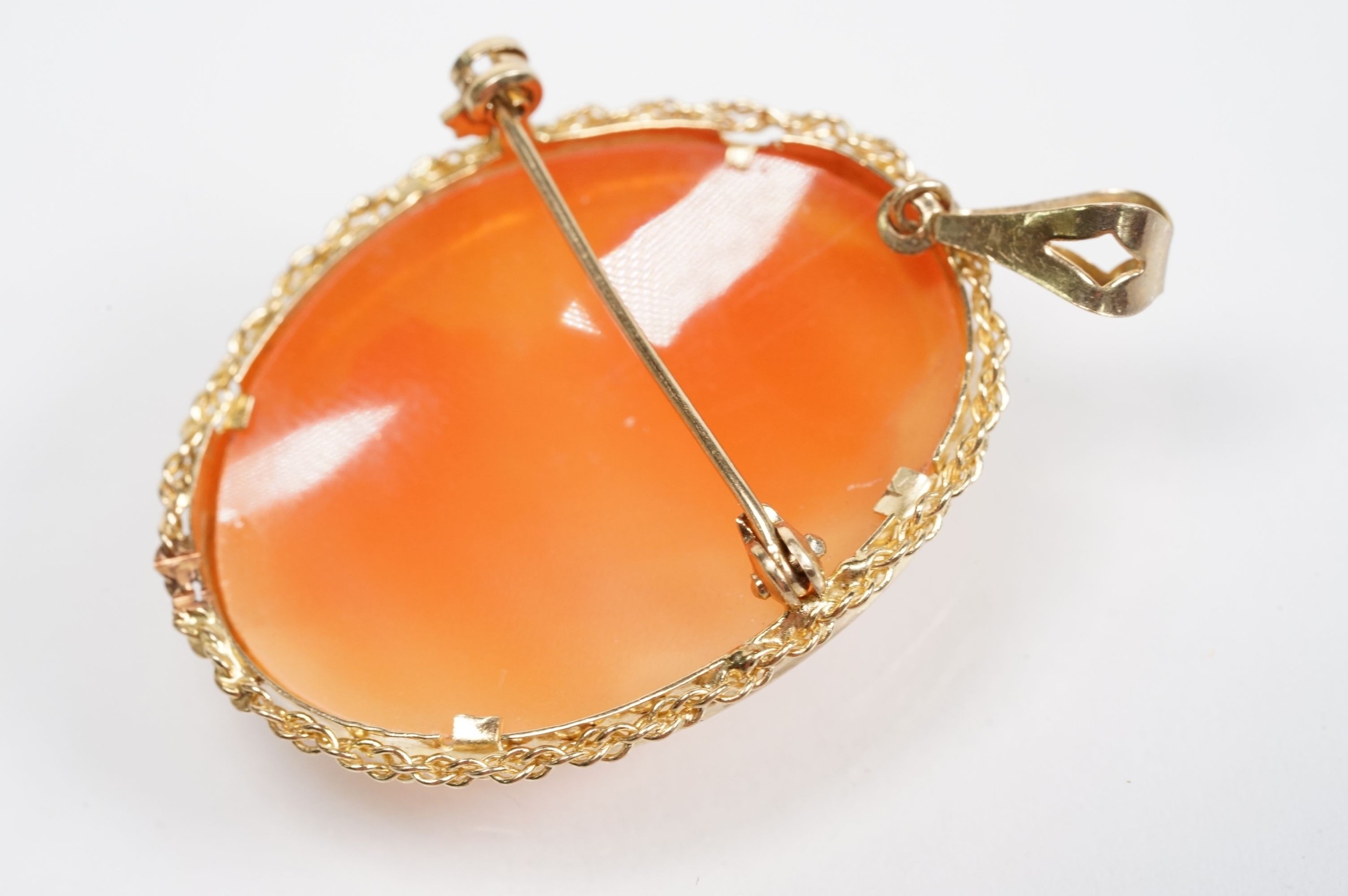 Group of cameo jewellery to include yellow metal and carved shell cameo pendant (partial hallmark to bale), three pairs of clip on earrings, a rolled gold cameo brooch and a silver set cameo brooch. Largest measures 6cm wide.