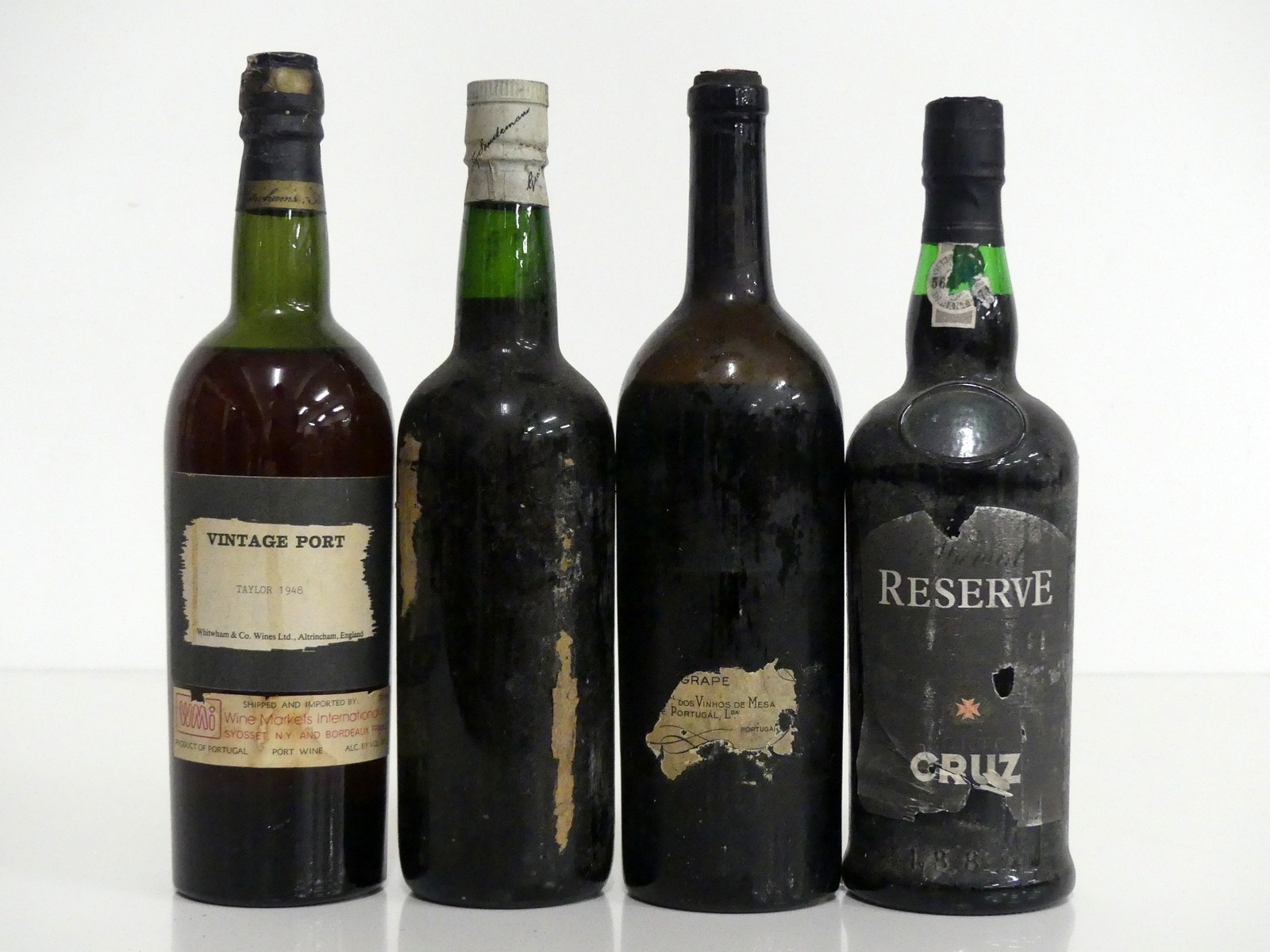 1 bt Taylor 1948 Vintage Port EB Whitwham & Co, ms, sl stl, shipped and imported by Wine Markets International 1 bt Unknown Sandeman Vintage Unknown bs, missing label 1 bt Unknown, believed Port 1 bt Cruz Special Reserve NV bs, sl cdl Above 4 bottles