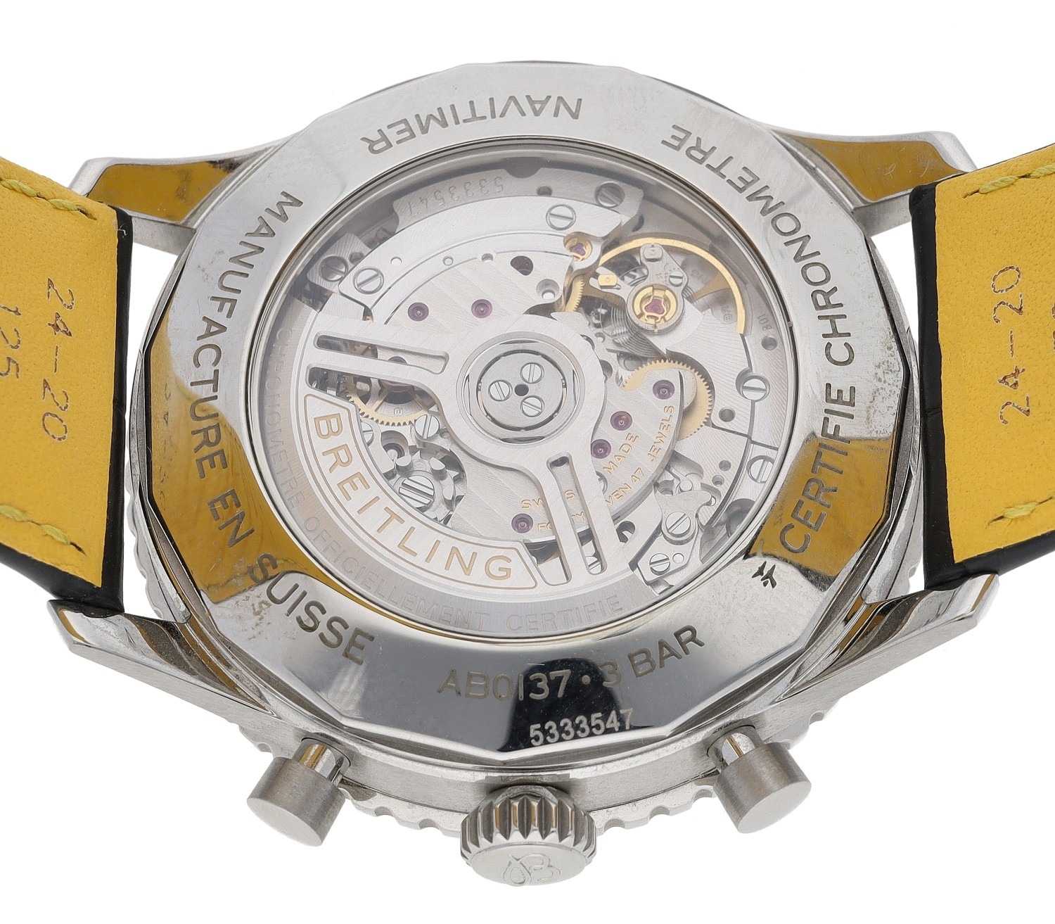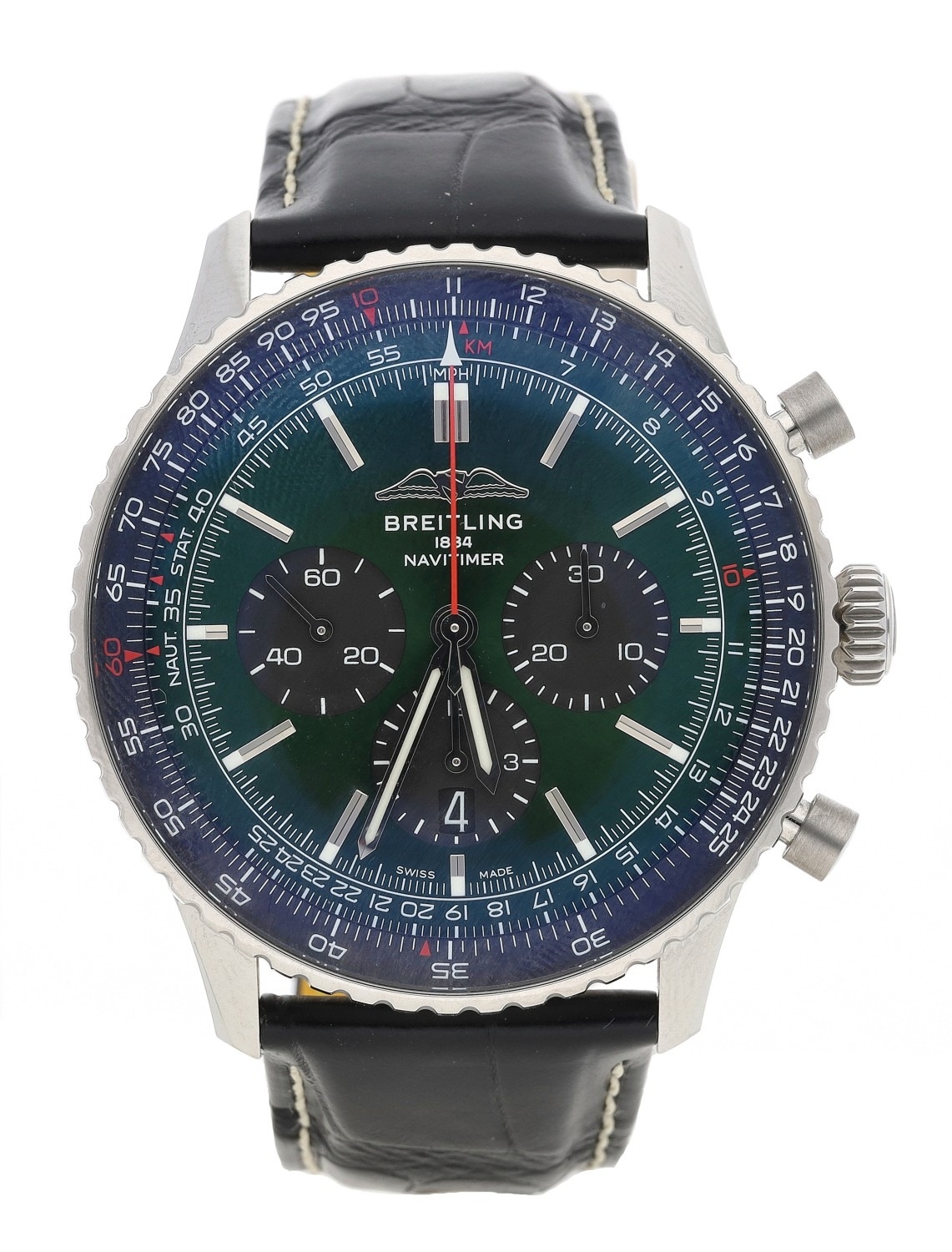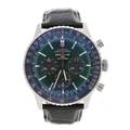 Breitling Navitimer B01 Chronograph 46 automatic stainless steel gentleman's wristwatch, reference no. AB0137, serial no. 5333xxx, green dial, rotating slide rule bezel, 47 jewel movement, exhibition case, Breitling black/yellow crocodile strap with signed folding clasp, 46mm (ref: 326)