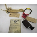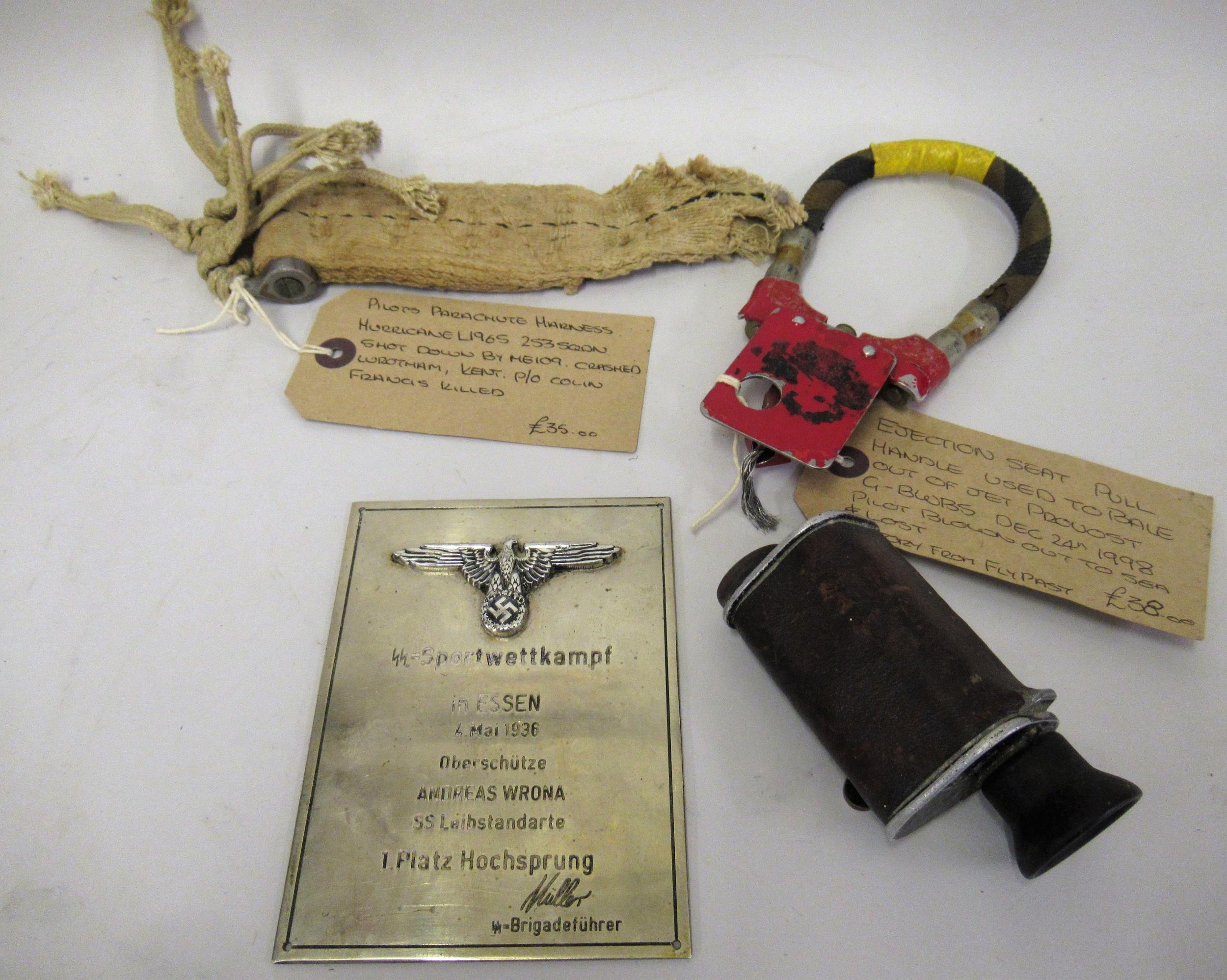 1936 German Third Reich silver plated sporting trophy plaque, together with a Goerz German monocular and two remnants from crashed aircraft
