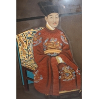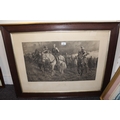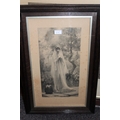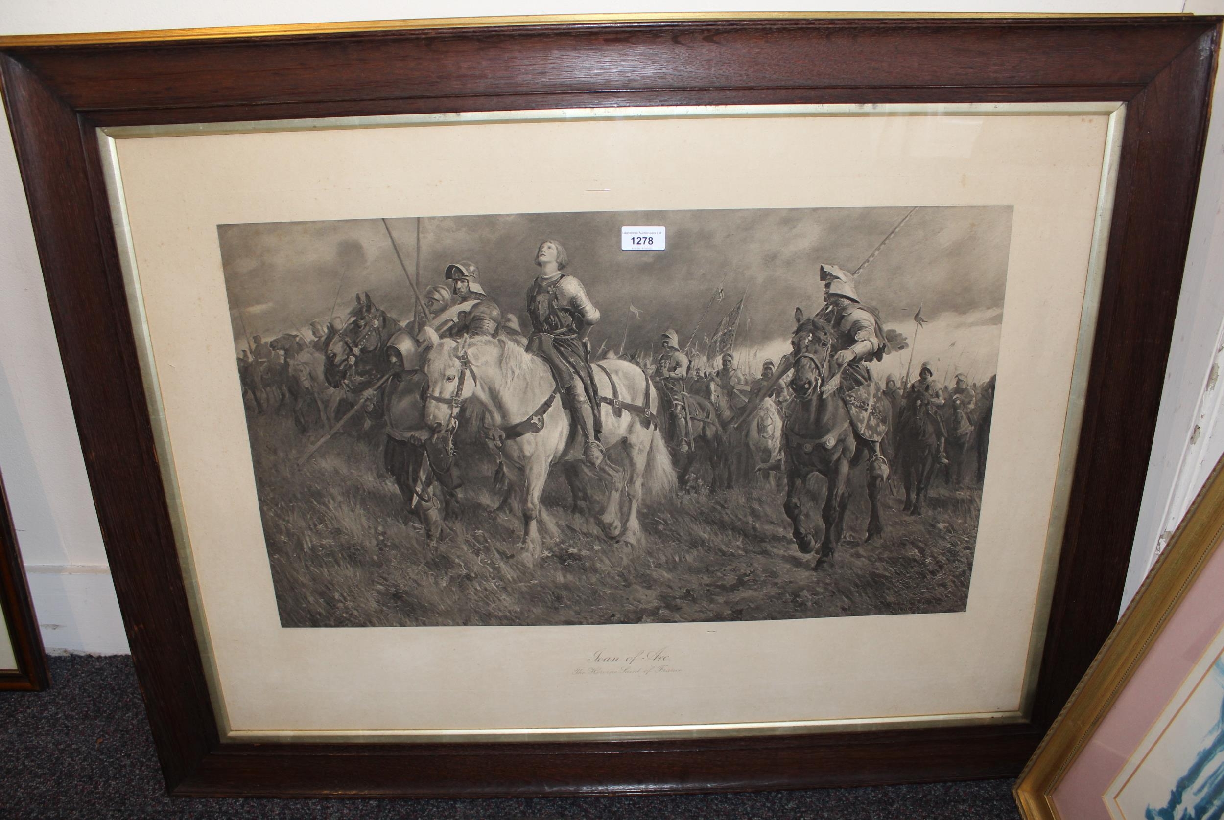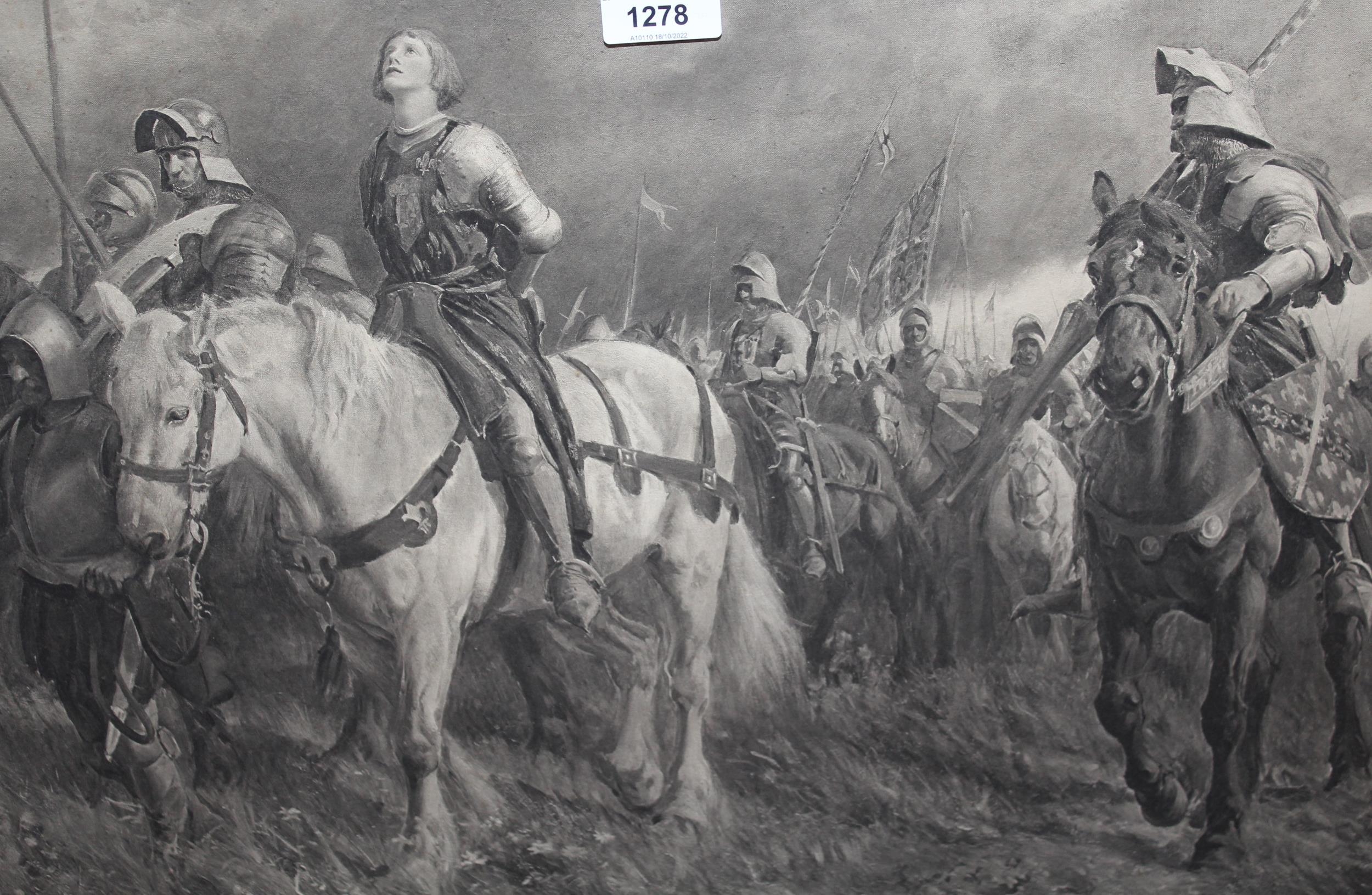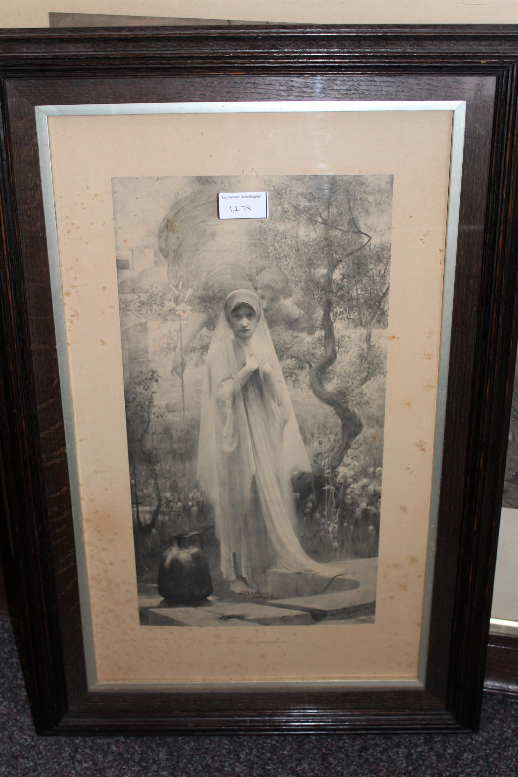19th Century black and white engraving, Joan of Arc, the heroine saint of France, oak framed, 21ins x 31ins together with another black and white print, titled ' The Annunciation ', oak framed, 17ins x 9ins
