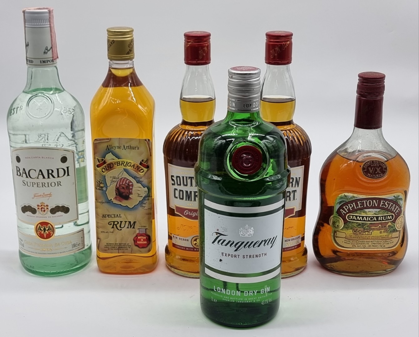 Six bottles of Spirits, comprising: two 70cl Southern Comfort; a 1 litre Gin; a 75cl Appleton Estate Jamaica Rum; and two further bottles of Rum. (6)
