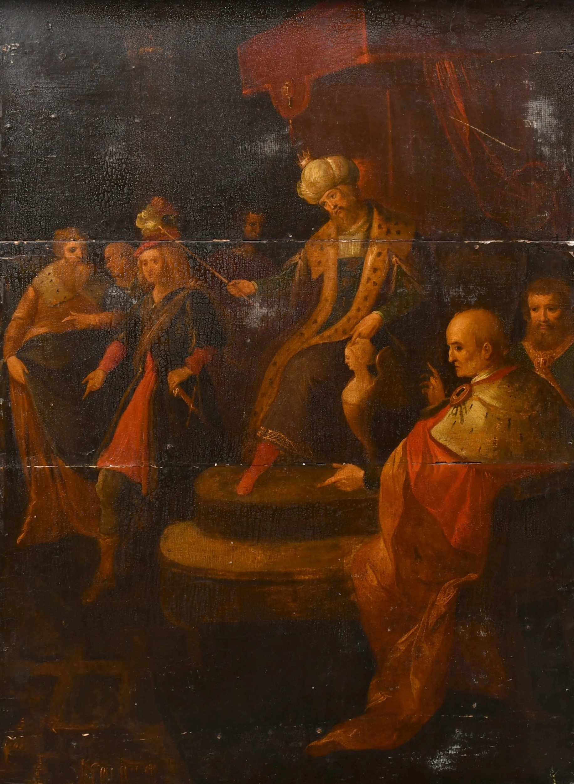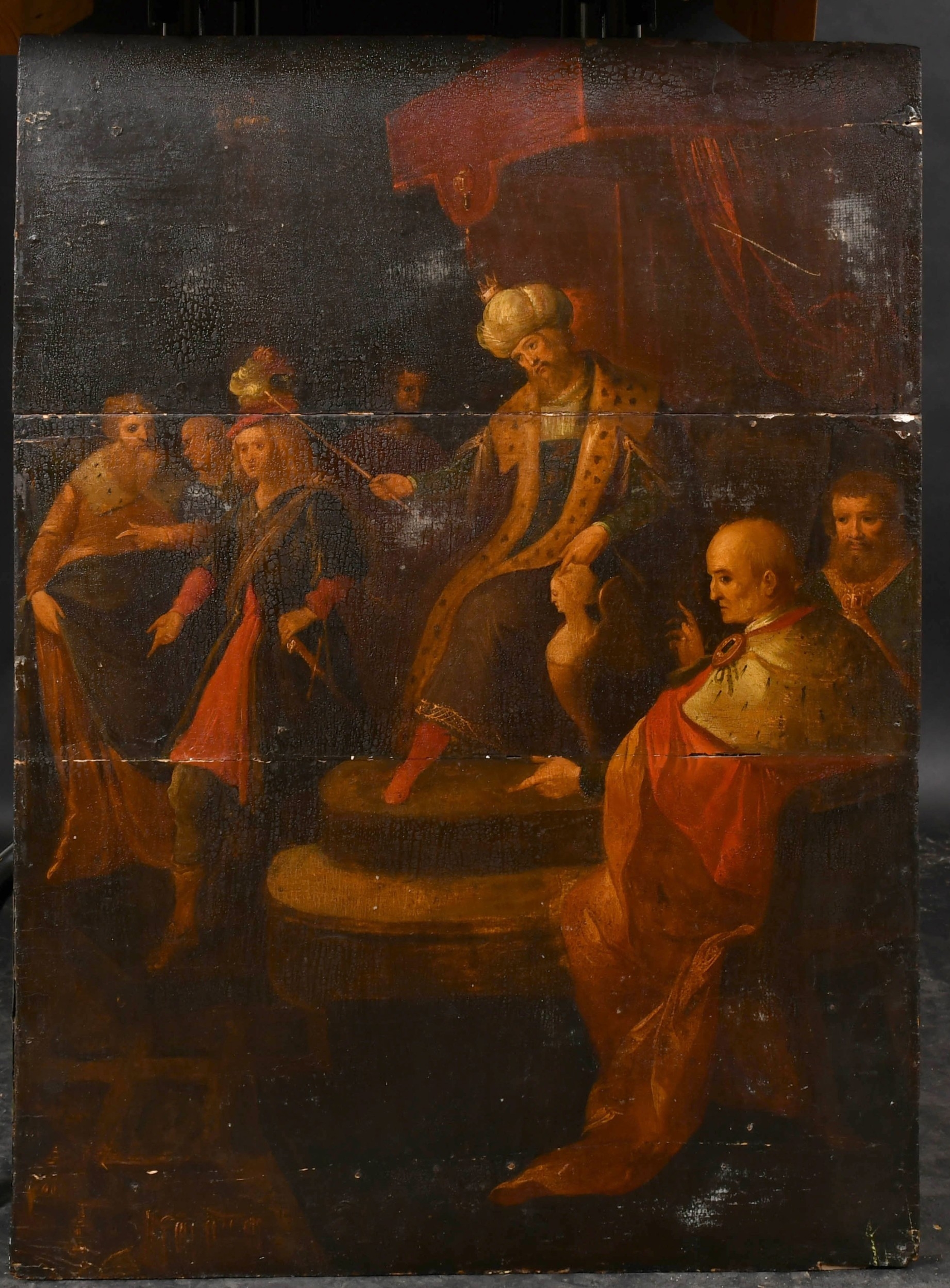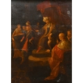 Manner of Frans Francken the Elder (1542-1616) Flemish. "Esther Before King Ahasuerus", Oil on panel, Inscribed verso, unframed 28" x 20.25" (71.1 x 51.4cm)