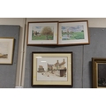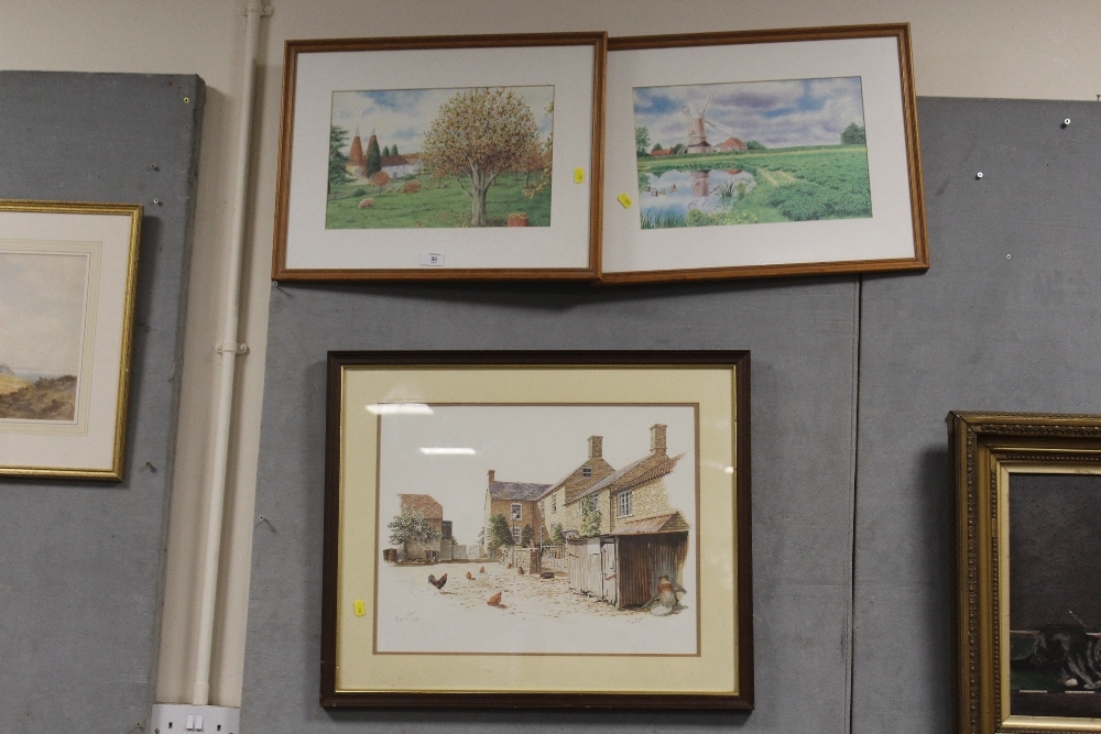 A PAIR OF FRAMED AND GLAZED PRINTS OF RURAL LANDSCAPES TOGETHER WITH A MICHAEL COOPER PRINT OF A FARMYARD (3)