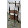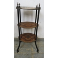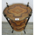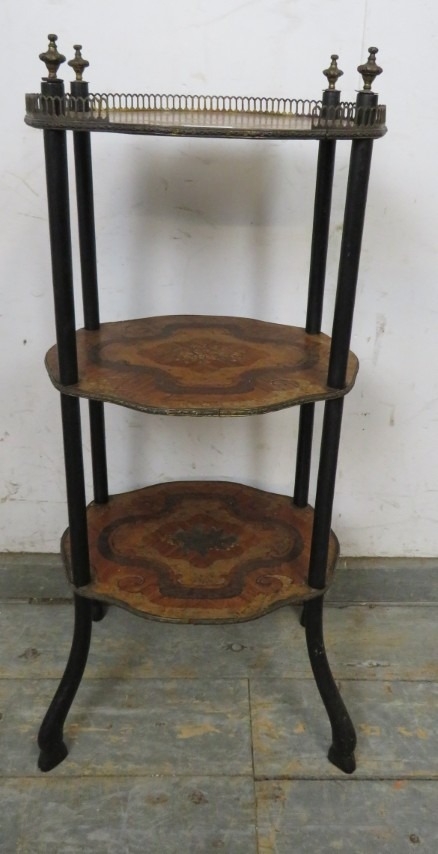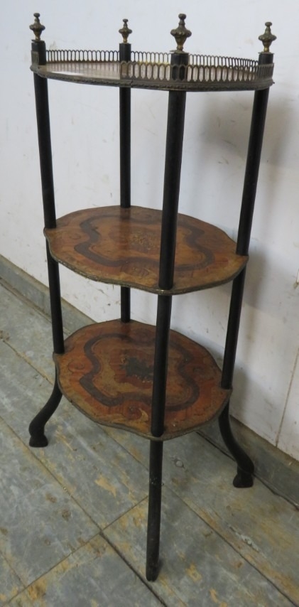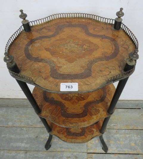 A three tier French Regency period inlaid marquetry whatnot with a brass gallery rail to top and fine marquetry shelves. H79cm x W38cm x D27cm approx.