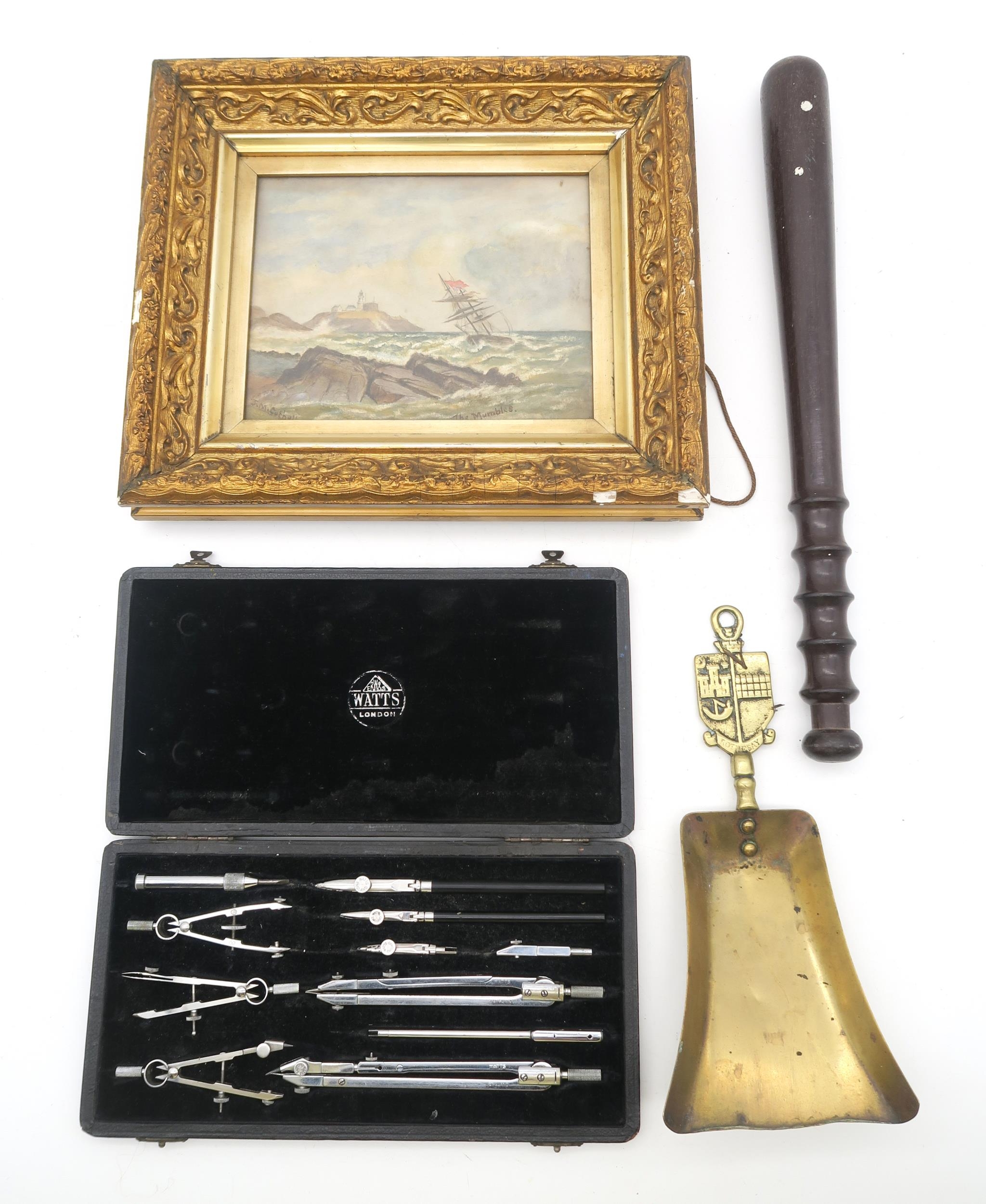 A small watercolour seascape by J.M. Cuthell, titled The Mumbles (Swansea), in gilt frame measuring approx. 29.5cm x 25cm externally; together with a hardwood police truncheon, cased set of draughtsman's instruments by Watts, London etc.