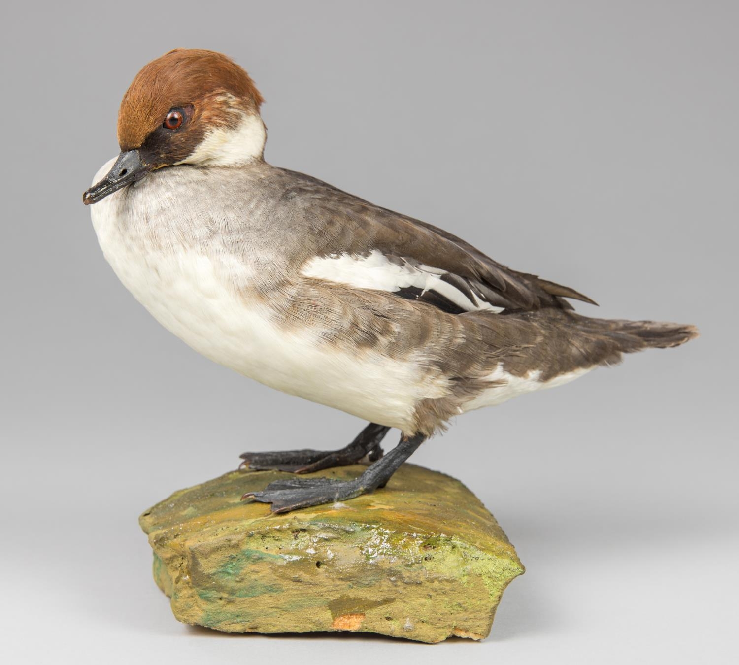 AN EARLY 20TH CENTURY TAXIDERMY SMEW UPON A NATURALISTIC BASE.