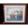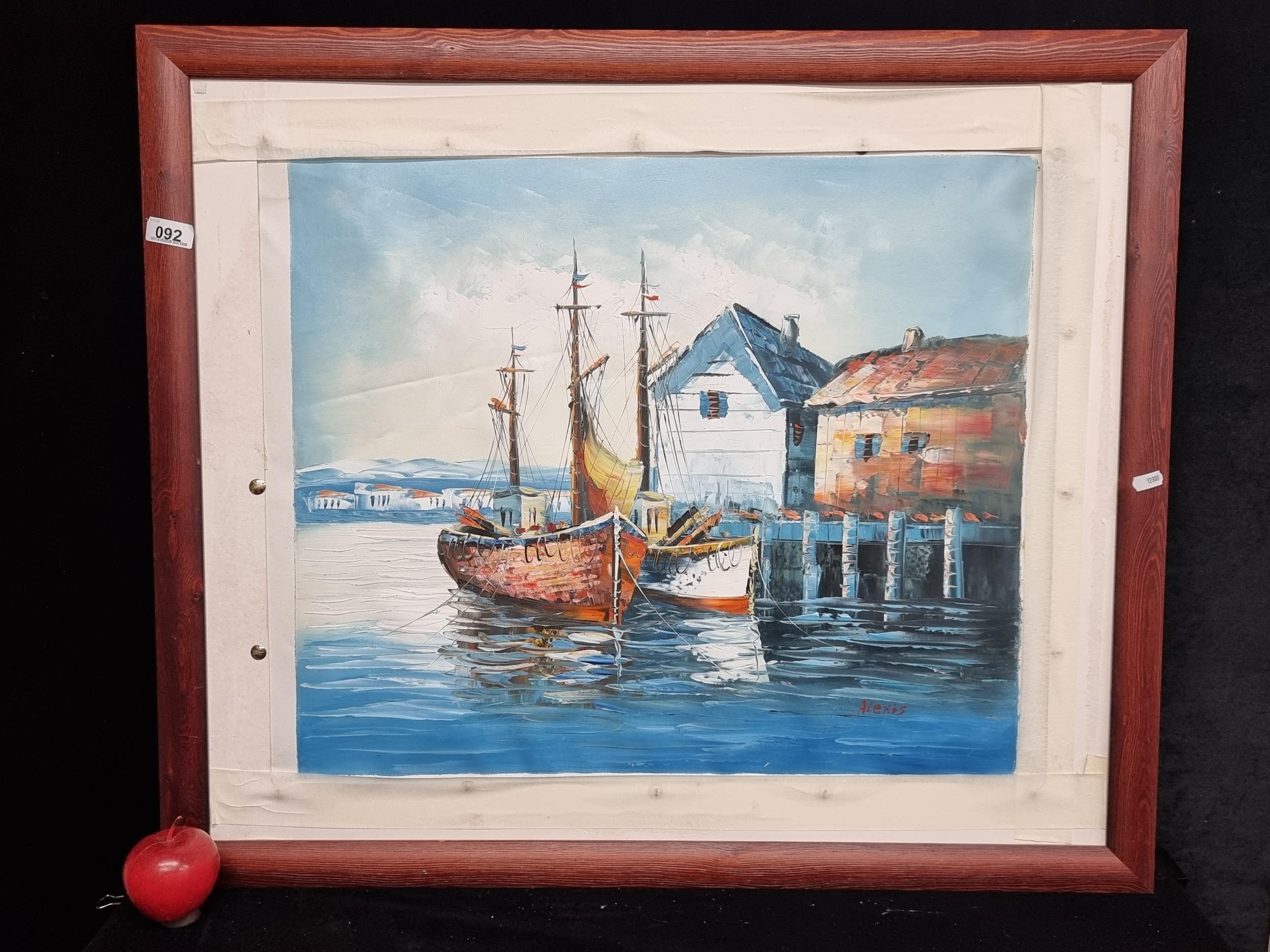 A lovely original oil on canvas painting showing sail boats moored at a still shore, on a bright clear day. Signed Alexis bottom right.
