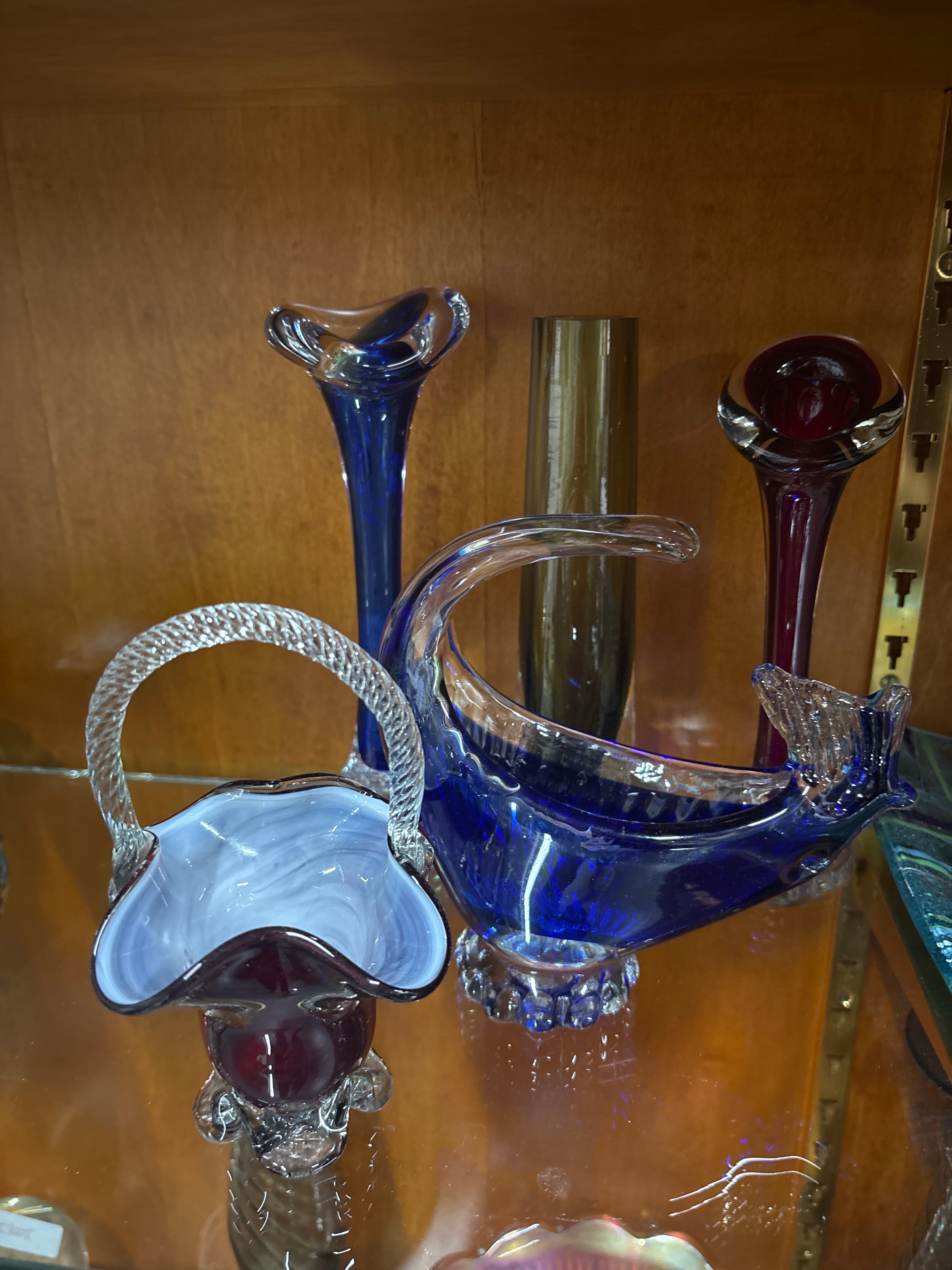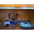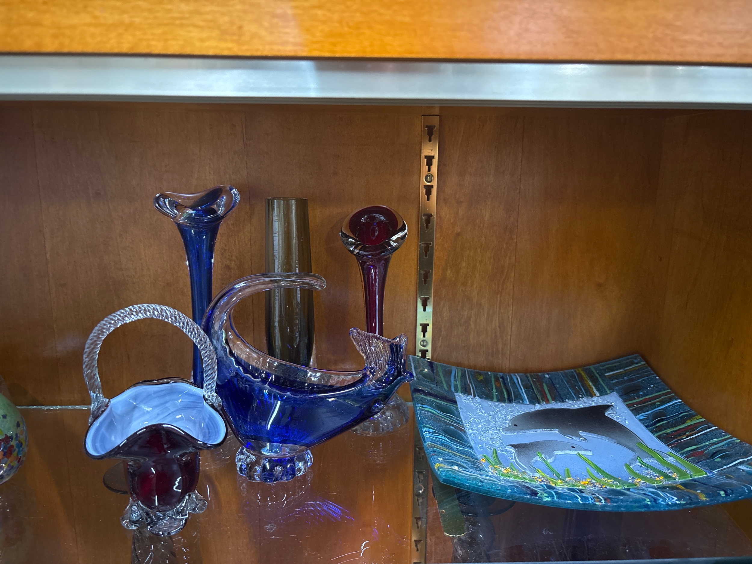 6 pieces of glass including Murano style basket and Dolphin plate