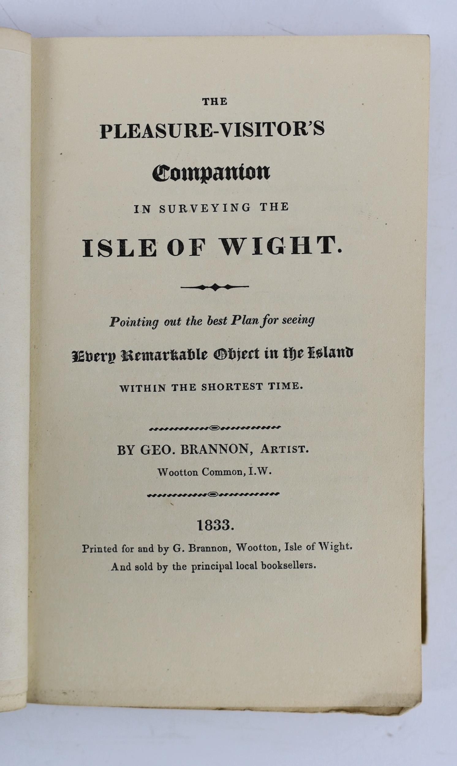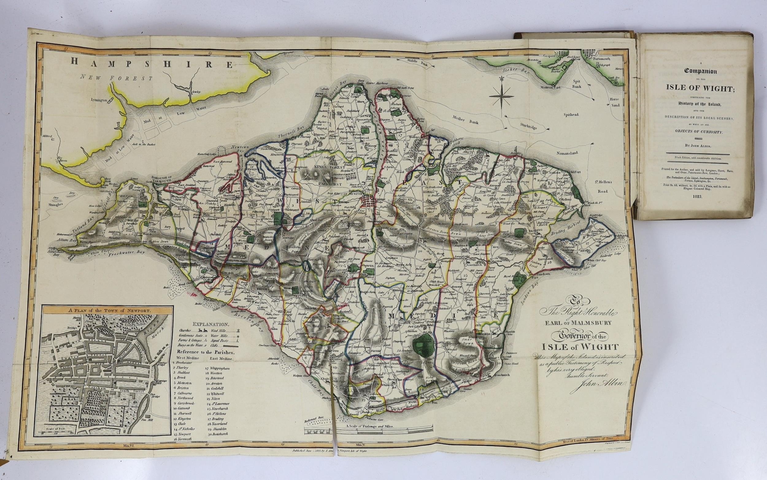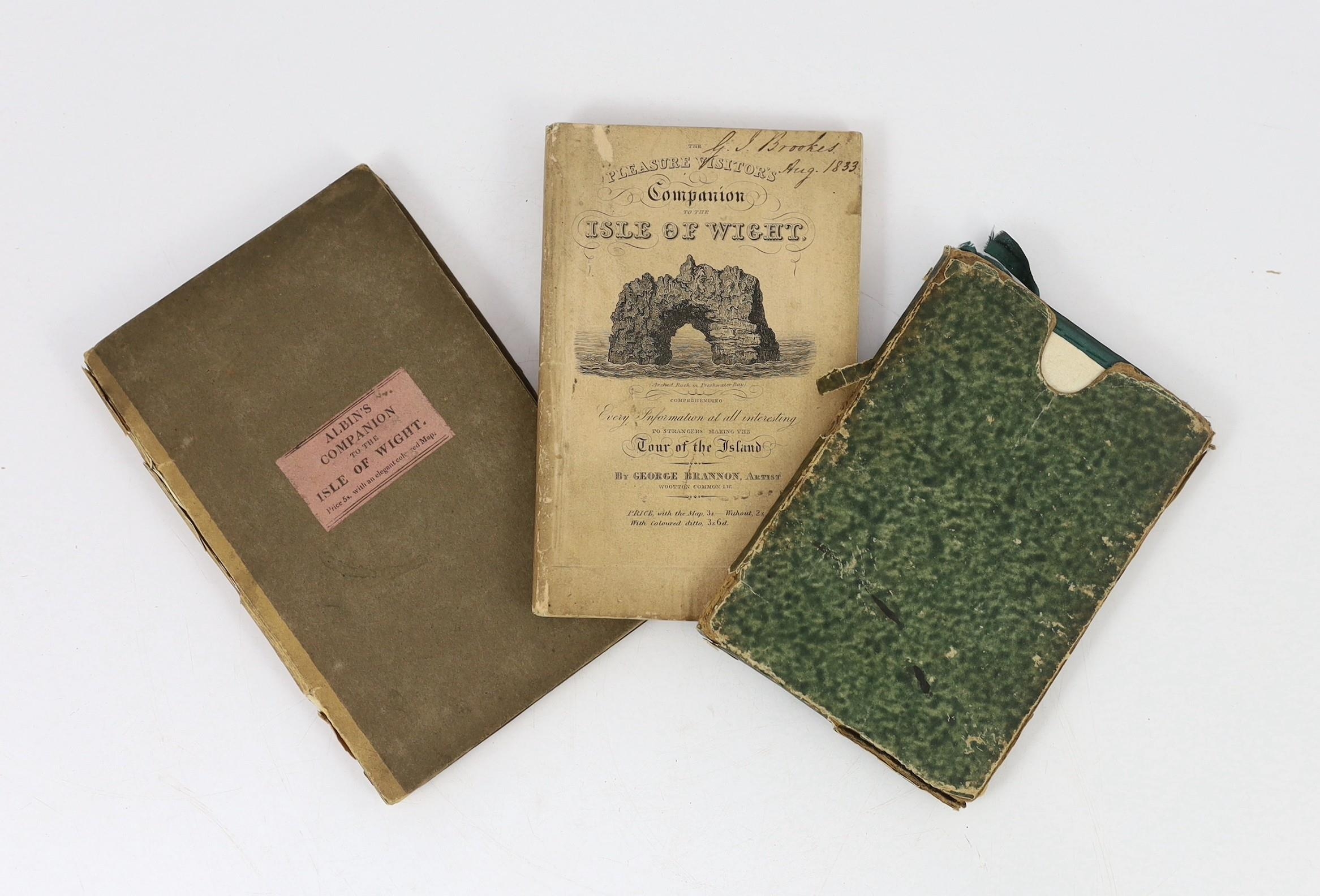 ° ° ISLE OF WIGHT: Brannon George - The Pleasure - Visitor's Companion in Surveying the Isle of Wight. Pointing out the best plan for seeing every remarkable object ... within the shortest time. folded map and 3 plates; original pictorial printed wrappers, 12mo. Wootton (I.O.W.), 1833: Albin, John - A Companion to the Isle of Wight ... 9th edition, with considerable additions. large hand-coloured and folded map, engraved plate and folded table; original paper boards with printed labels, uncut, 12mo. Newport: printed for the Author ... 1823; Albin, John - (Isle of Wight Map). hand-coloured and folded on linen, engraved dedication, inset plan of Newport, 39 x 59cms. (approx), in original marbled slipcase. Newport, 1807 (3)