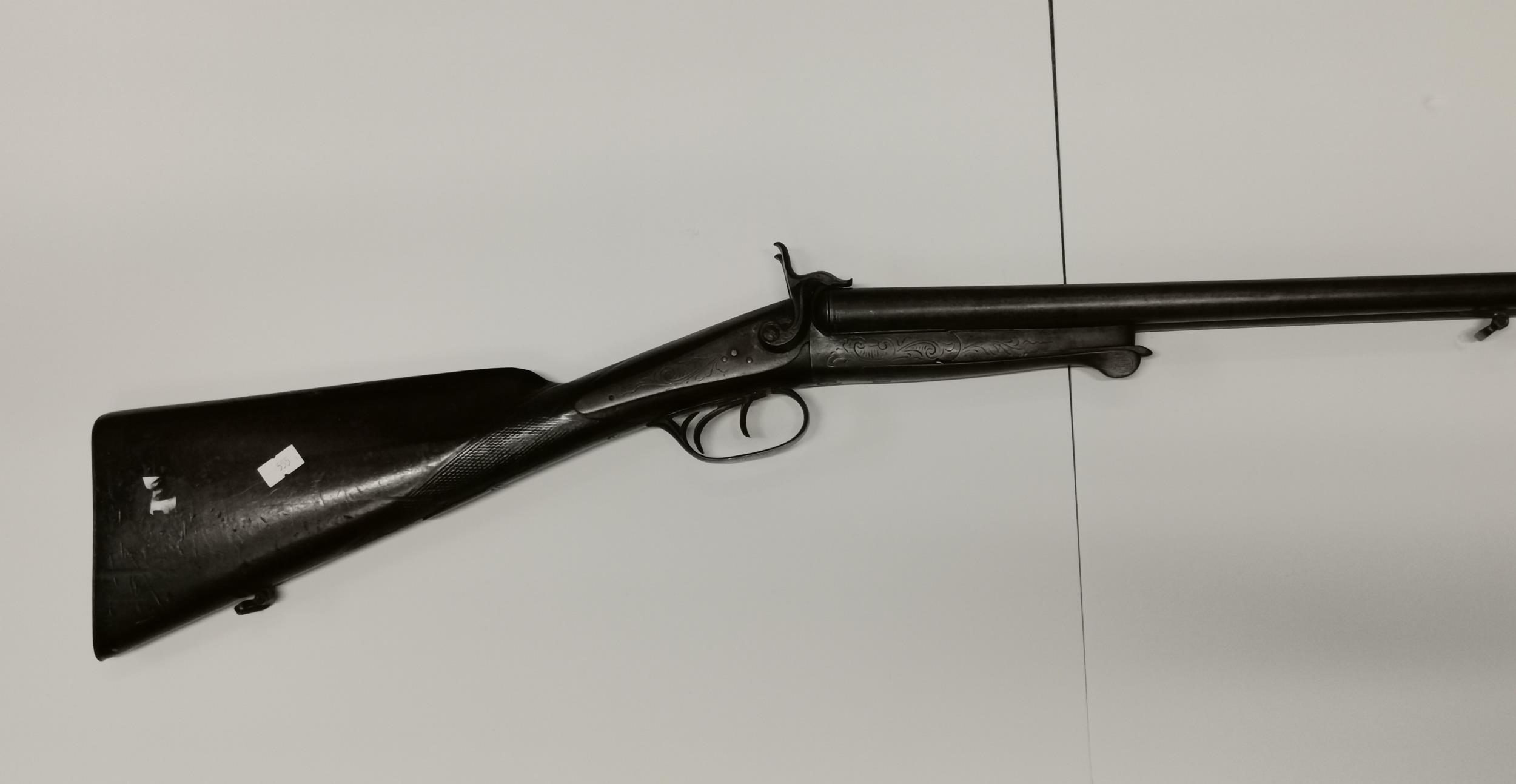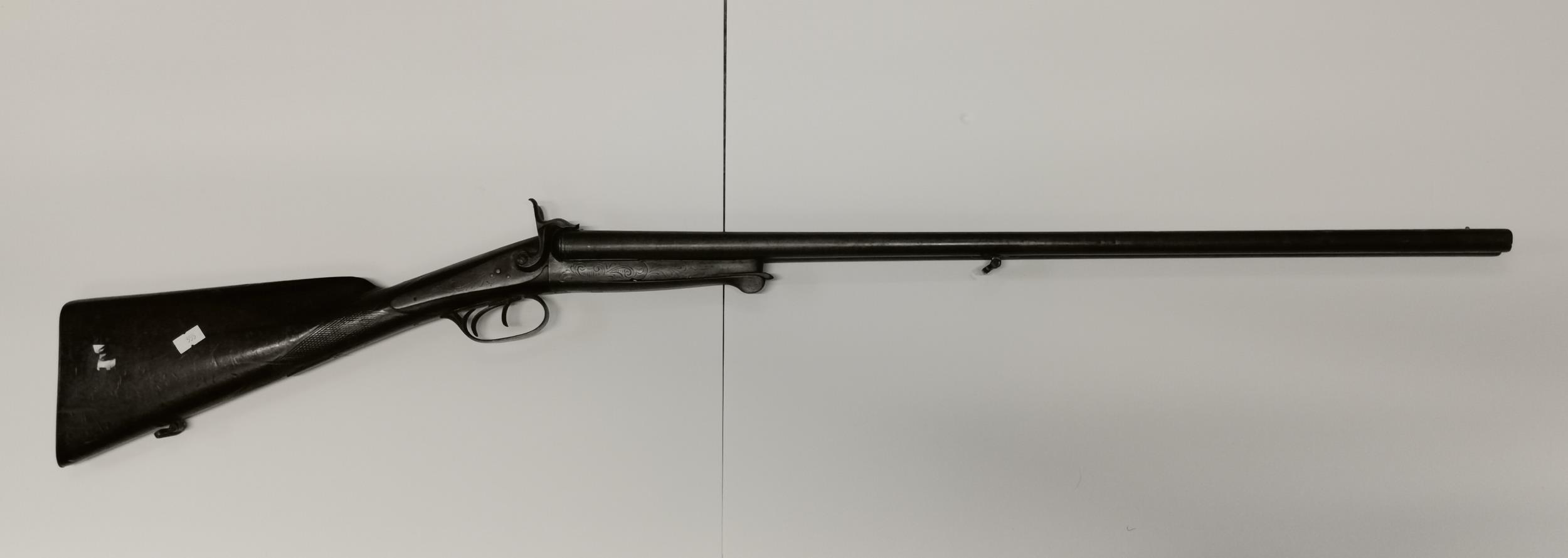A late 19th Century Spanish pinfire double-barrelled side-by-side under-lever sporting gun, the 28¾" (73cm) browned barrels signed Bartolomé Aretio, Vitoria to the top rib, with stamped proof marks and numbers, bead fore-sight, foliate-engraved steel lock plates and trigger guard, walnut stock with chequered grip, iron swivels for sling, and iron heel plate. 111cm long overall