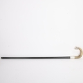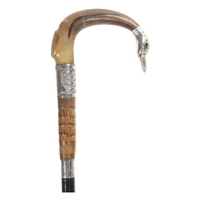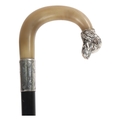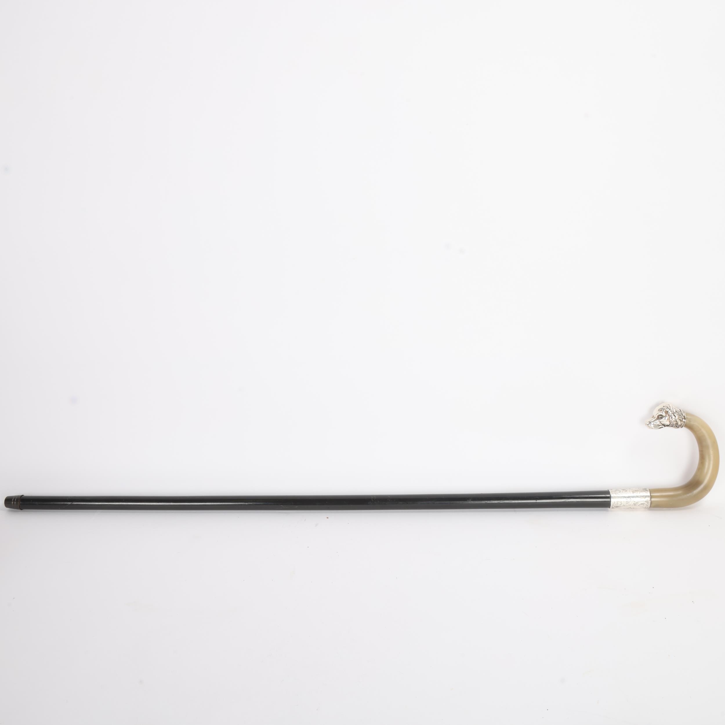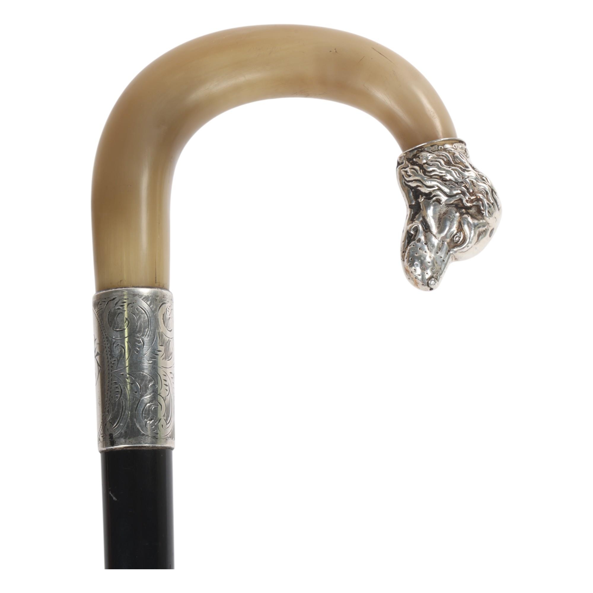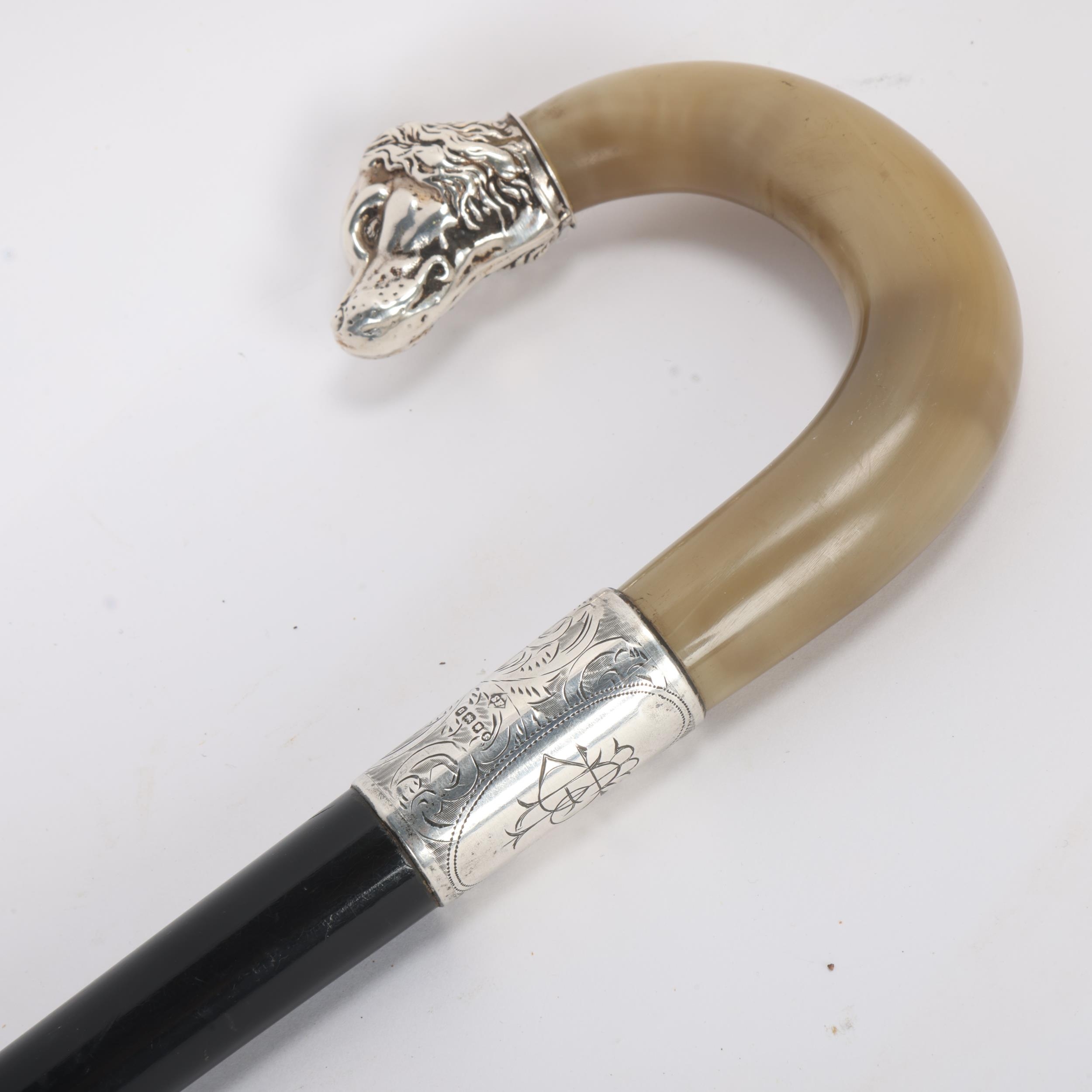 A Victorian horn and silver mounted dog's head walking cane, with engraved collar, hallmarked 1867 S.F., with solid Ebony shaft, length 91cm