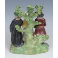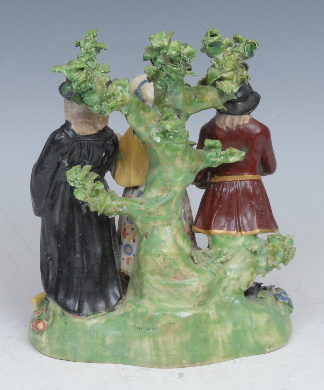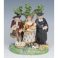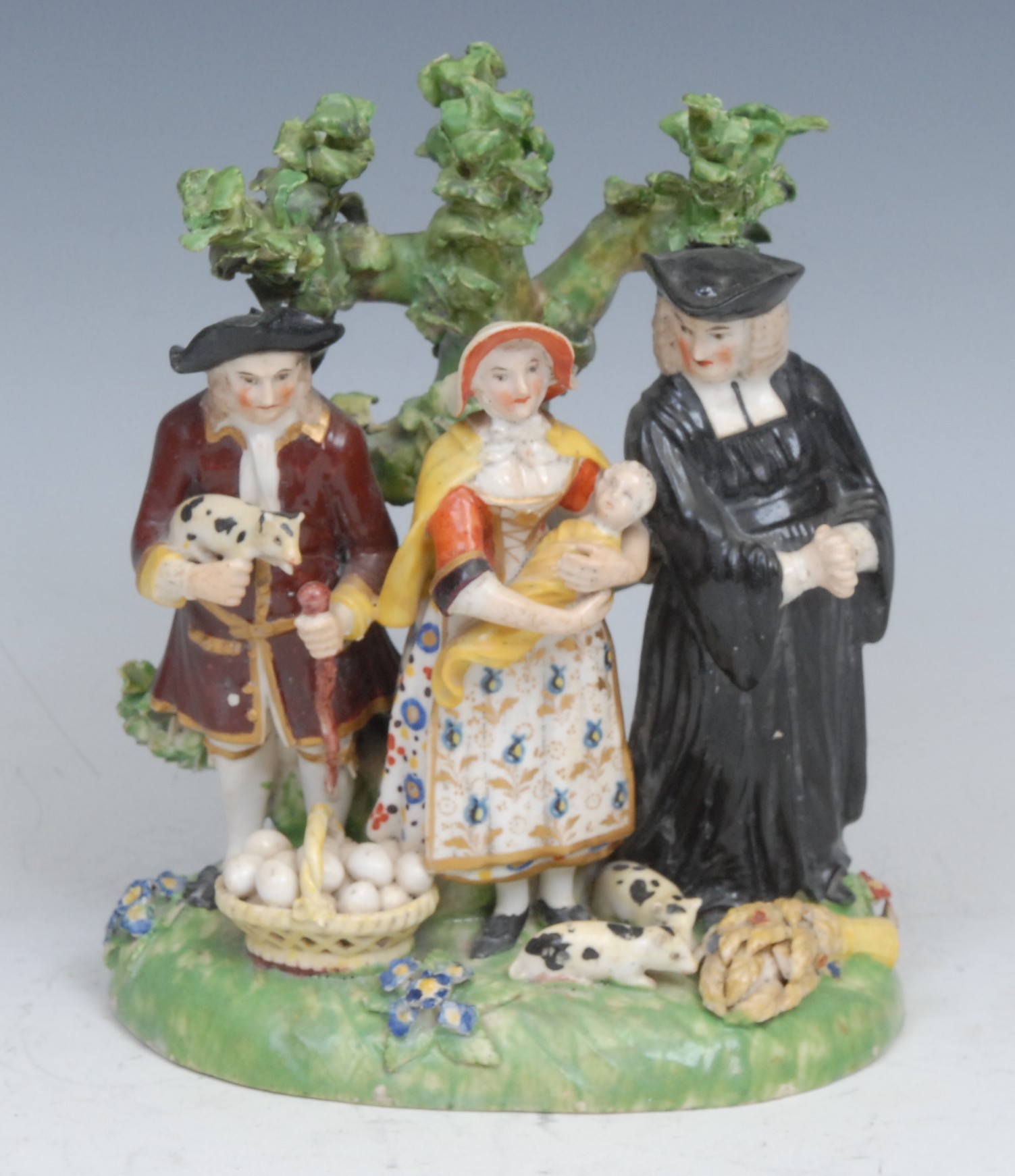A Derby porcelain Tythe Pig group, with a farmer, his wife and a clergyman with basket of eggs, piglets, and sheaf of corn at feet, standing before a tree on an oval grassy base, early 19th century, 15cm high