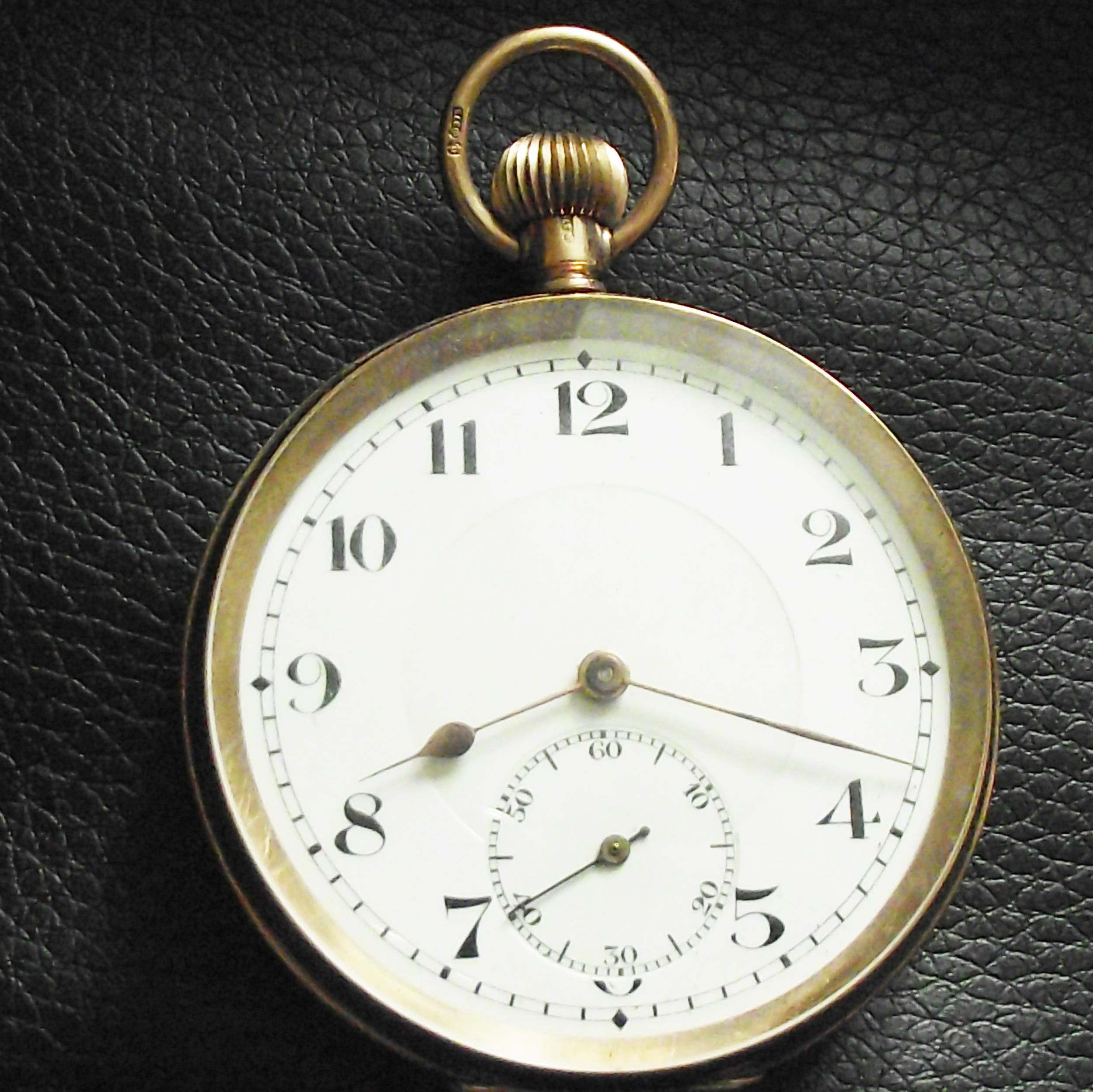 Swiss made 9ct gold pocket watch with enamel dial ,gold fingers ,subsidary seconds date letter 1879 ( working) 77.8g approx gross weight