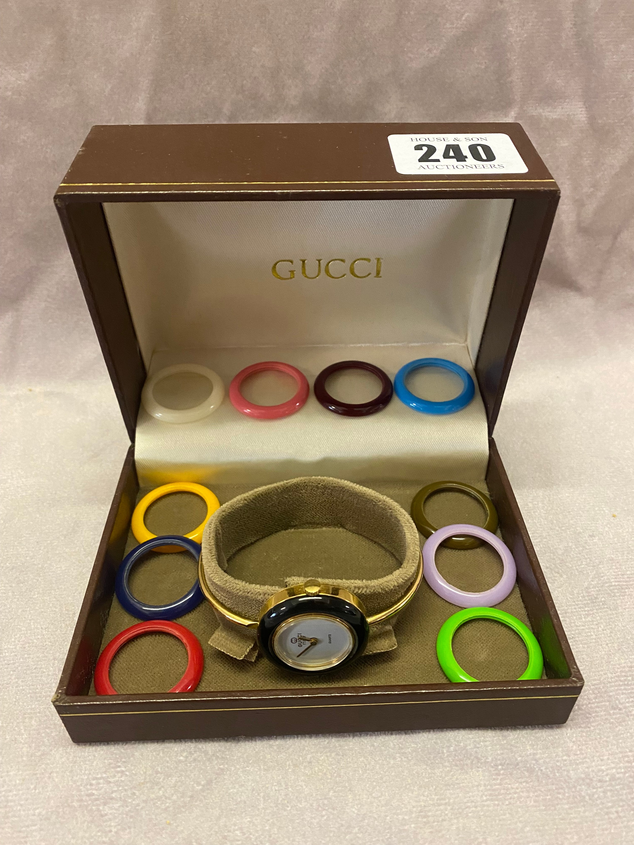 A Gucci gold plated bangle watch with interchangeable coloured bezels, boxed