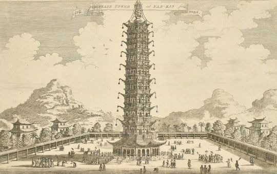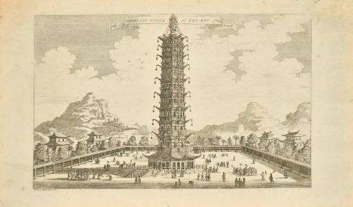 Johan Nieuhof - Etching of Porcelain Tower, China 1759. This antique etching by G Child of the Porcelain Tower at Nan Kin was originally drawn by Johan Nieuhof (1618-1672) 1747. The etching is from The Universal Traveller: Or, A Compleat Description Of the Several Nations of the World by Mr. Salmon, printed for Richard Baldwin, London, 1759.
