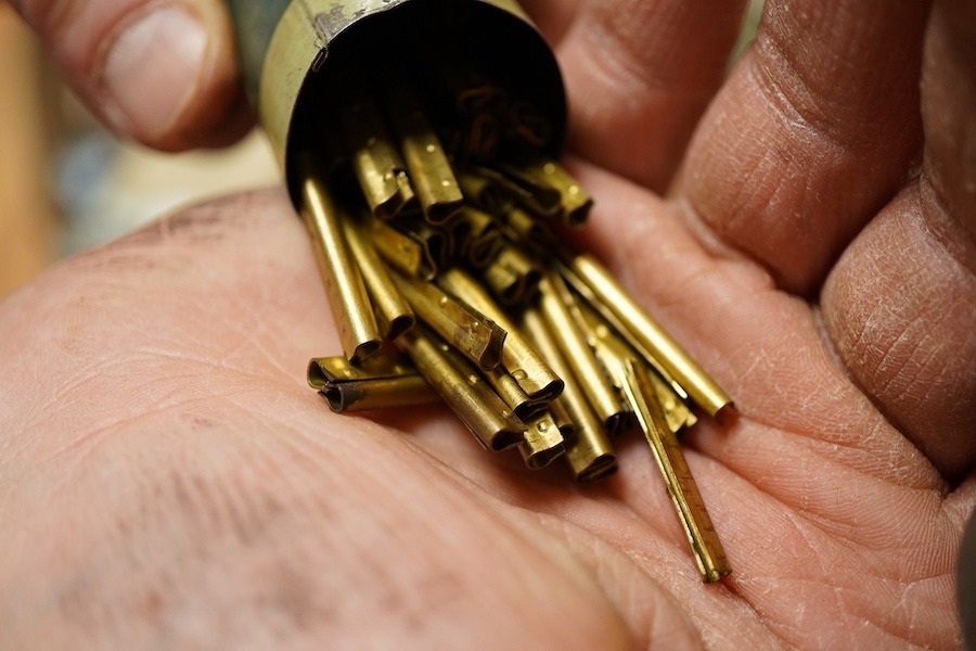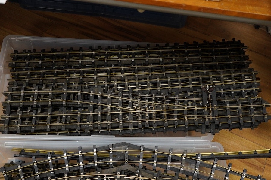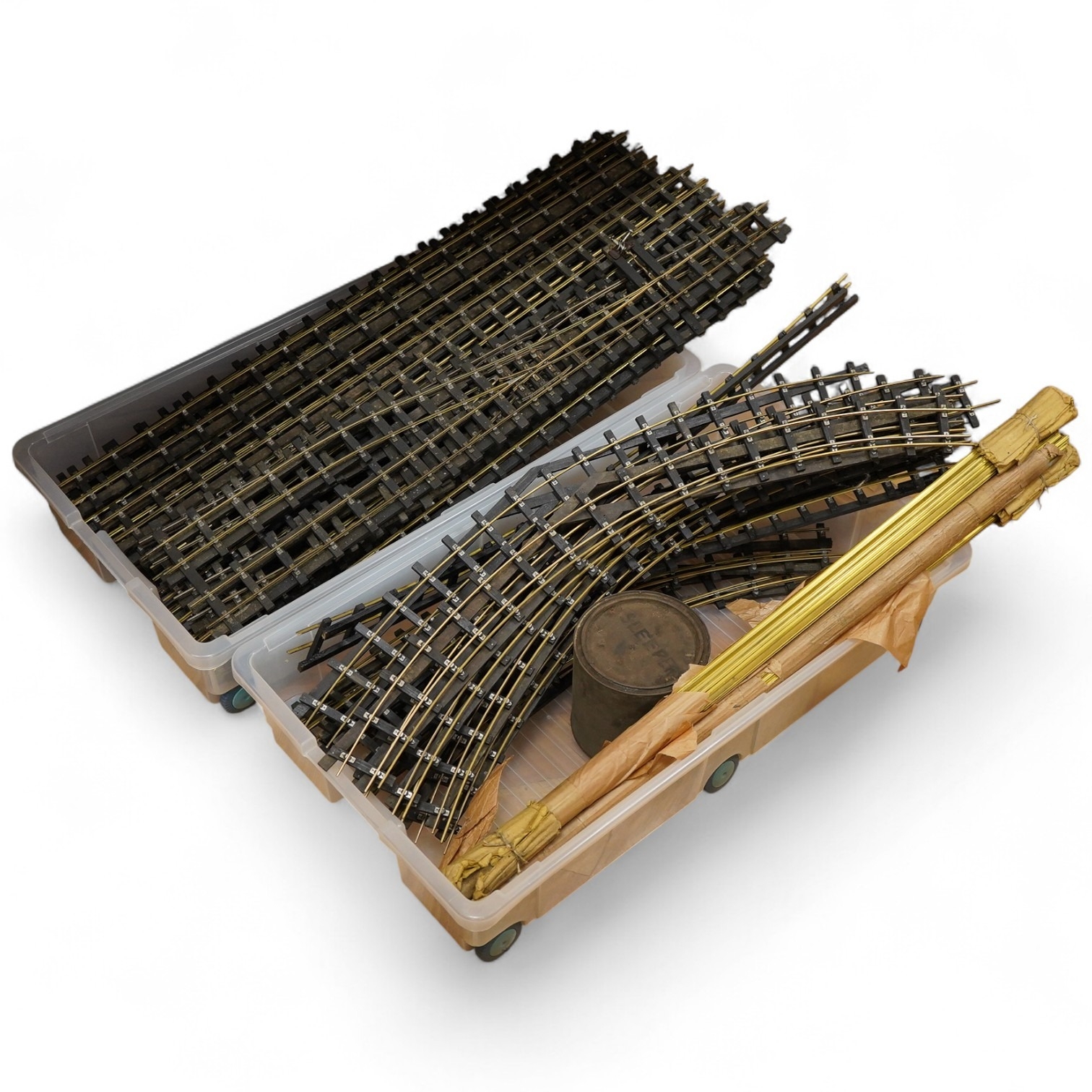 A quantity of Bassett-Lowke track sections, original rail joiners, together with three packets of additional brass flat bottom rail not mounted on sleepers, etc.