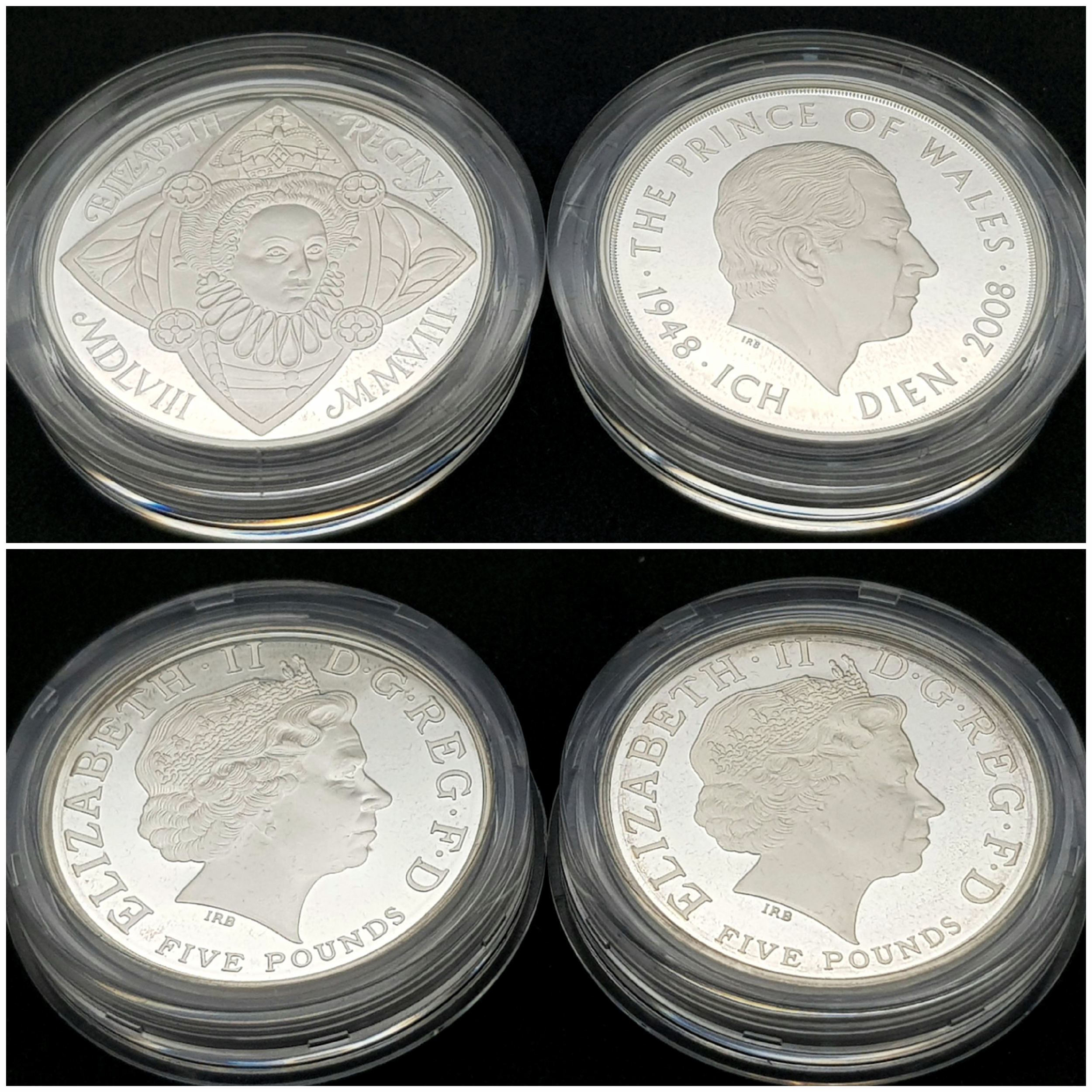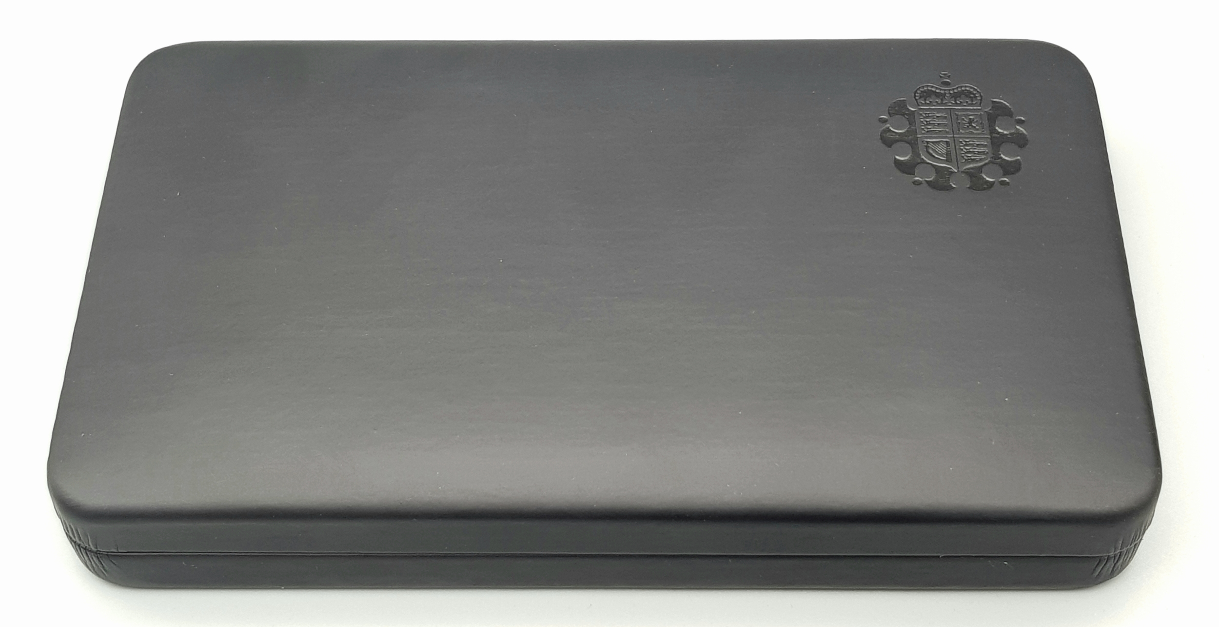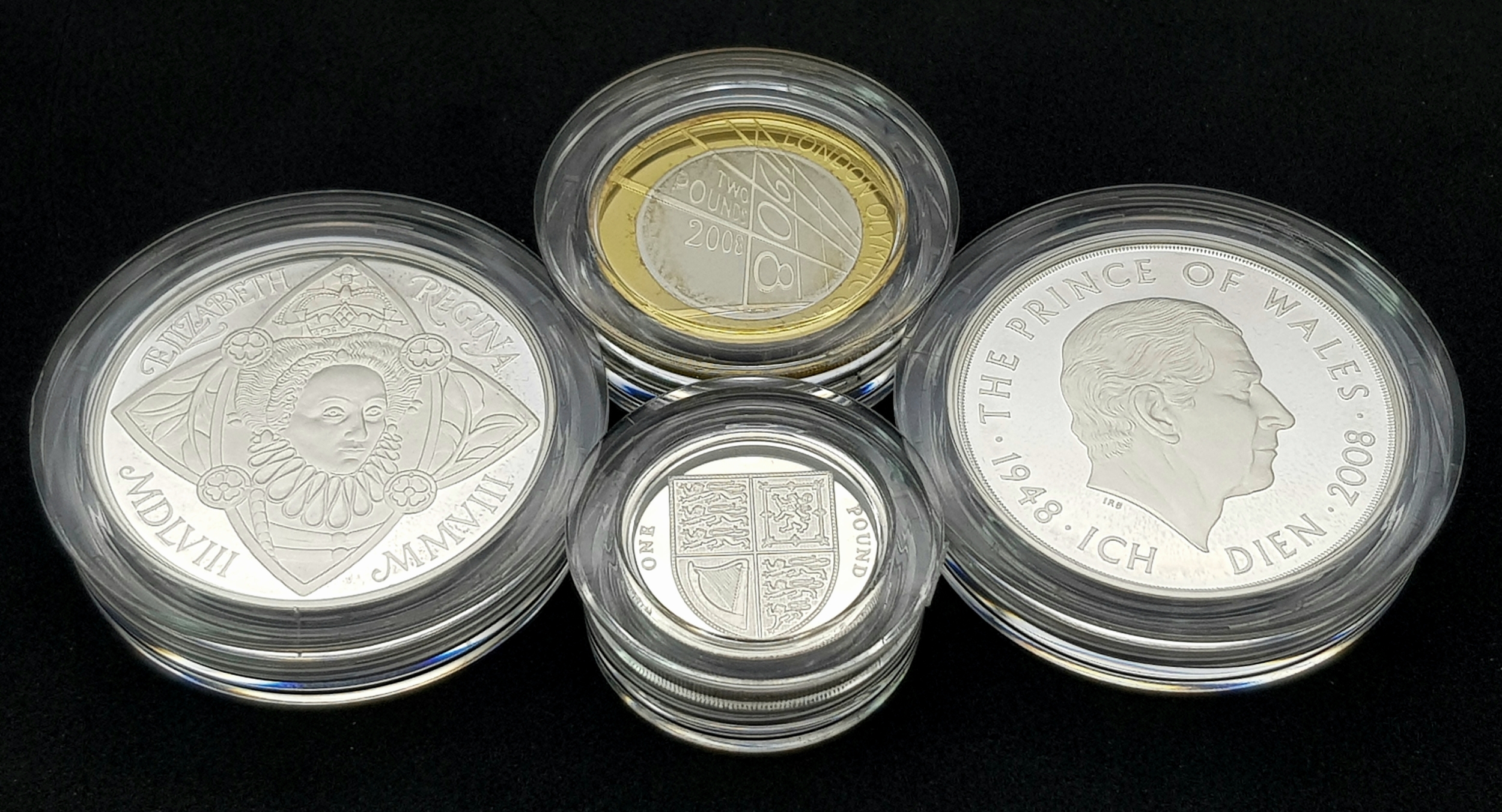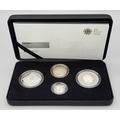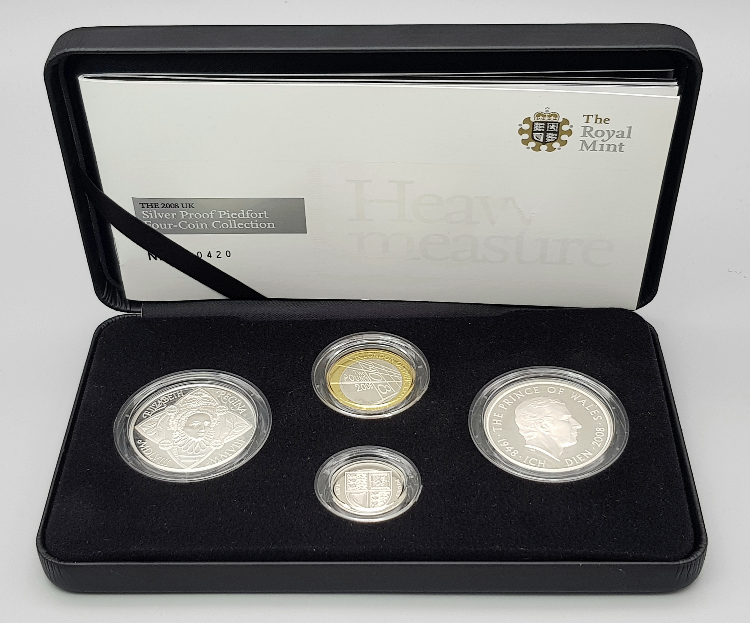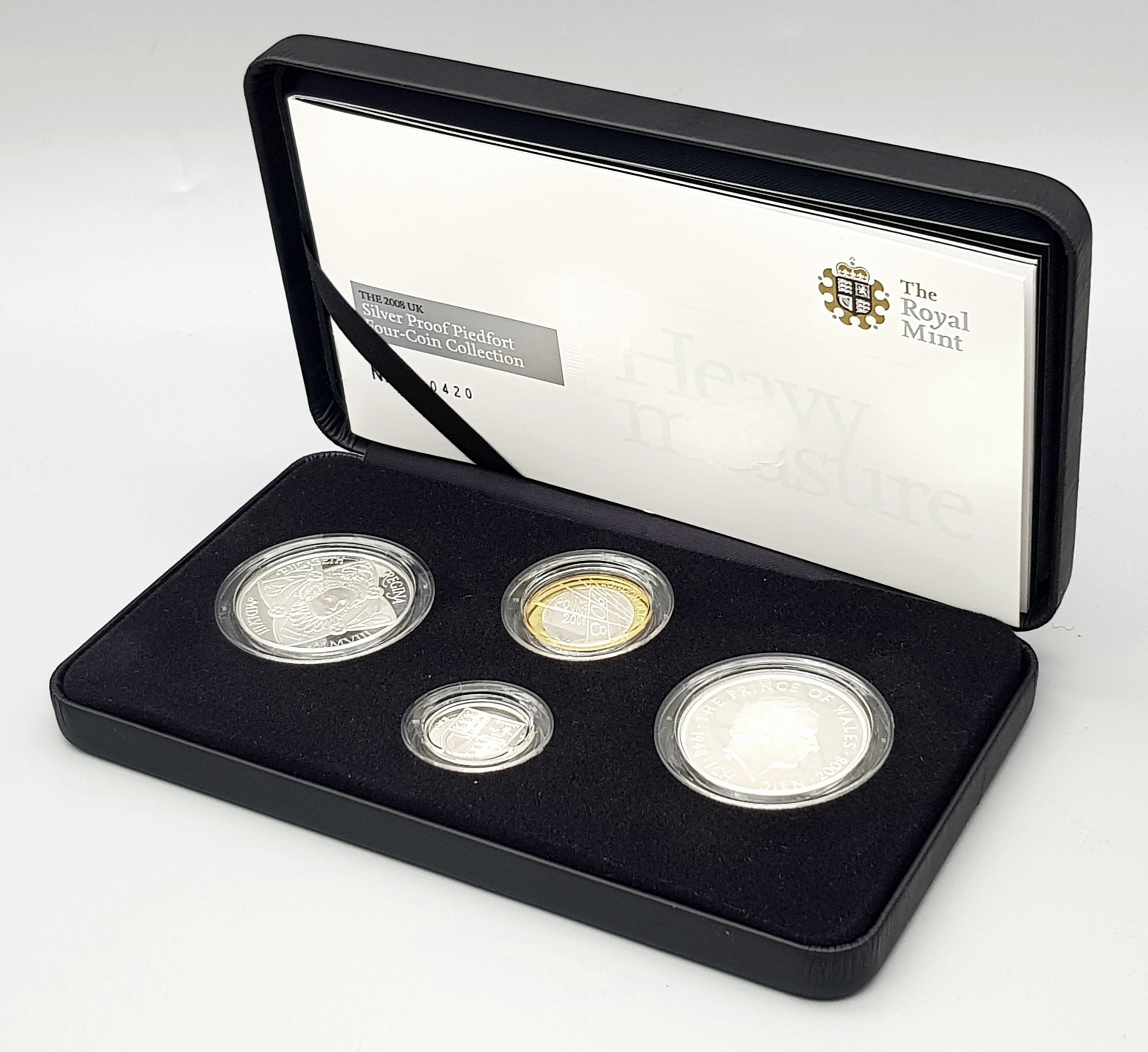 A Royal Mint Silver Proof Piedfort Four-Coin Collection. Elizabeth I £5 - 56.56g, Prince Charles - £5 - 56.56g, London Olympics - £2 - 24g, Royal Arms - £1 - 19g. Total weight - 156g. Limited edition - 0420 of 3000. Comes with a certificate of authenticity and presentation case. In excellent condition. A wonderful coin collectible or gift to hand down to loved ones.