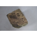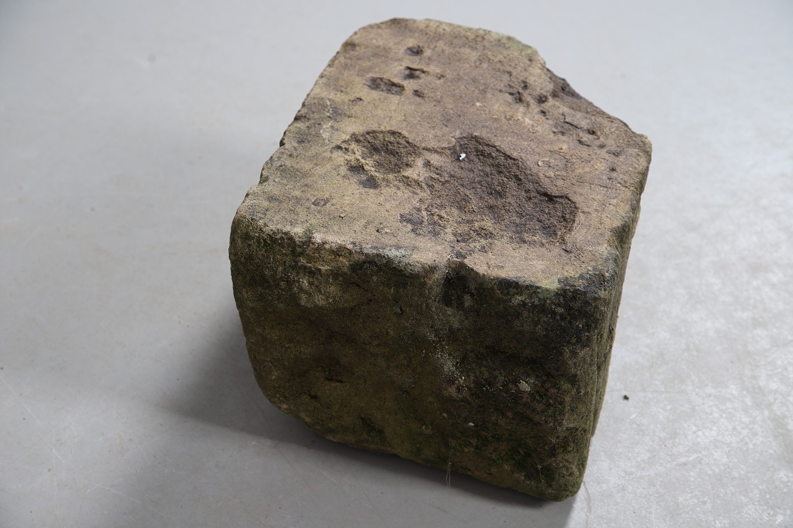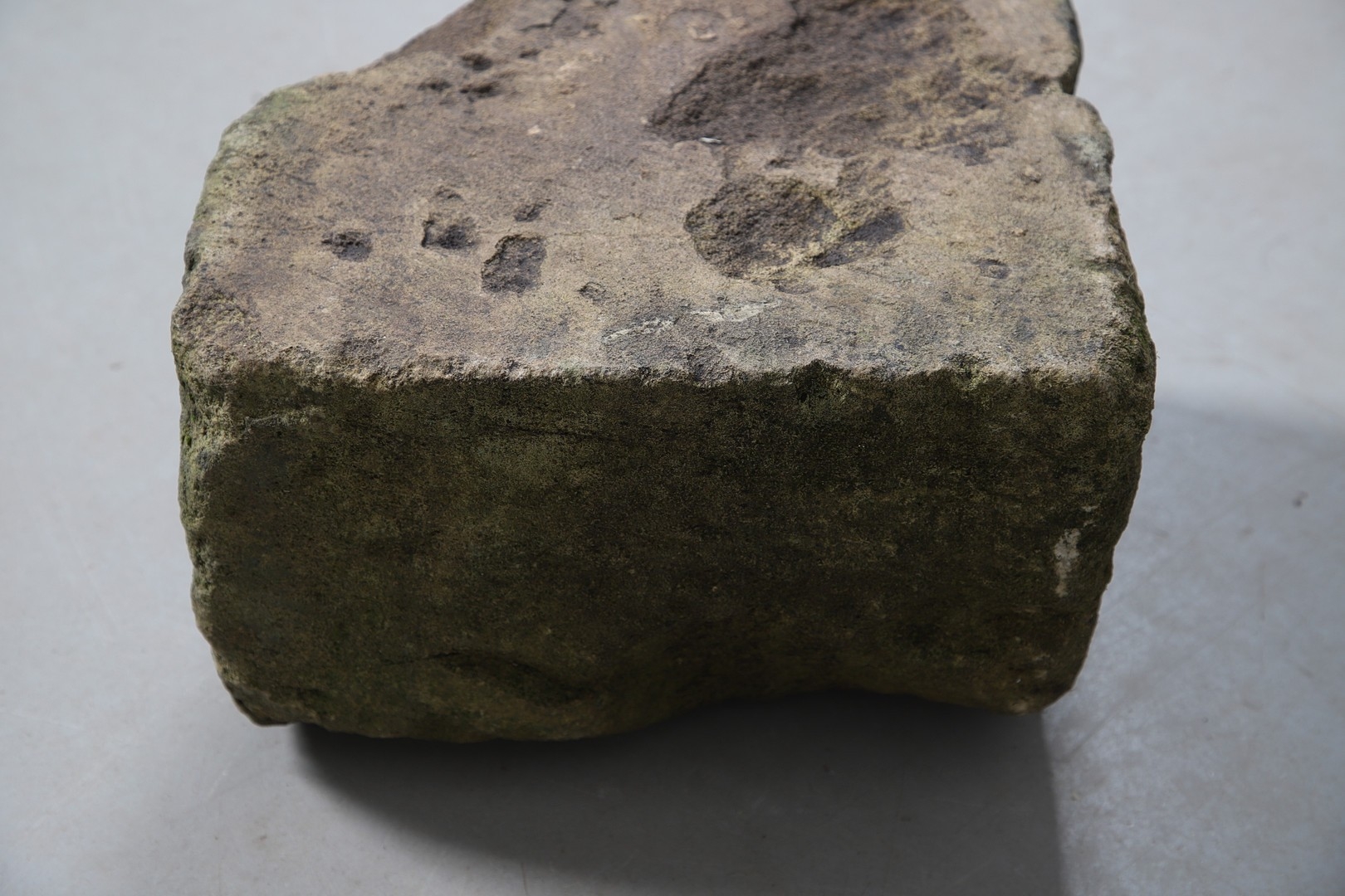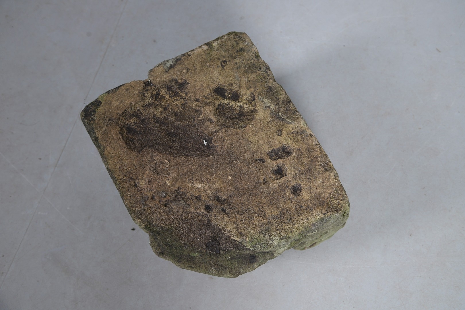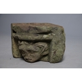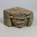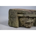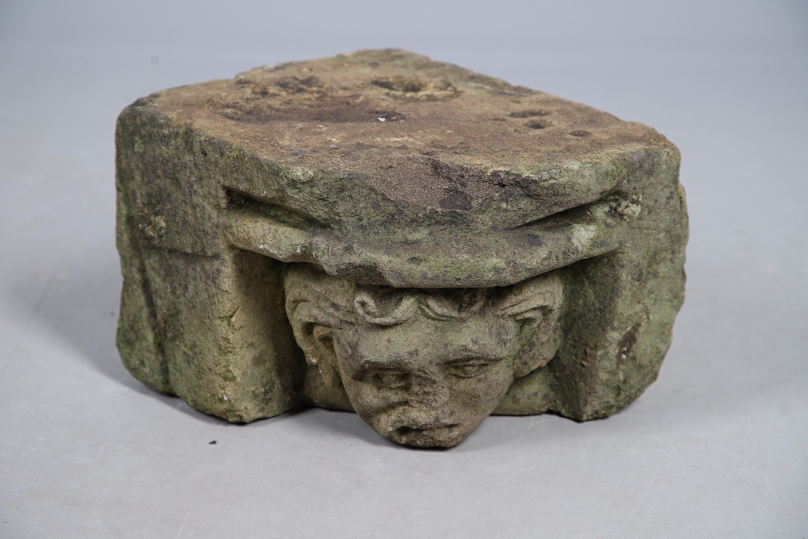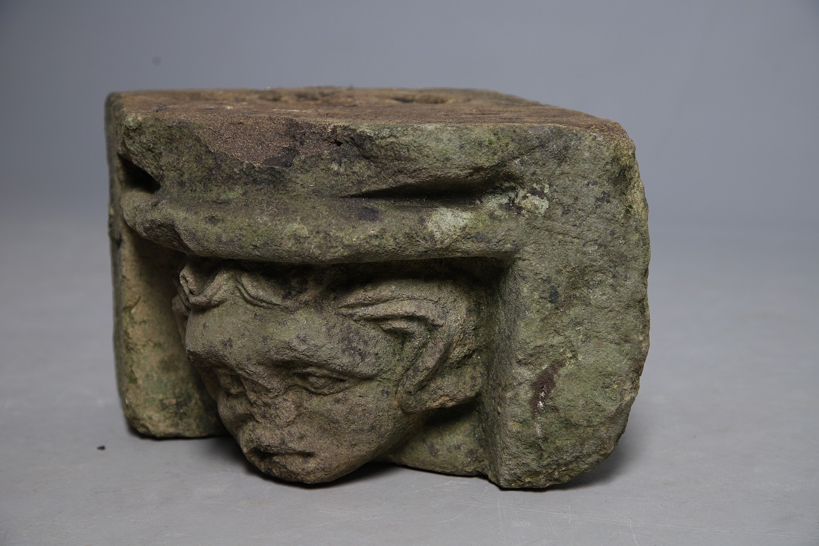 A MEDIEVAL STONE CORBEL. possibly 15th century, carved with a head of a curly haired man, height 22cm, width 33cm, depth 28cm.