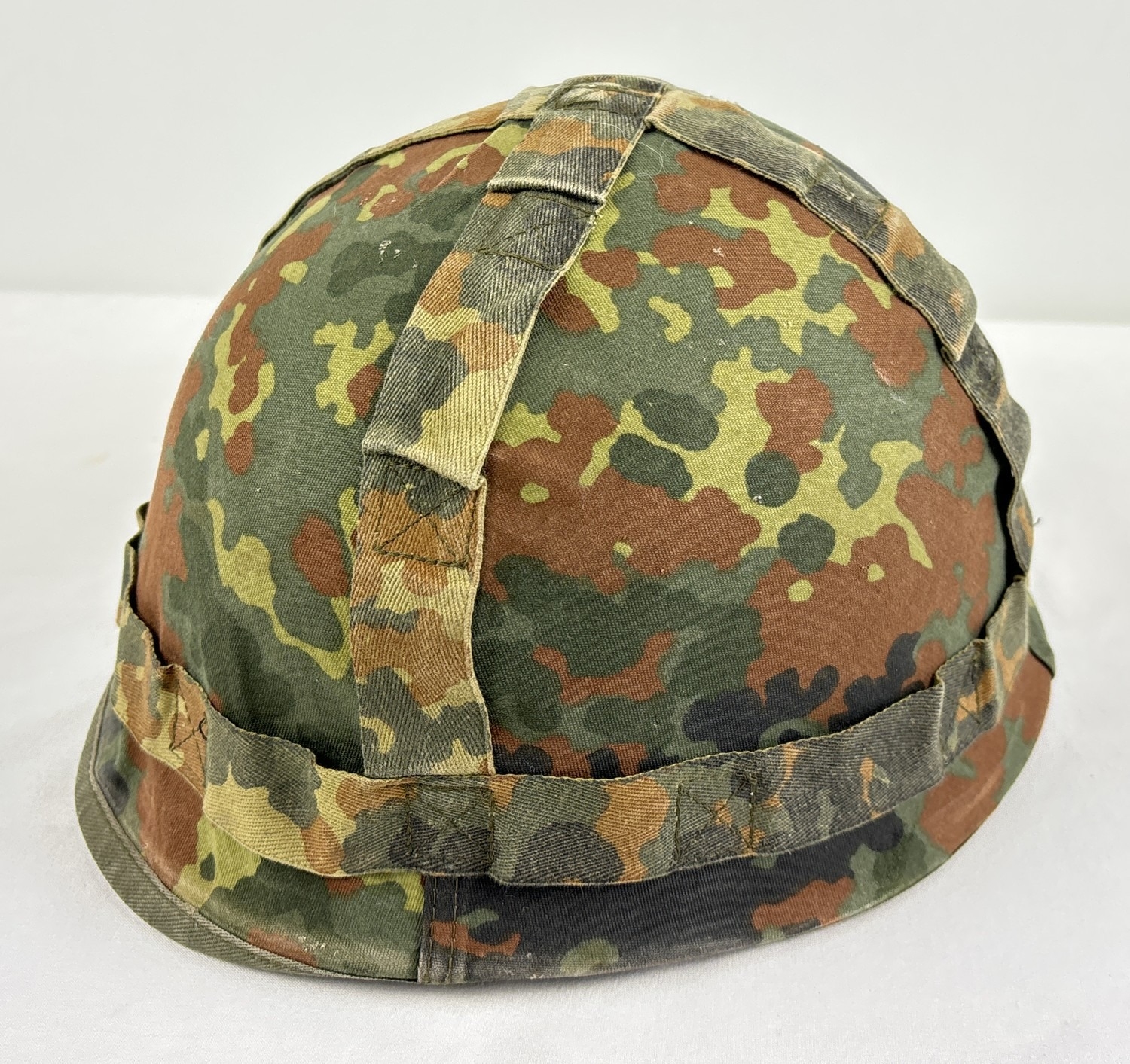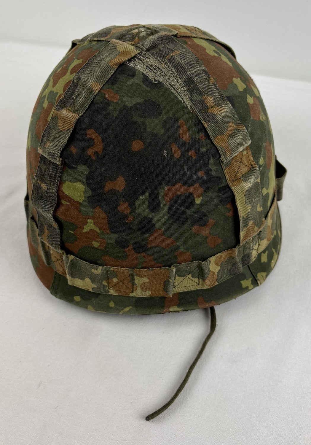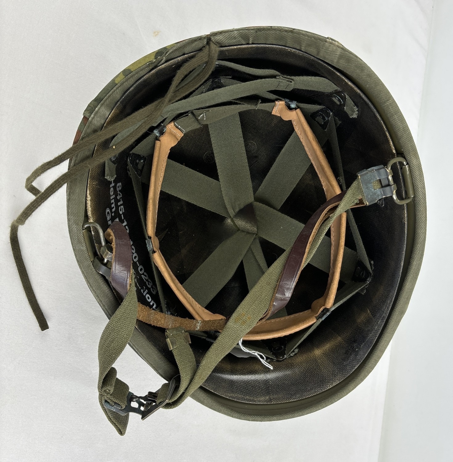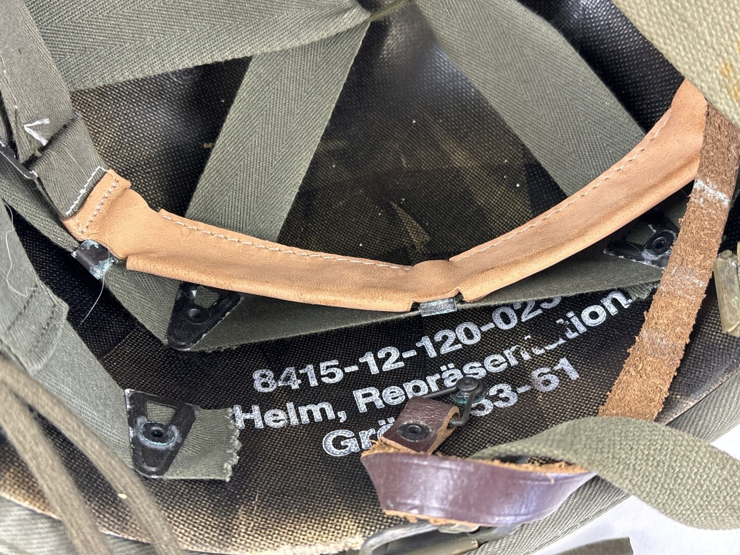 Danish-made M56 US M1 - clone Cold War era West German steel helmet with rare glossy blue Parade liner (“Helm, Representation”) used by troops of the Guard Battalion of the Ministry of Defence. Liner made by Schubert Helm, Braunschweig 1991. Size 53-61. Body painted olive green. With camouflage cover.