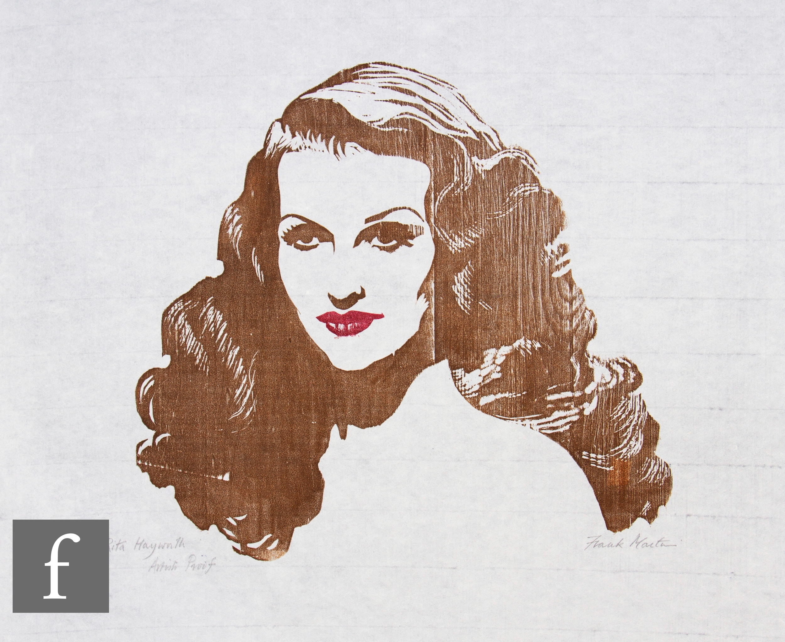 Frank Martin (1921-2005) - 'Rita Hayworth', woodcut print, signed and titled in pencil, artist's proof, unframed, 46cm x 63cm.