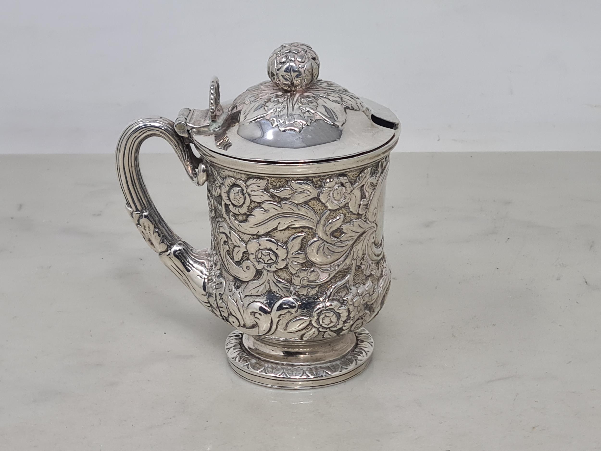 A Georgian Scottish silver Mustard Pot with floral embossing on pedestal base, Glasgow Hallmarks, maker: R.G & S