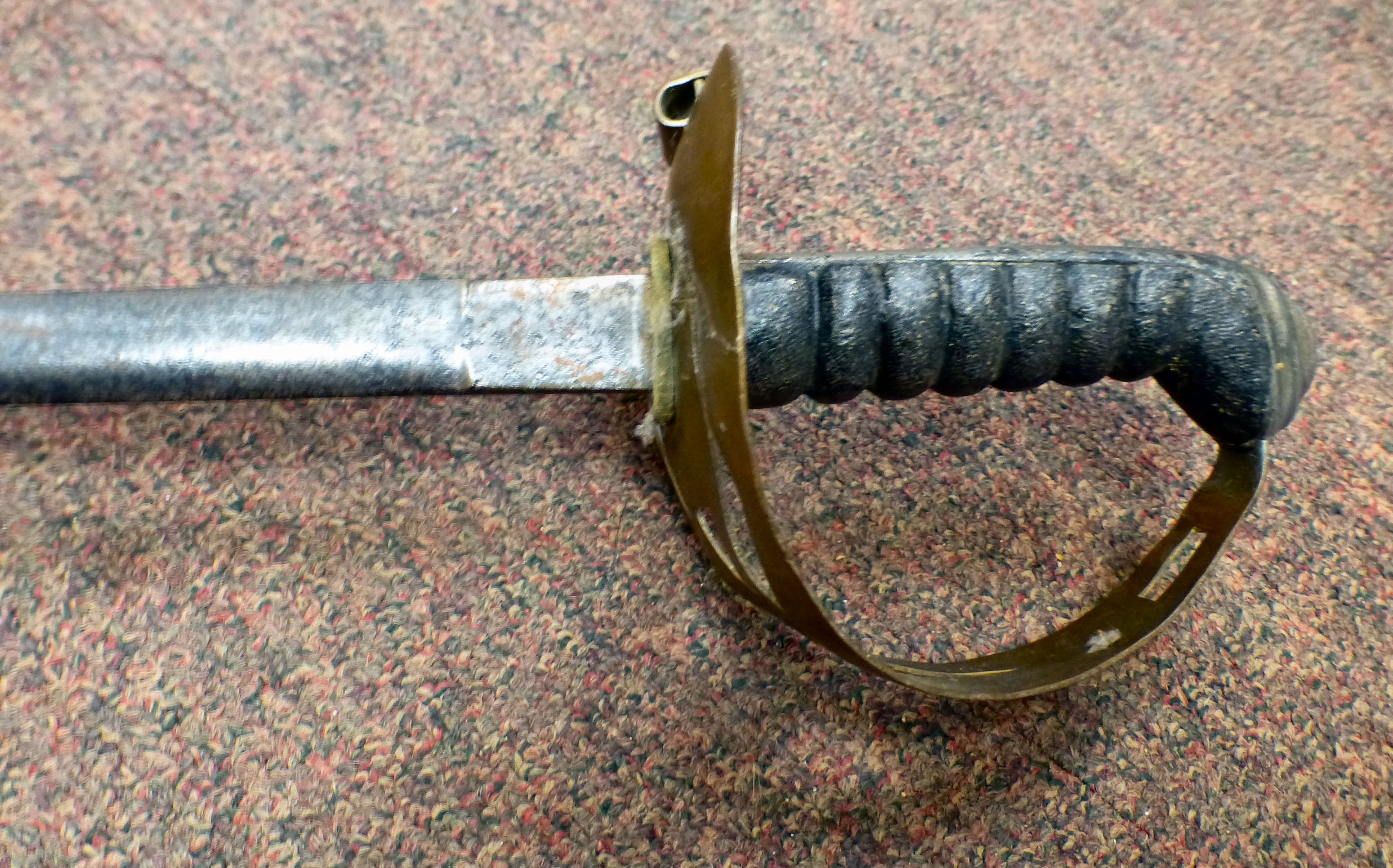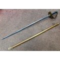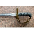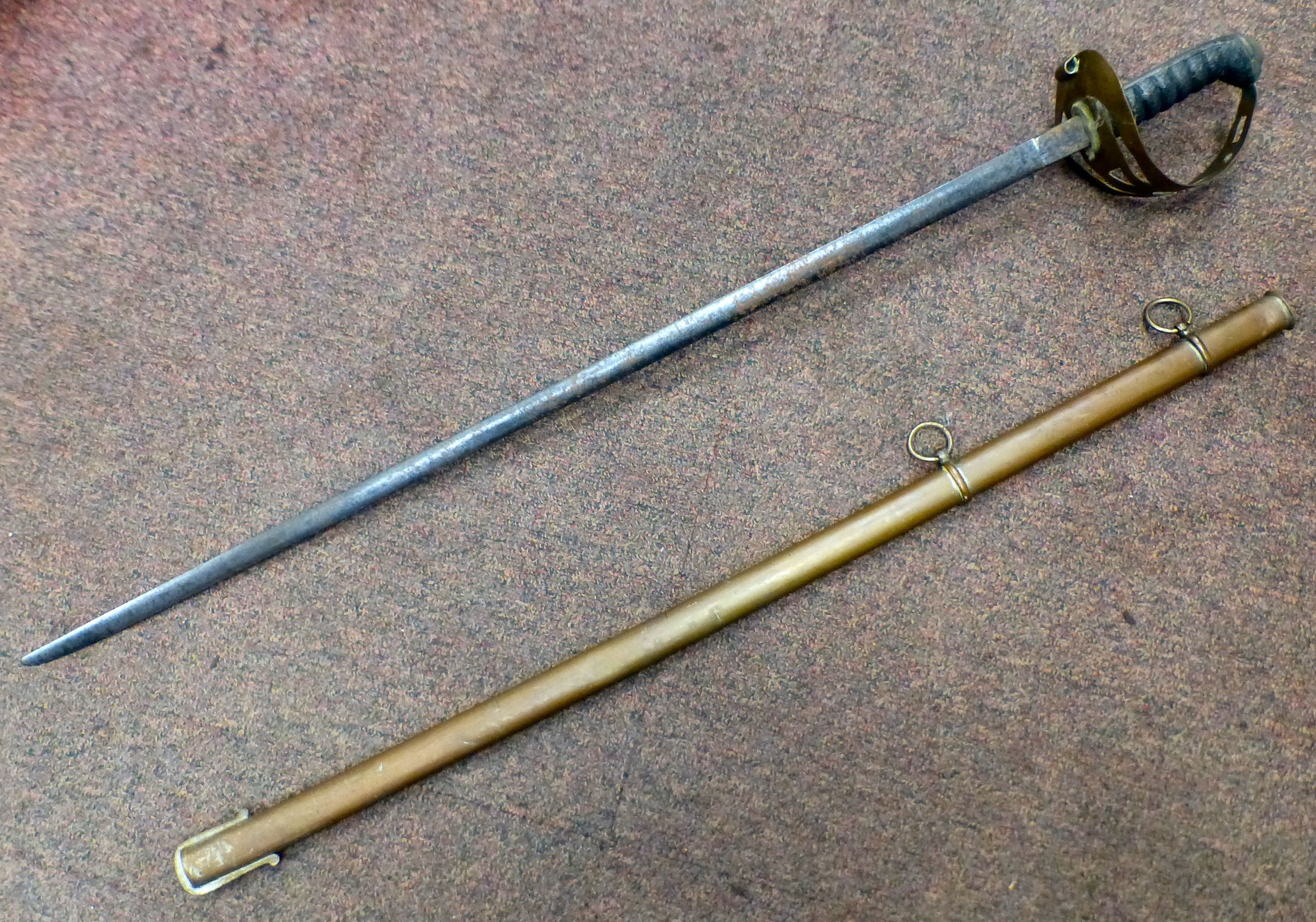 A late 19thC infantry sword with a ribbed handgrip the blade 30"L in a metal scabbard