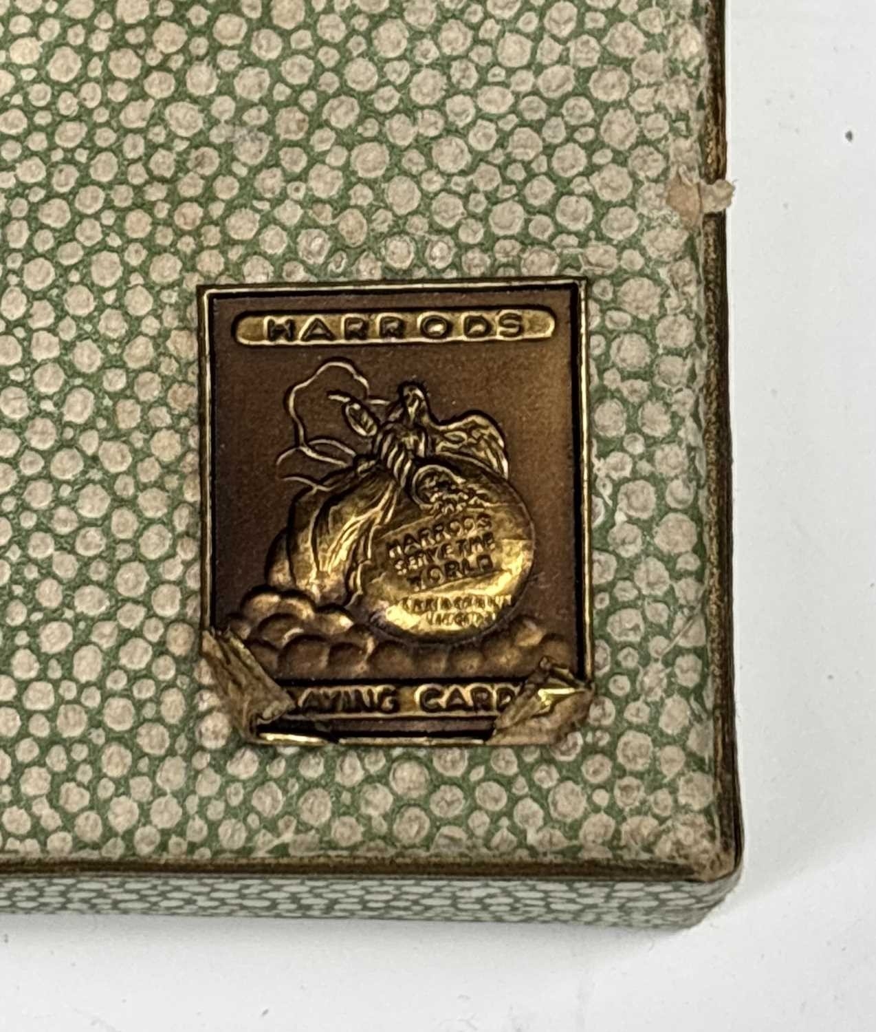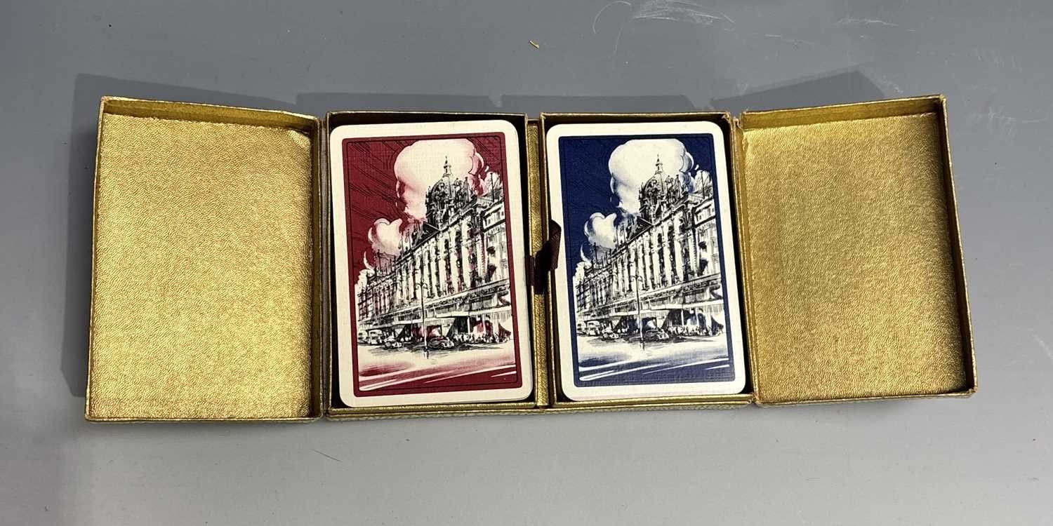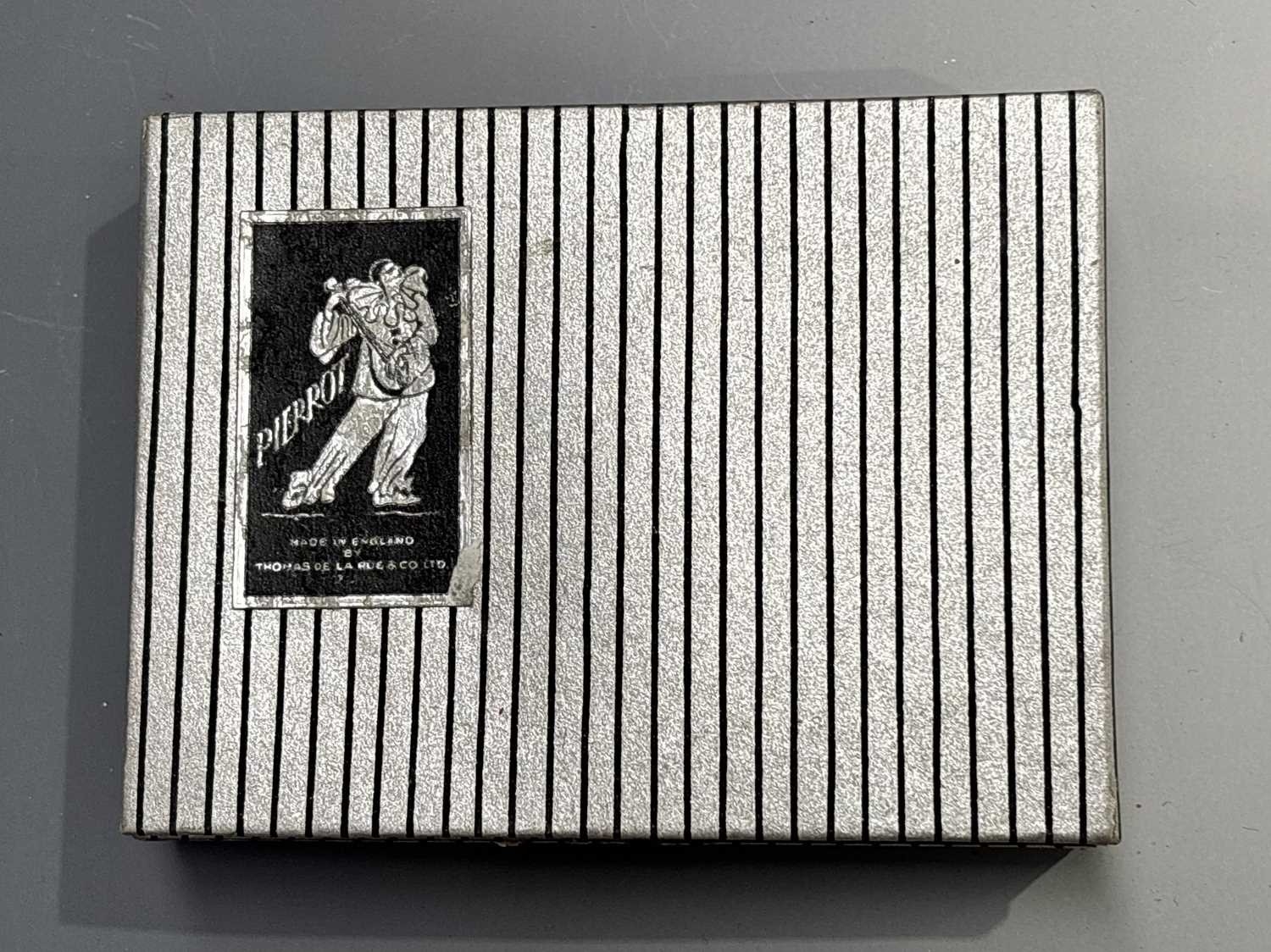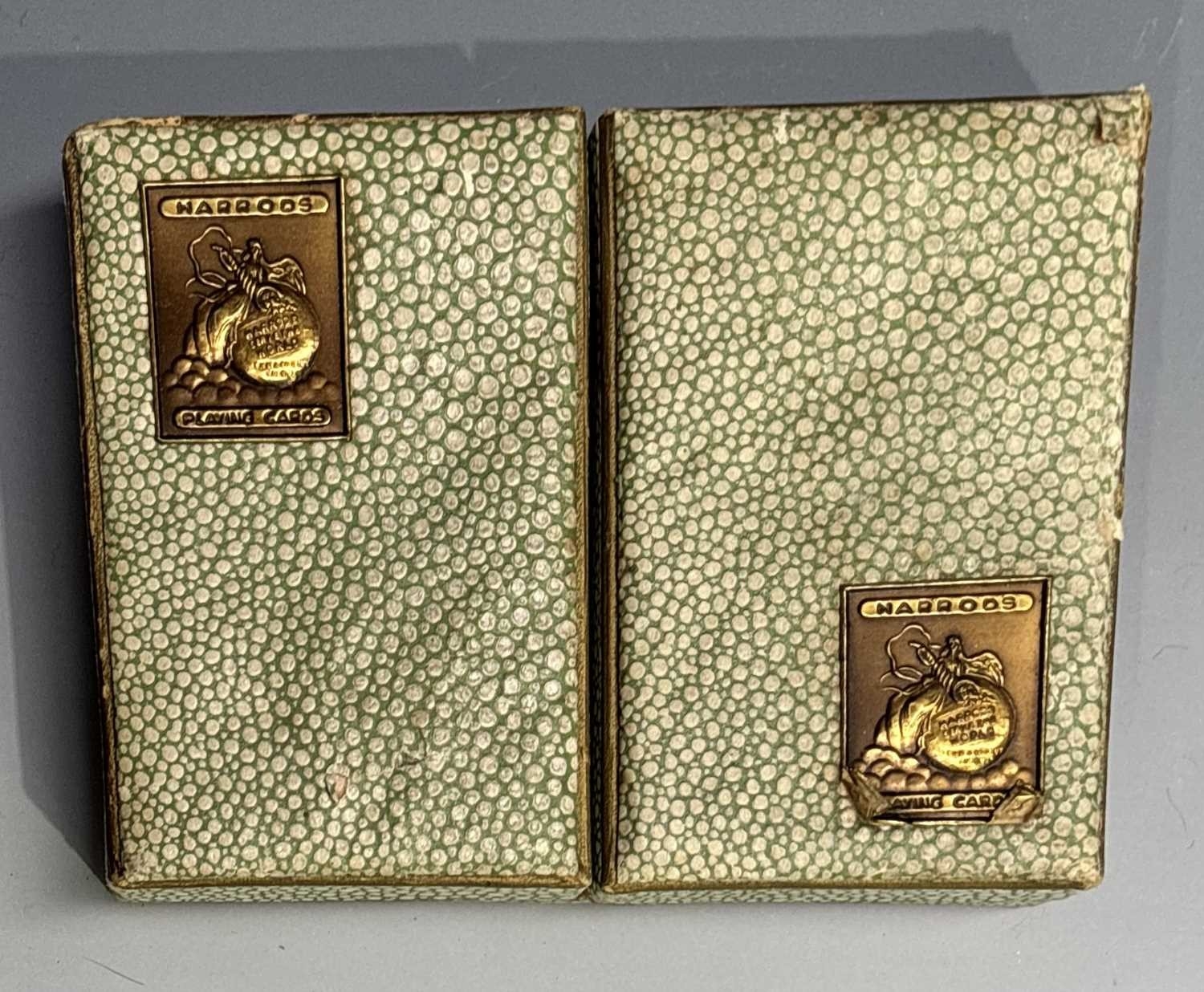 A collection of playing cards, most unused, Thomas de la Rue 'Pierrot' cased set with sample card, backed with Venetian scenes, a set in a green shagreen-effect case retailed by Harrods, also a Parker black hardstone pen holder and rest, w: 15cm, d: 9cm, h: 2cm, Mauchline ware, a Ysart-type millefiore paperweight etc. (1 tray) Provenance: from the collections of two prominent Anglo-Irish and British aristocratic families, directly descended from Lord Patrick James Stuart (1794- 1859), brother of John 2nd Marquess of Bute and great grandson of John Stuart, 3rd Earl of Bute (1713 -1792), Prime Minister to George III, resident at Cardiff Castle, Wales; Dumfries House, Scotland and Wilton Crescent, Belgravia, London