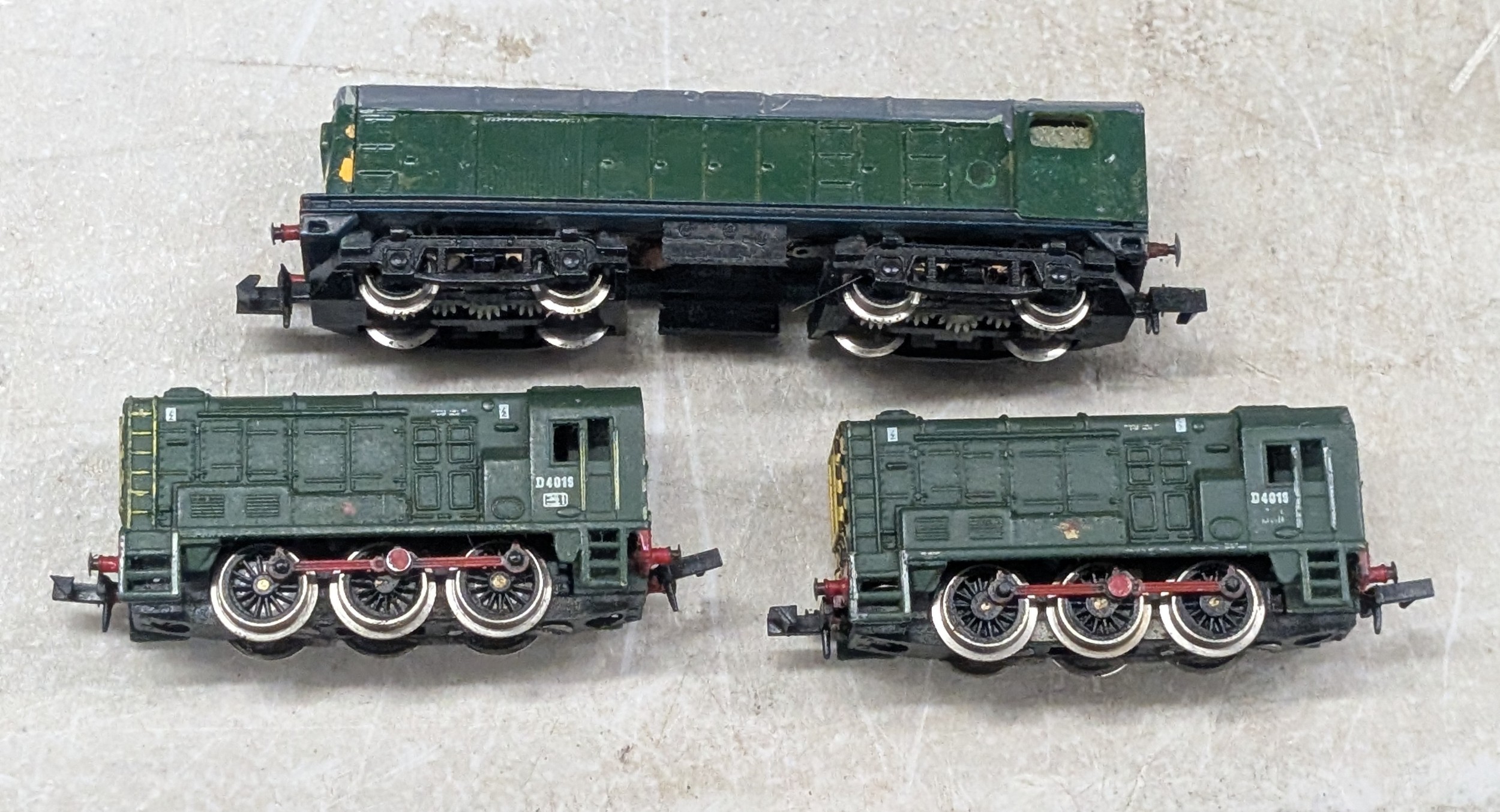 Three Grafar N Gauge Diesel Locomotives, comprising a Class 20 and two Class 08 Shunters