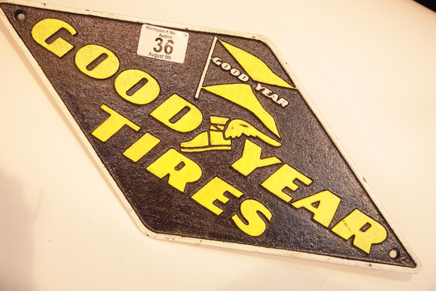 Cast iron Good Year Tires sign, 40 x 18 cm. P&P Group 2 (£18+VAT for the first lot and £2+VAT for subsequent lots)
