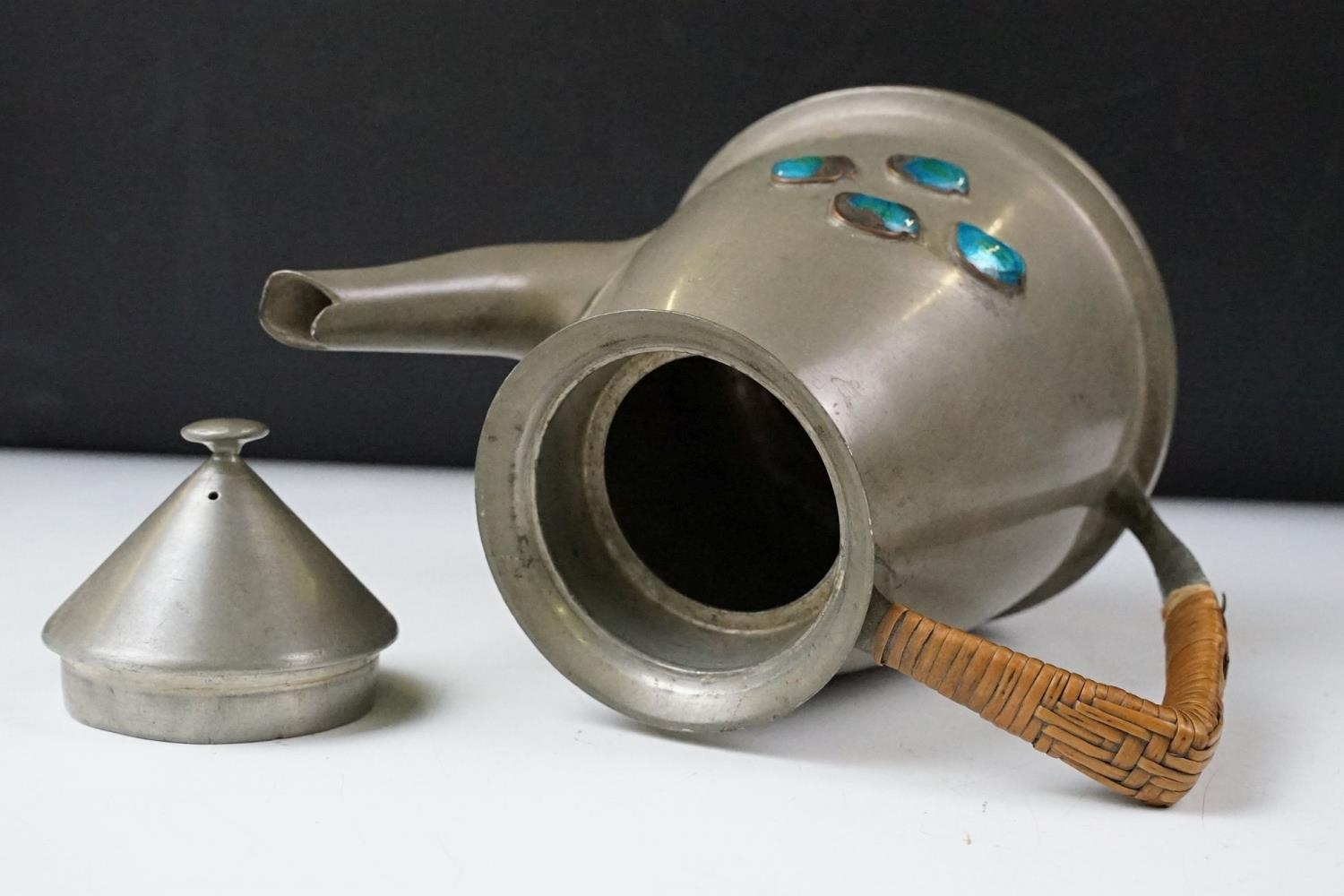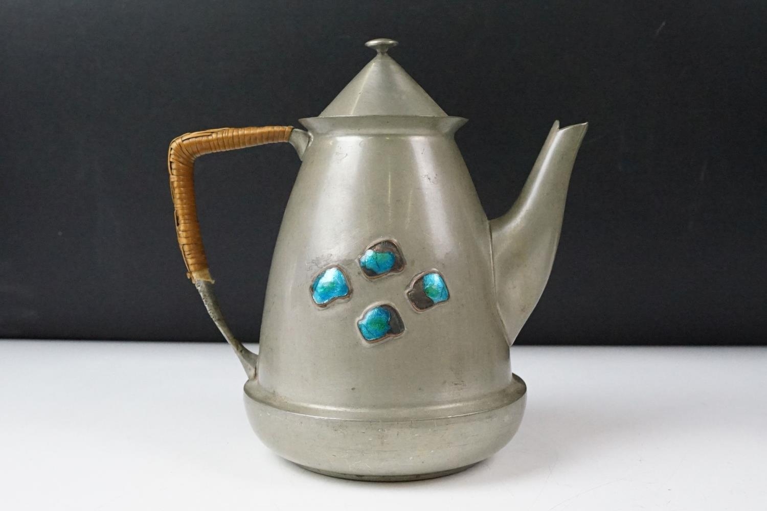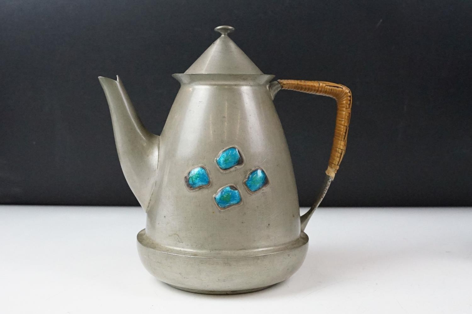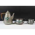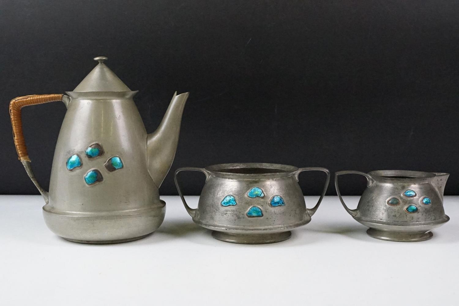An early twentieth century pewter tea set with peacock enamel decoration in the style of archibald knox.