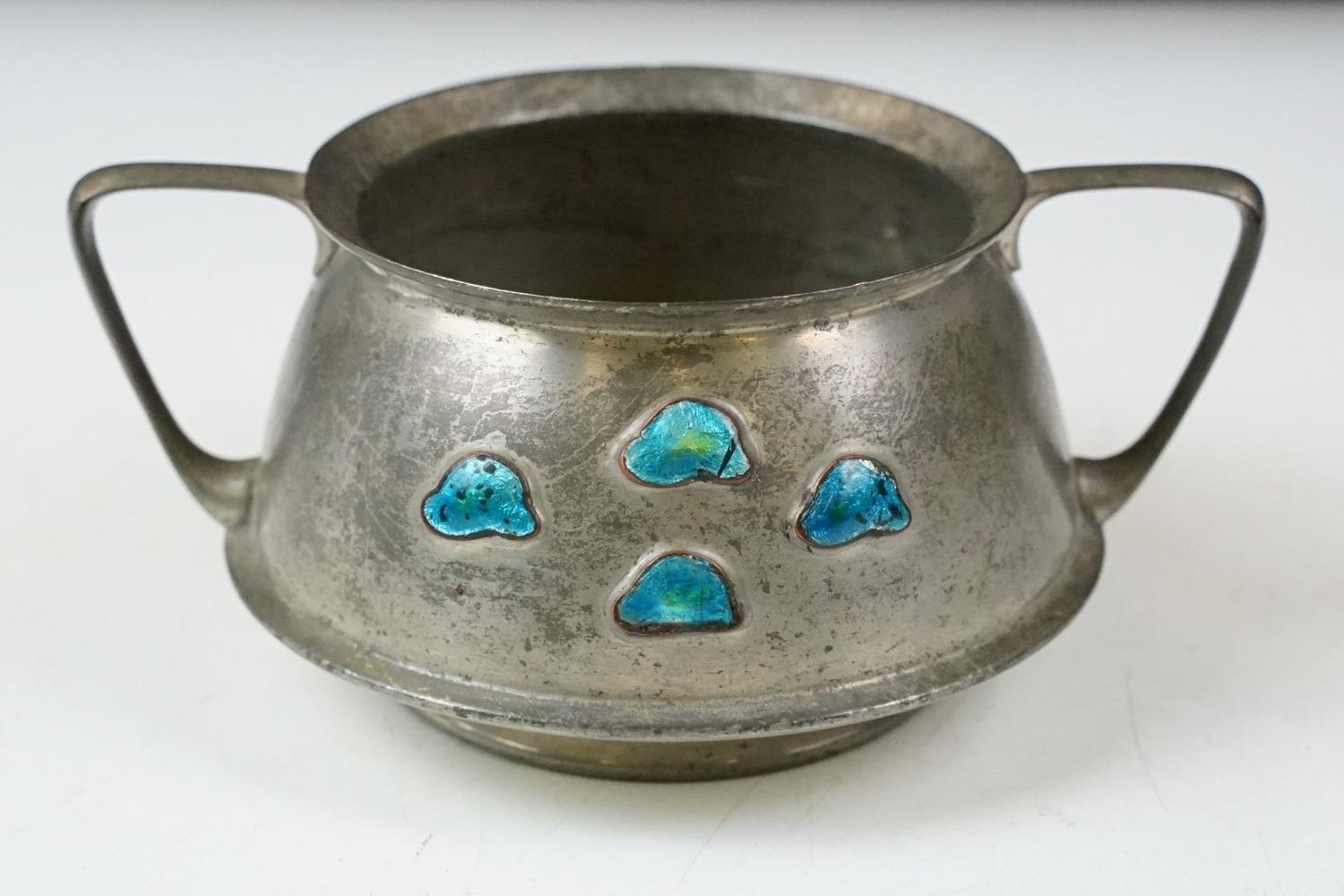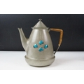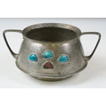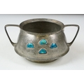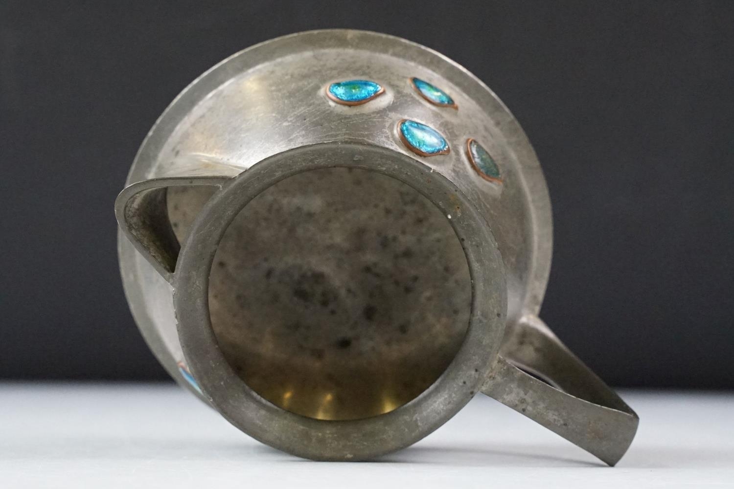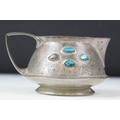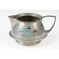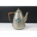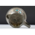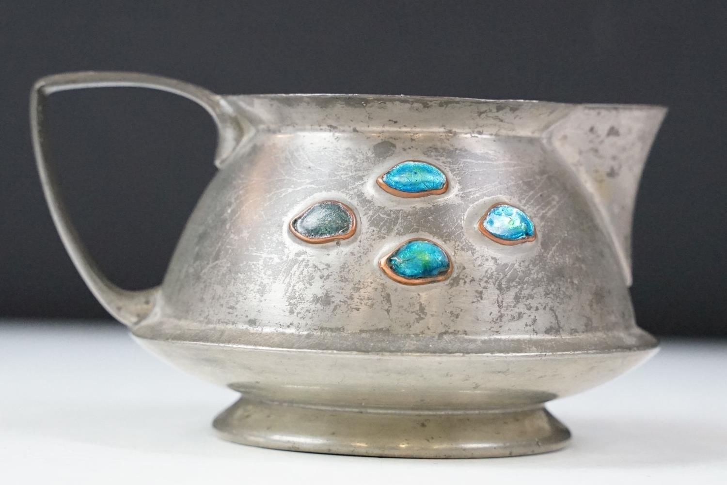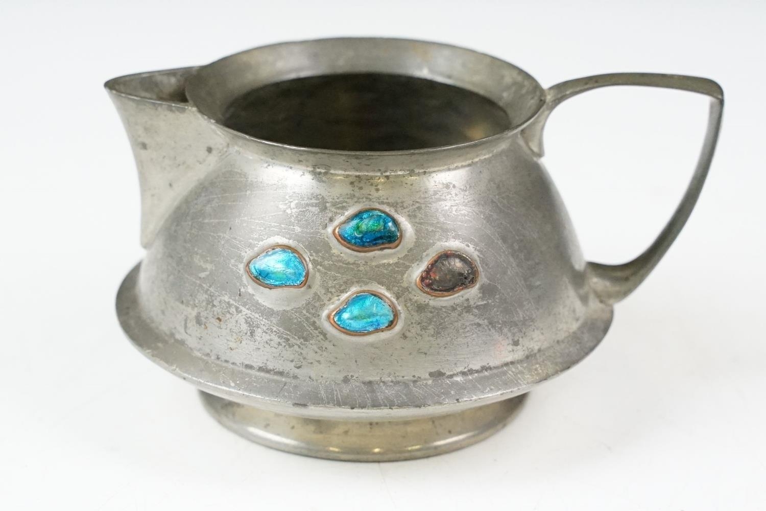 An early twentieth century pewter tea set with peacock enamel decoration in the style of archibald knox.