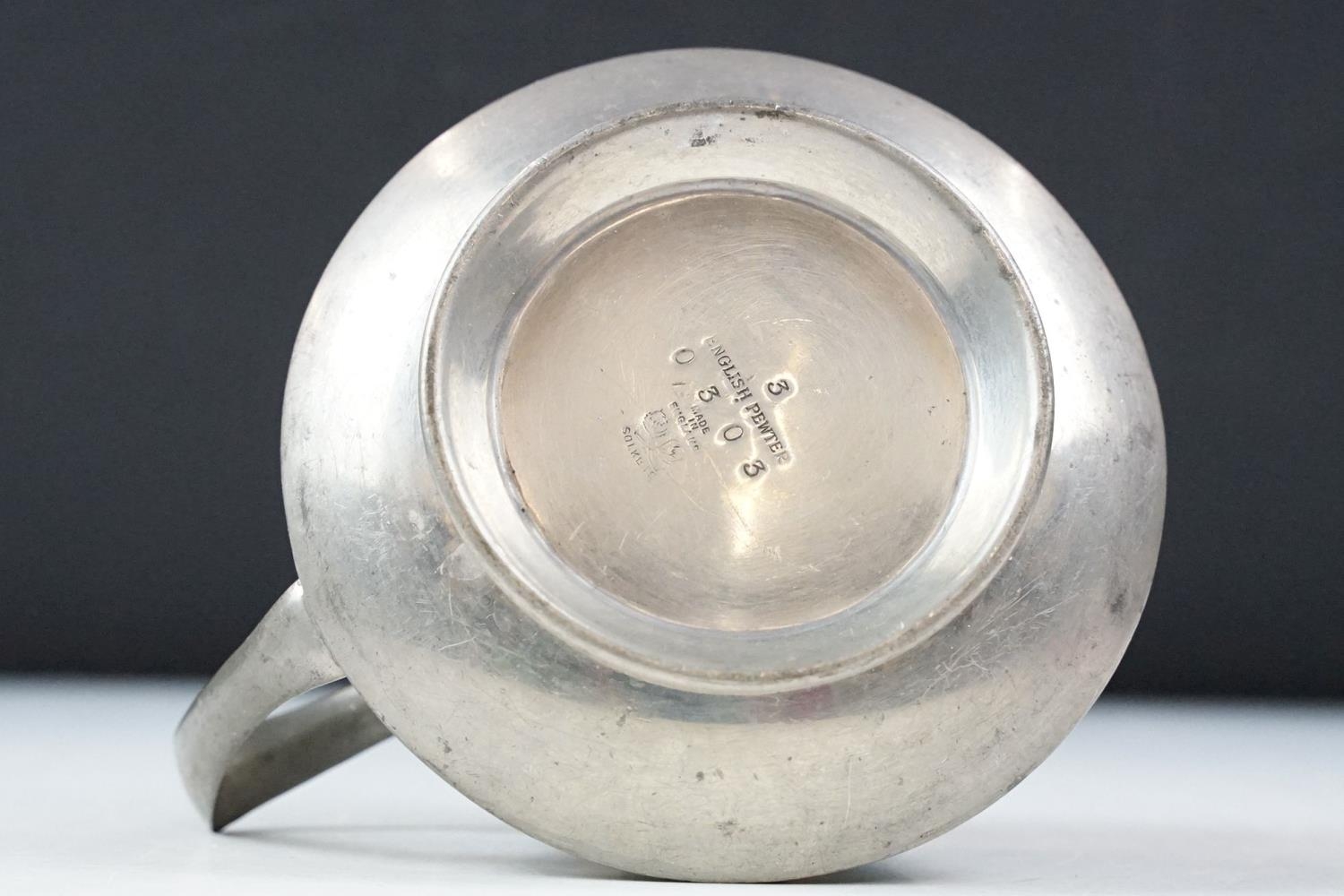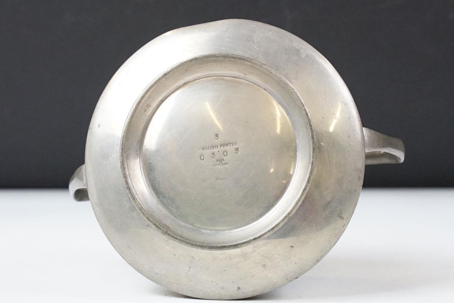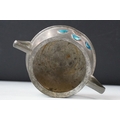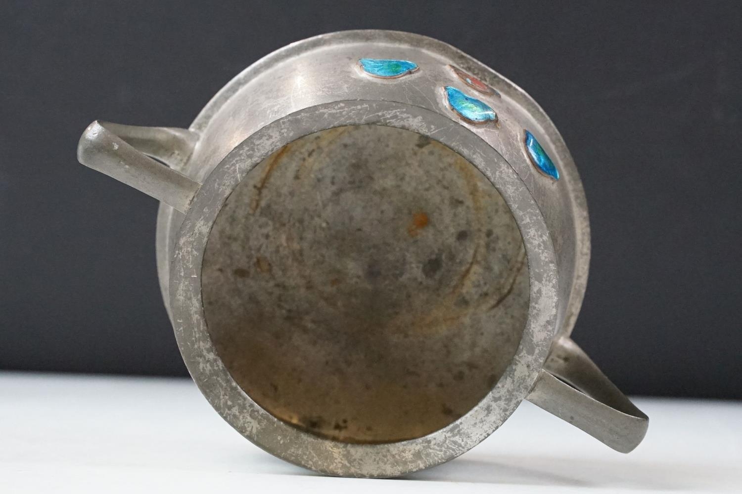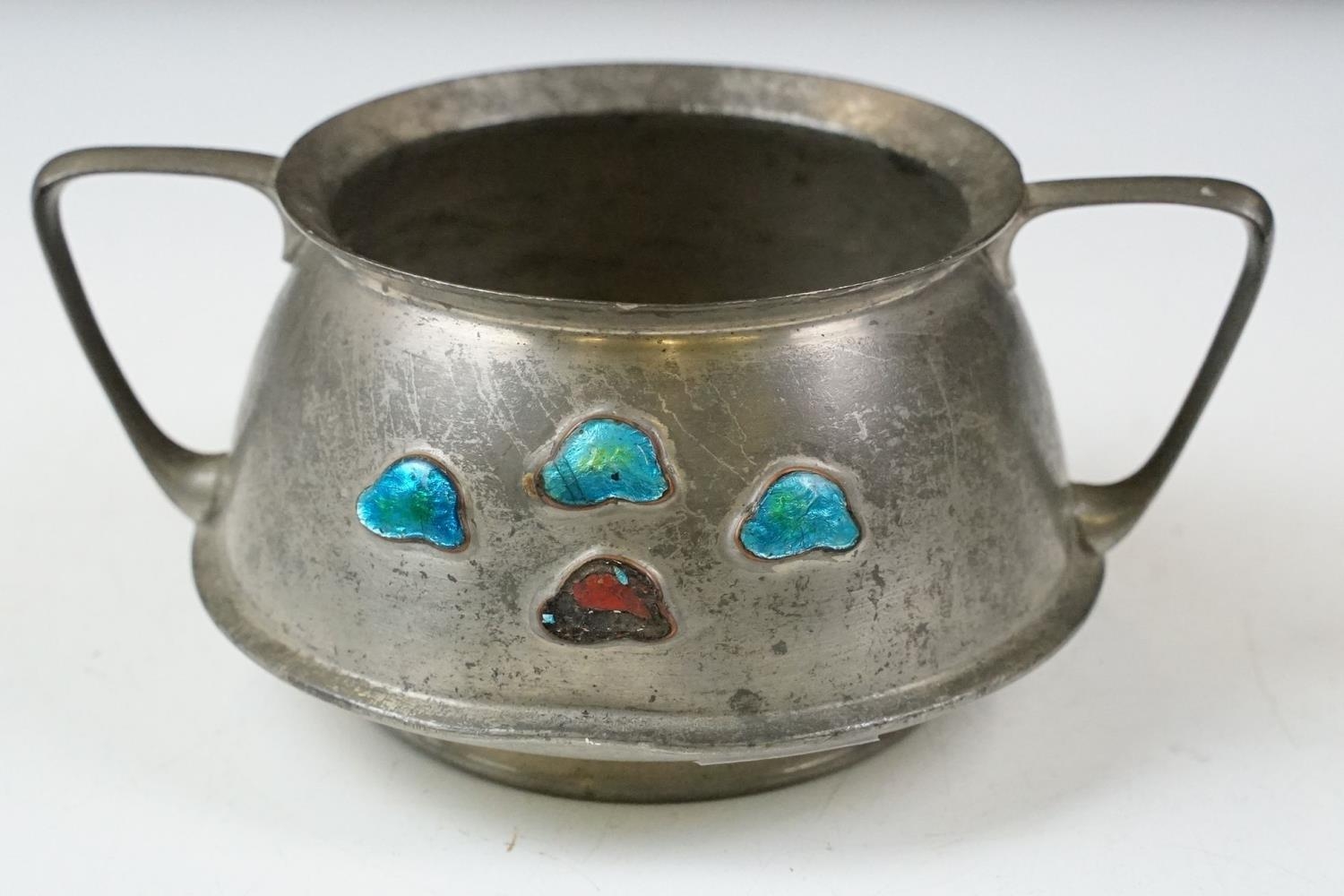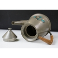 An early twentieth century pewter tea set with peacock enamel decoration in the style of archibald knox.