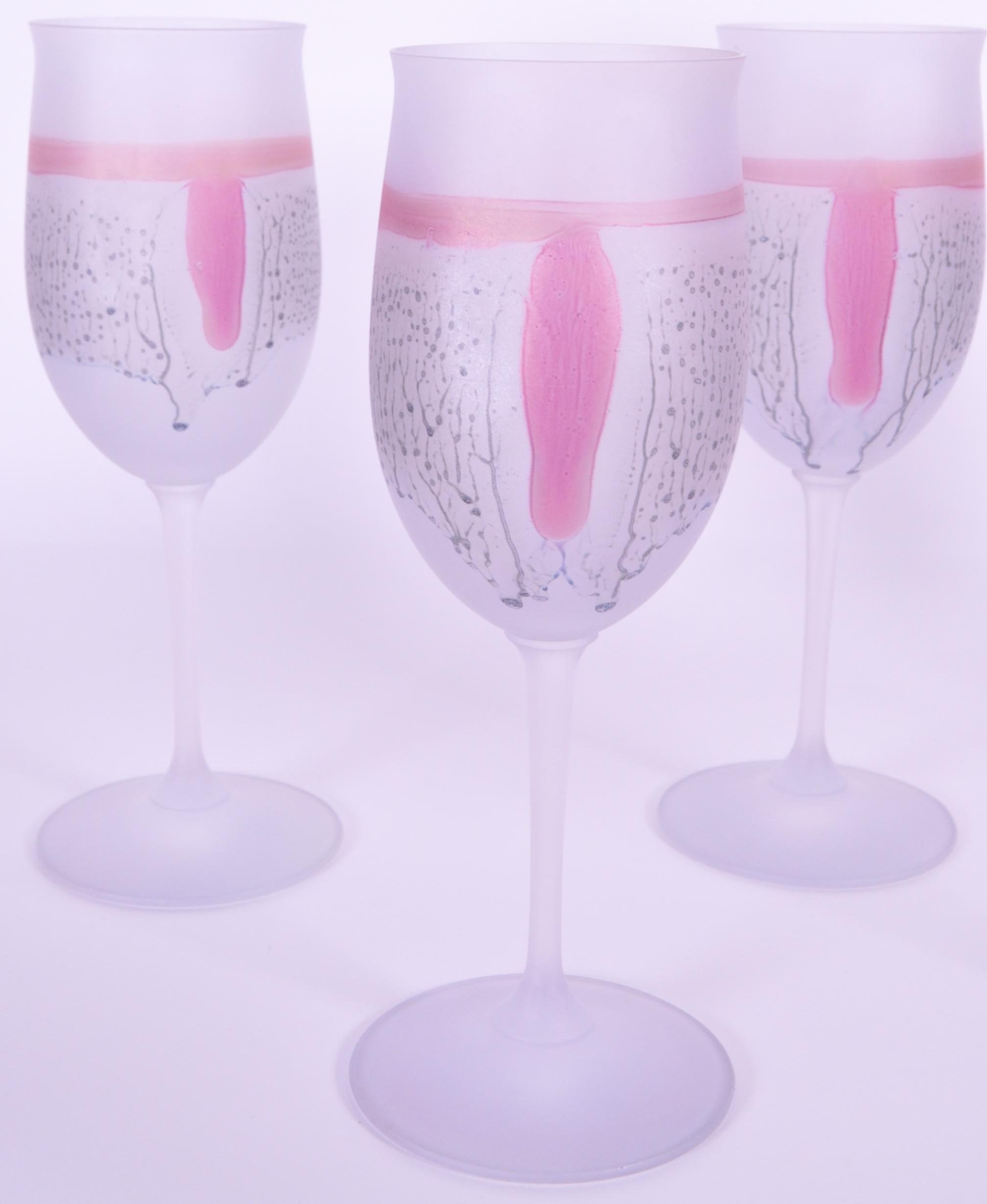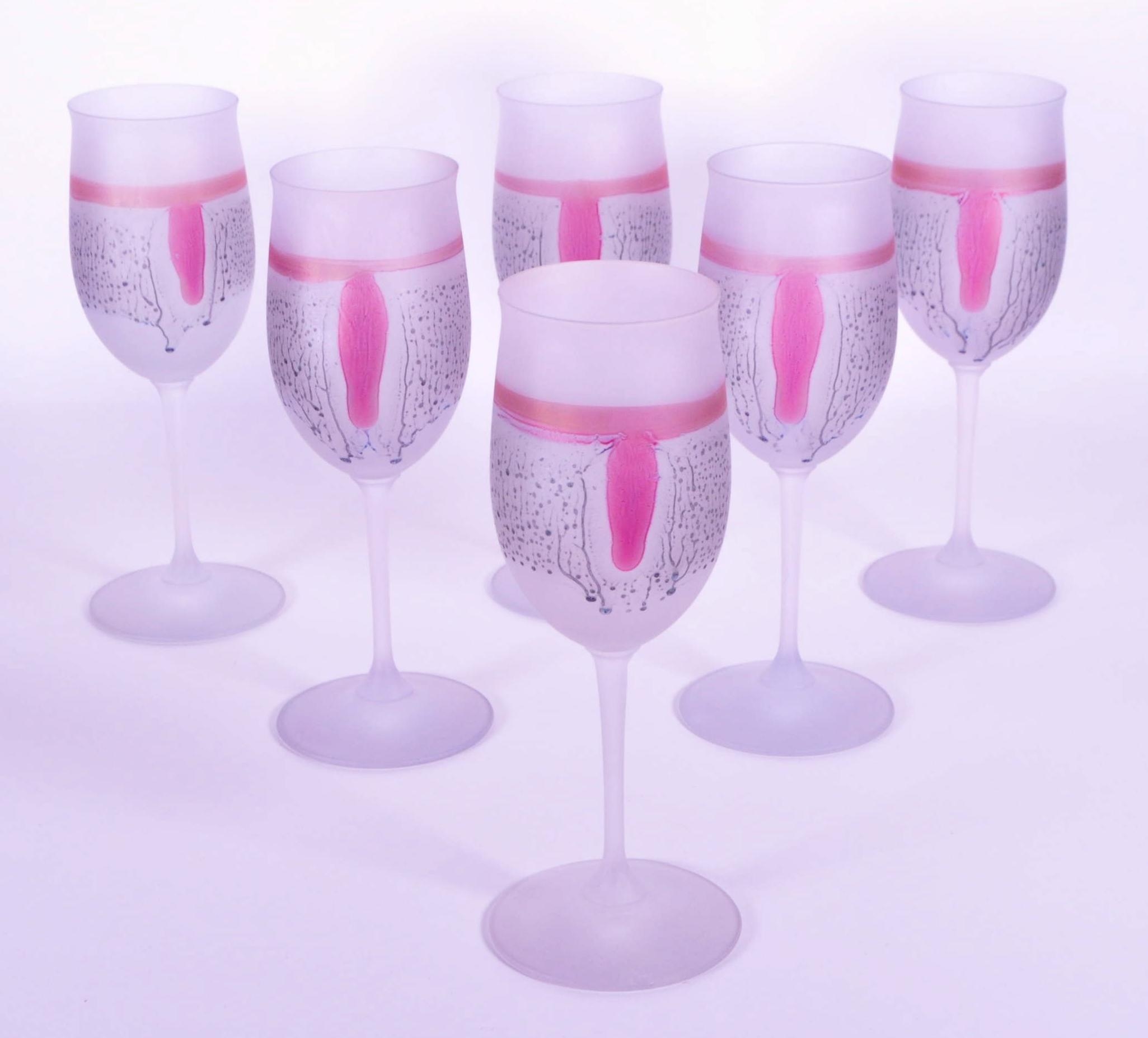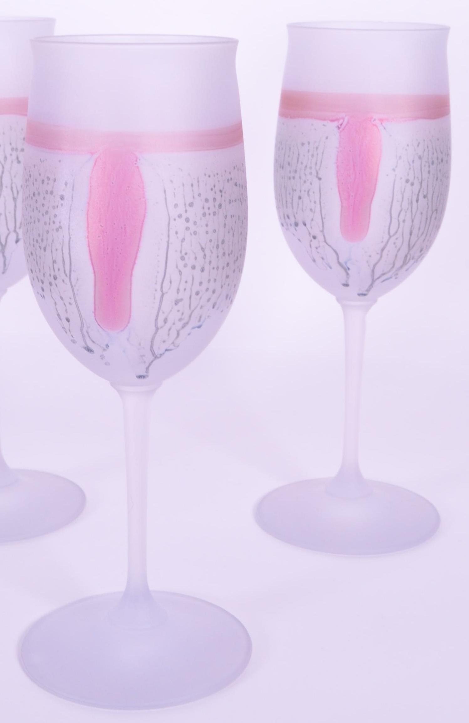 A collection of six vintage mid 20th century tutti frutti wine glass flutes. Each raised on rounded base, with frosted finish and polychrome abstract decoration.