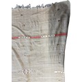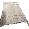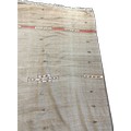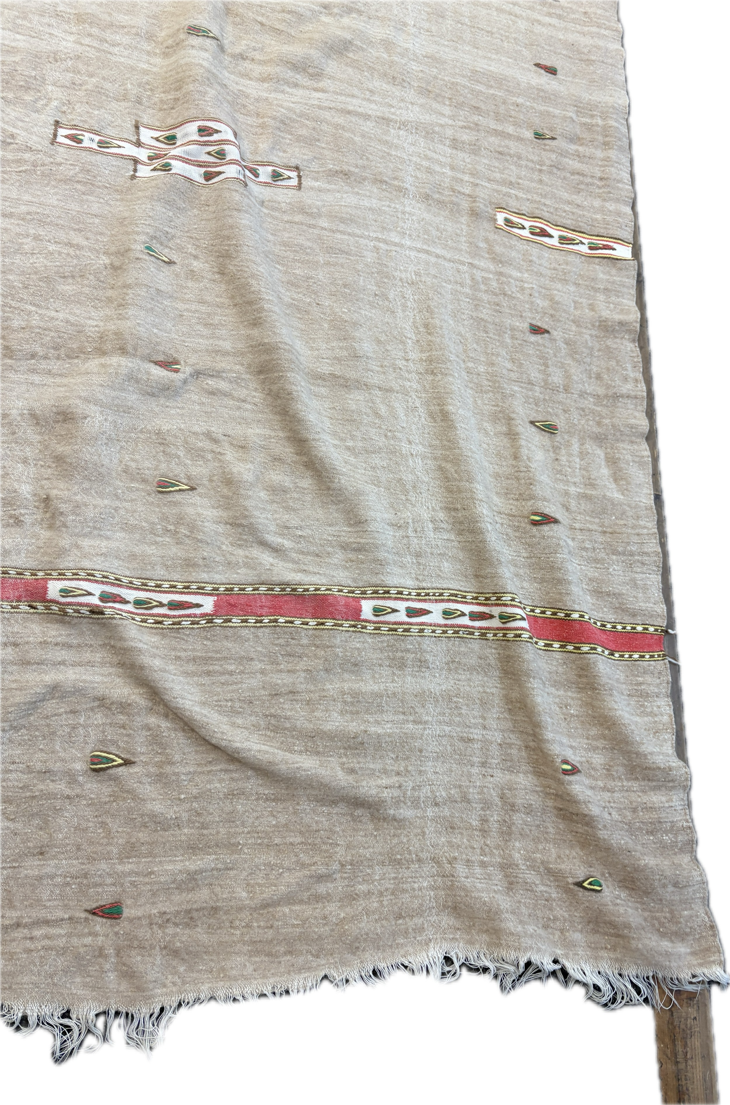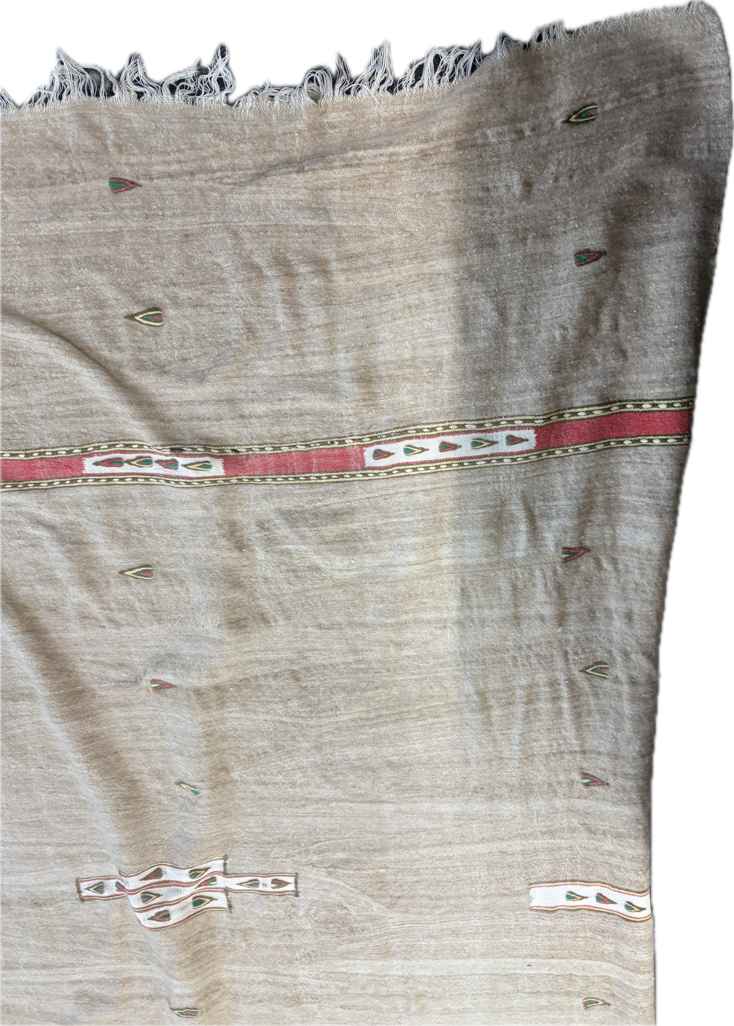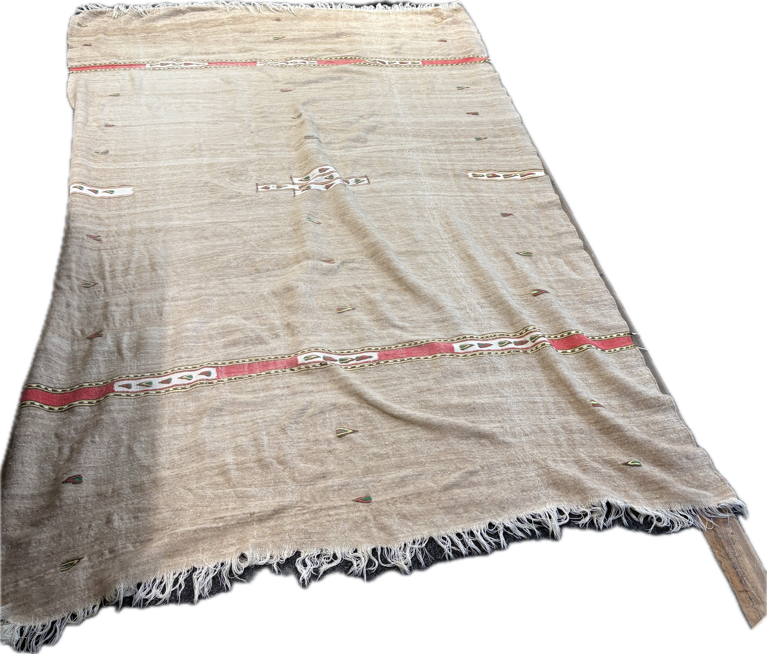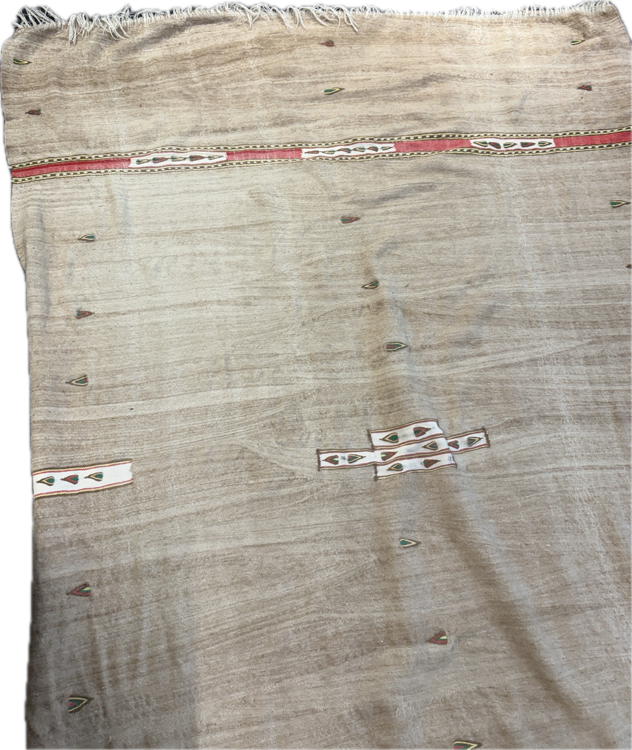 Handmade flat woven wool Kilim rug this rug features a light neutral background with distinct red and green striped borders and minimal, abstract central motifs, measures approximately 93 inches long x 65 wide