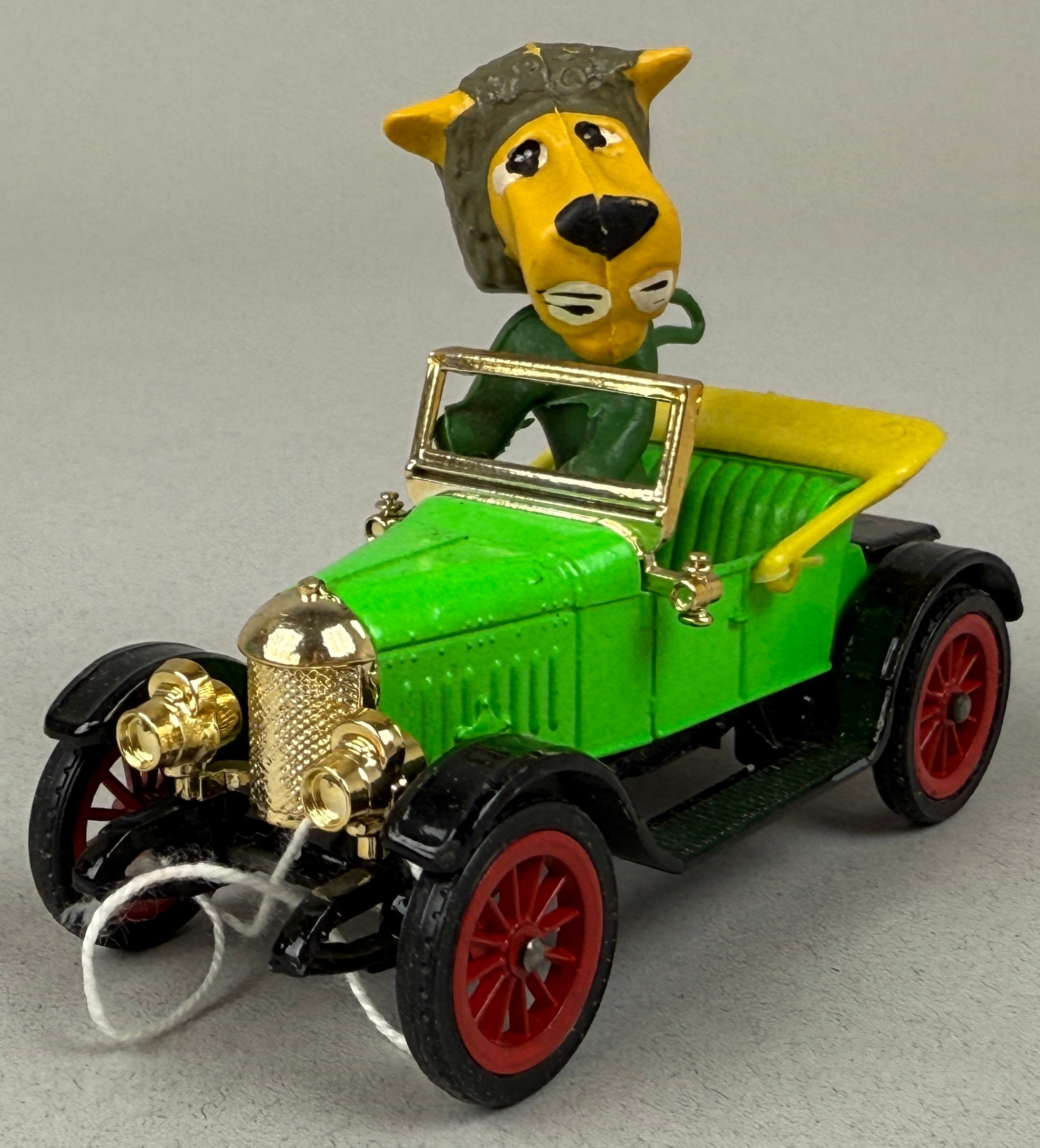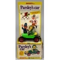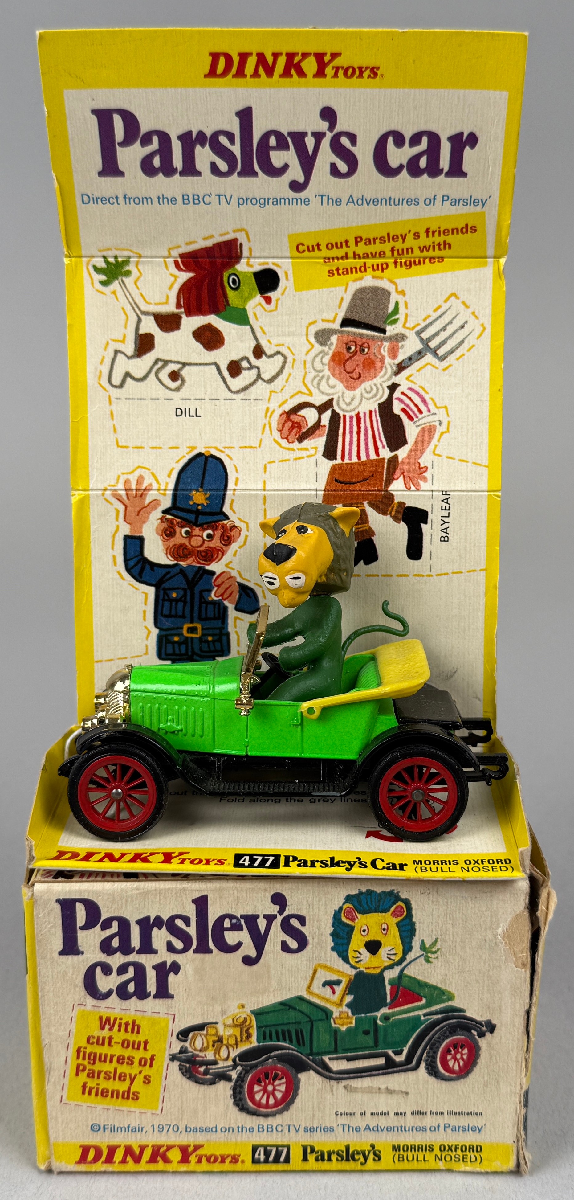Dinky Toys, Parsley's Car, No. 477, light green body, red spoked hubs, plastic moulded Parsley figure, cardboard display stand and box