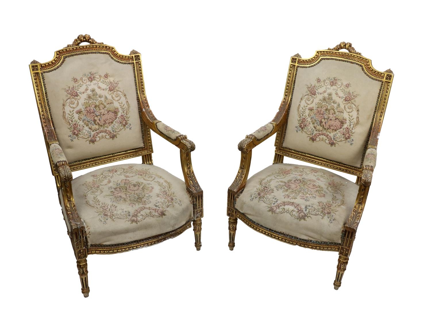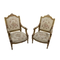 A pair of Louis XV style Open Armchairs, the arched back with carved tops above embroidered back and conforming seat, the padded scroll arm with leaf decoration on front shaped tapering legs. (2)