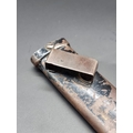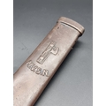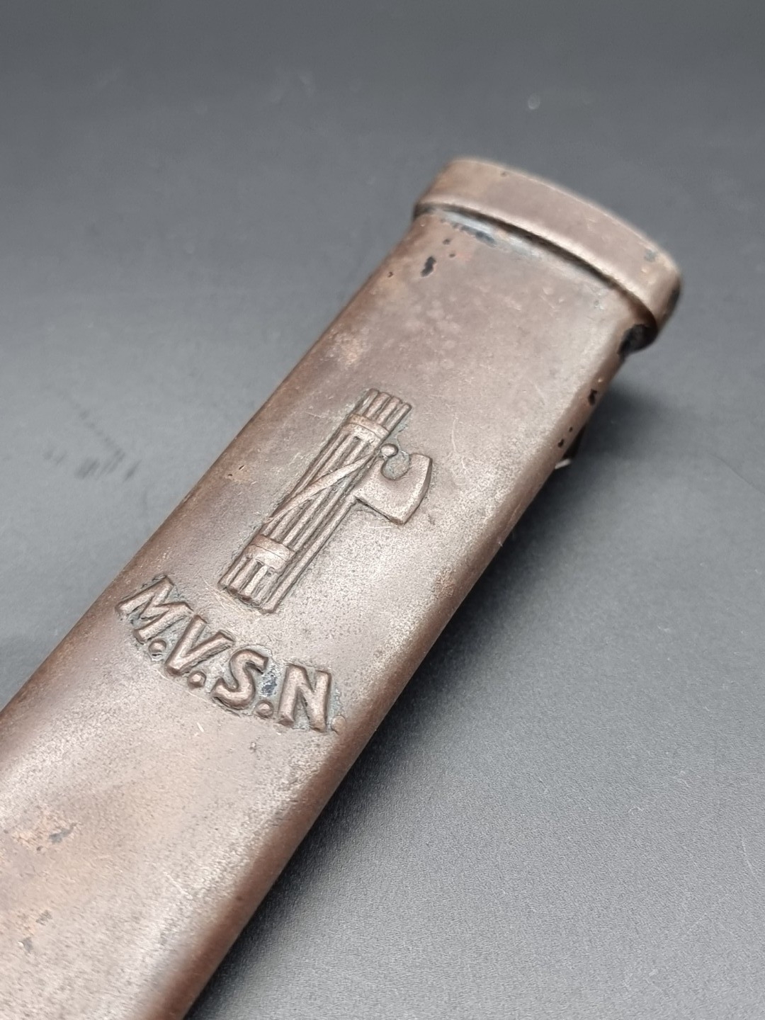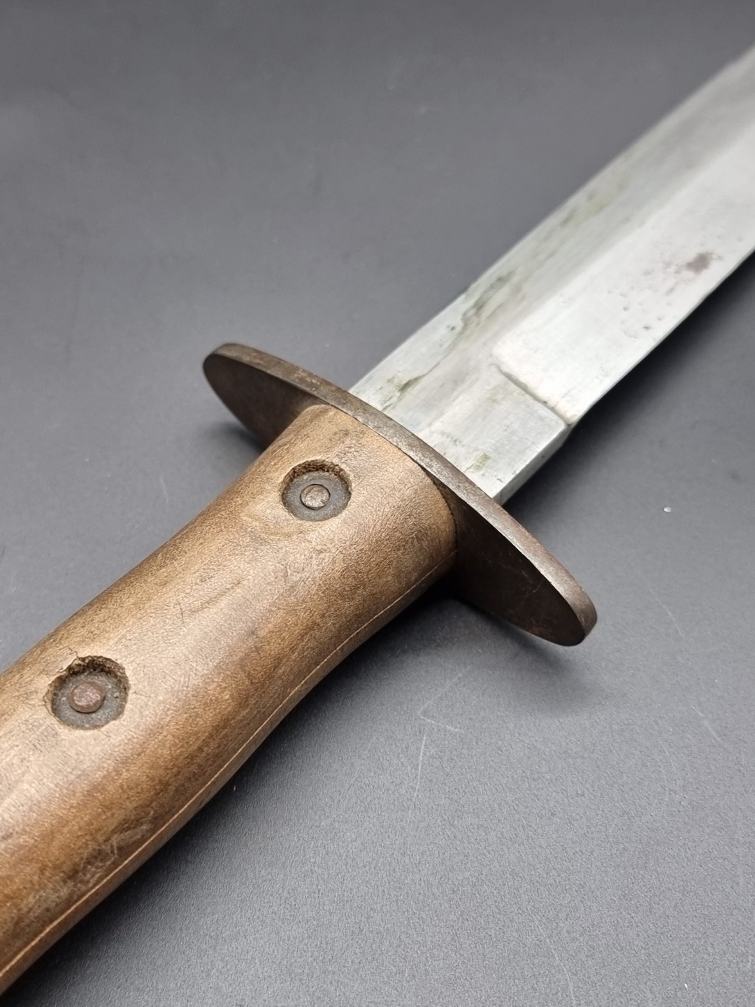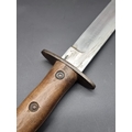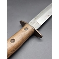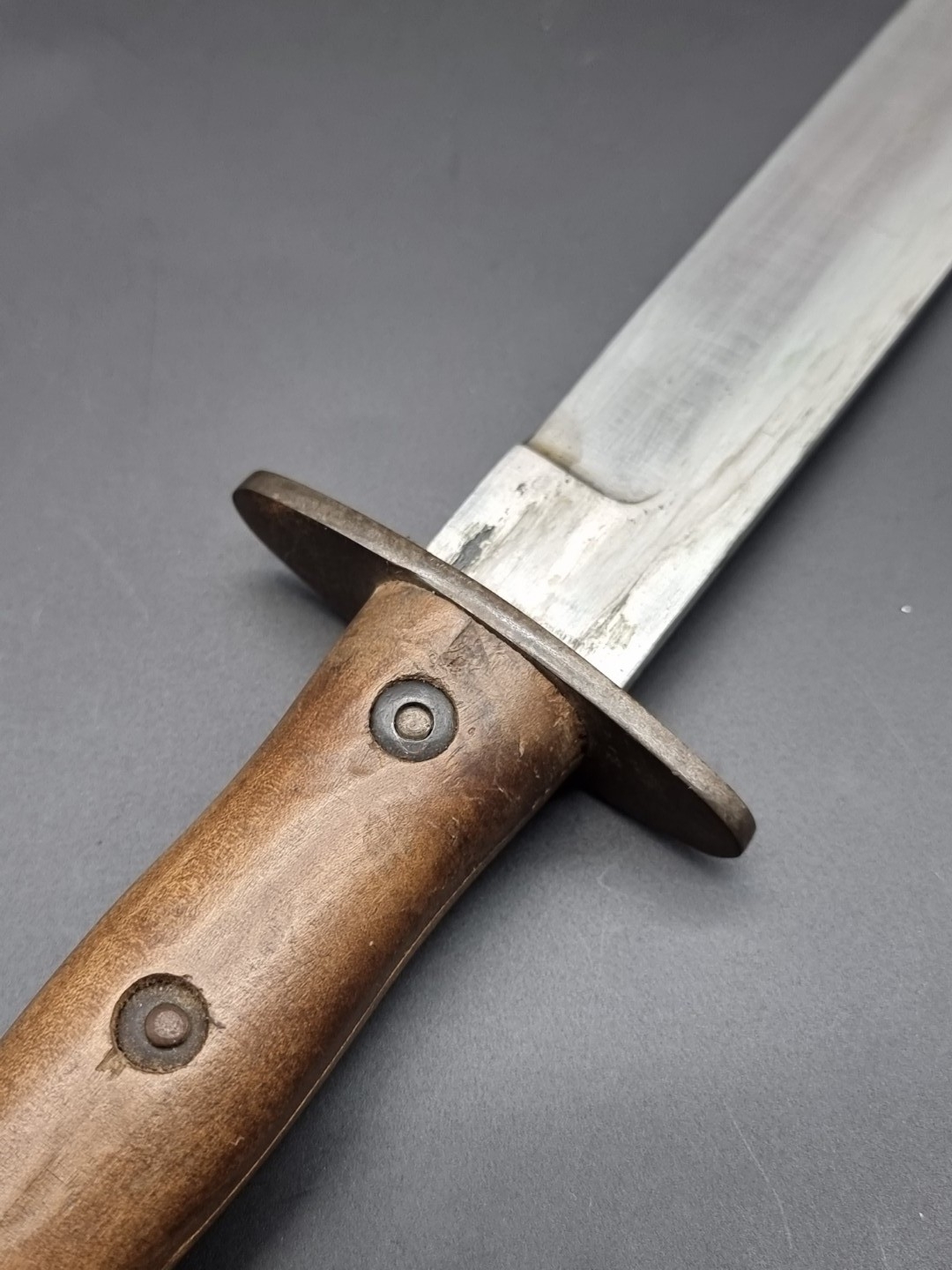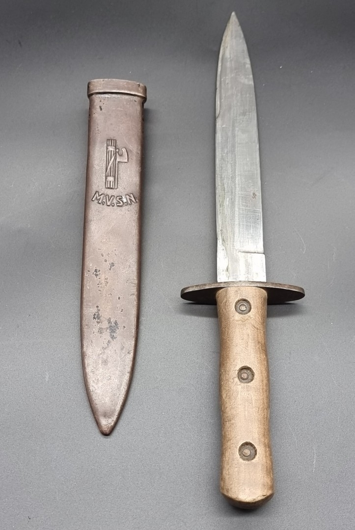 A WWII Italian combat knife and sheath, with 21.8cm single edged clip back blade and beech grip.