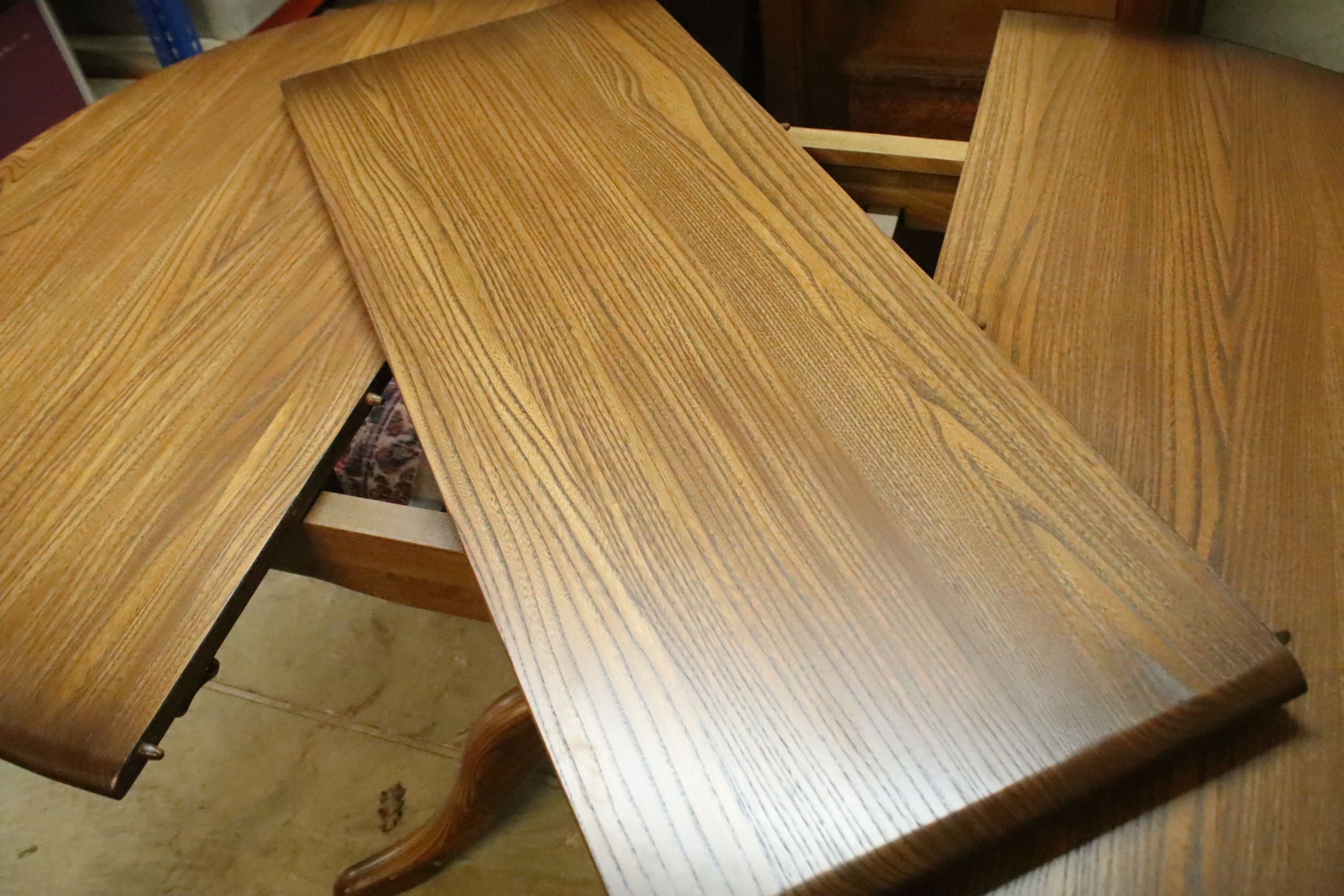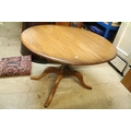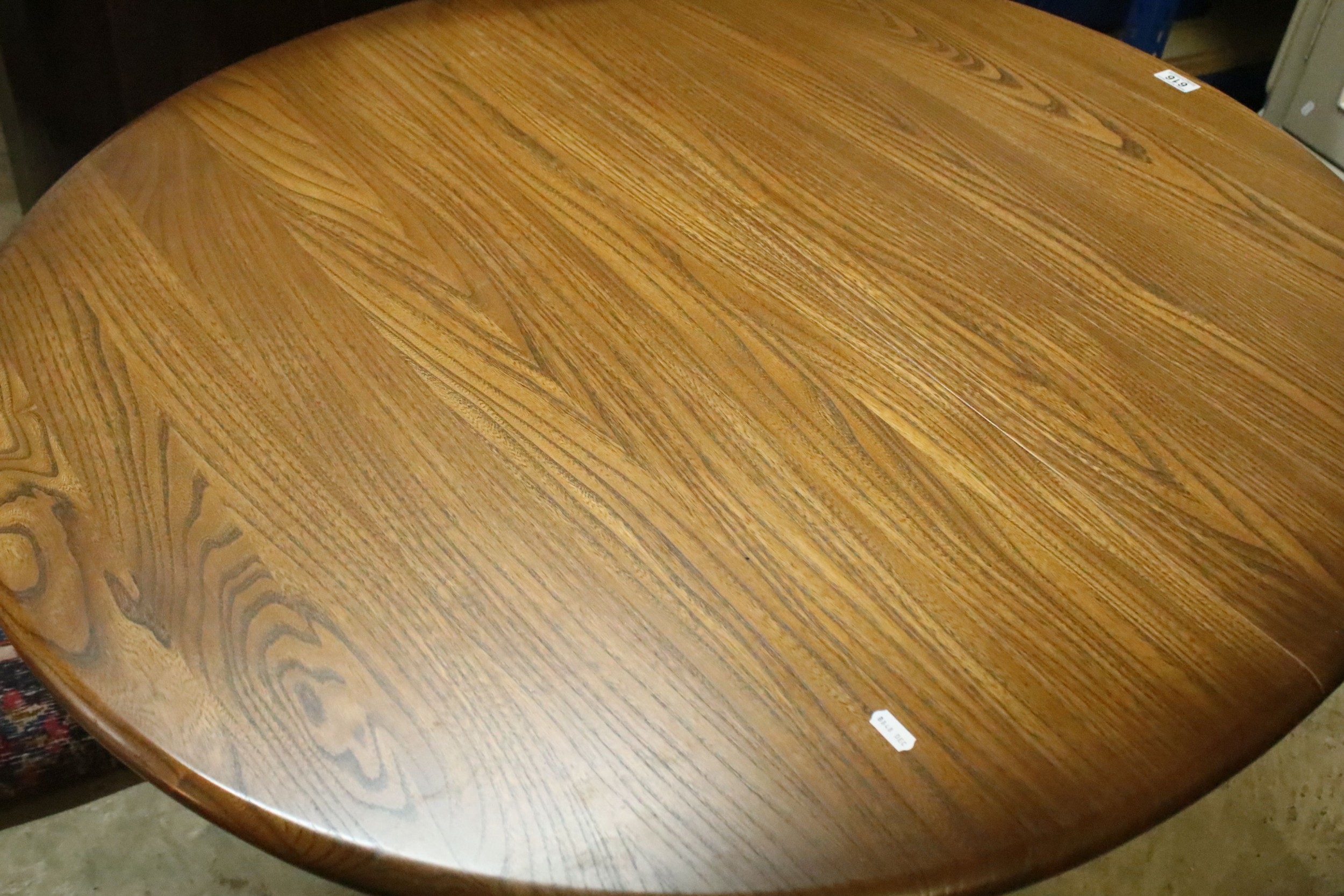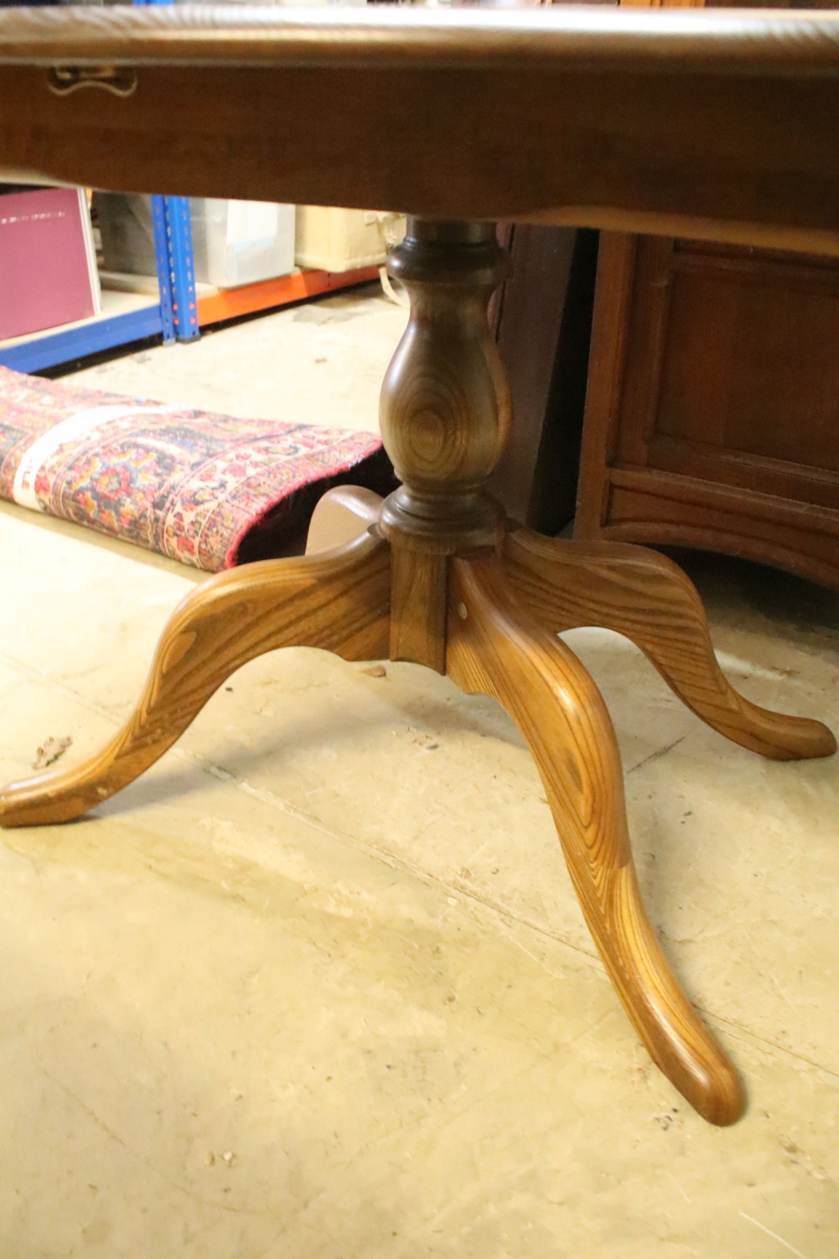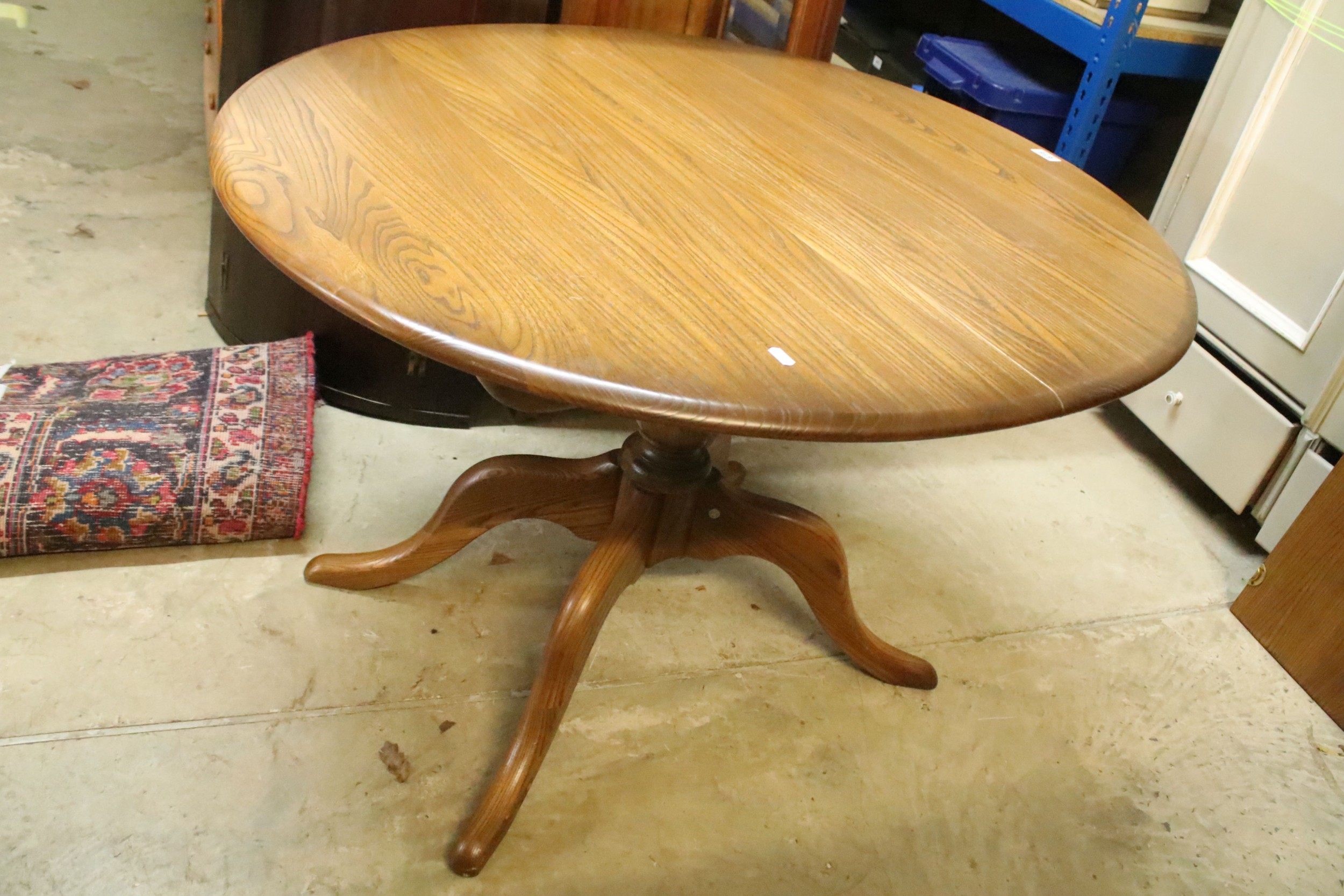 Ercol pedestal extending dining table, having oval top with baluster stem base and swept legs, 110cm x 100cm x H 72cm