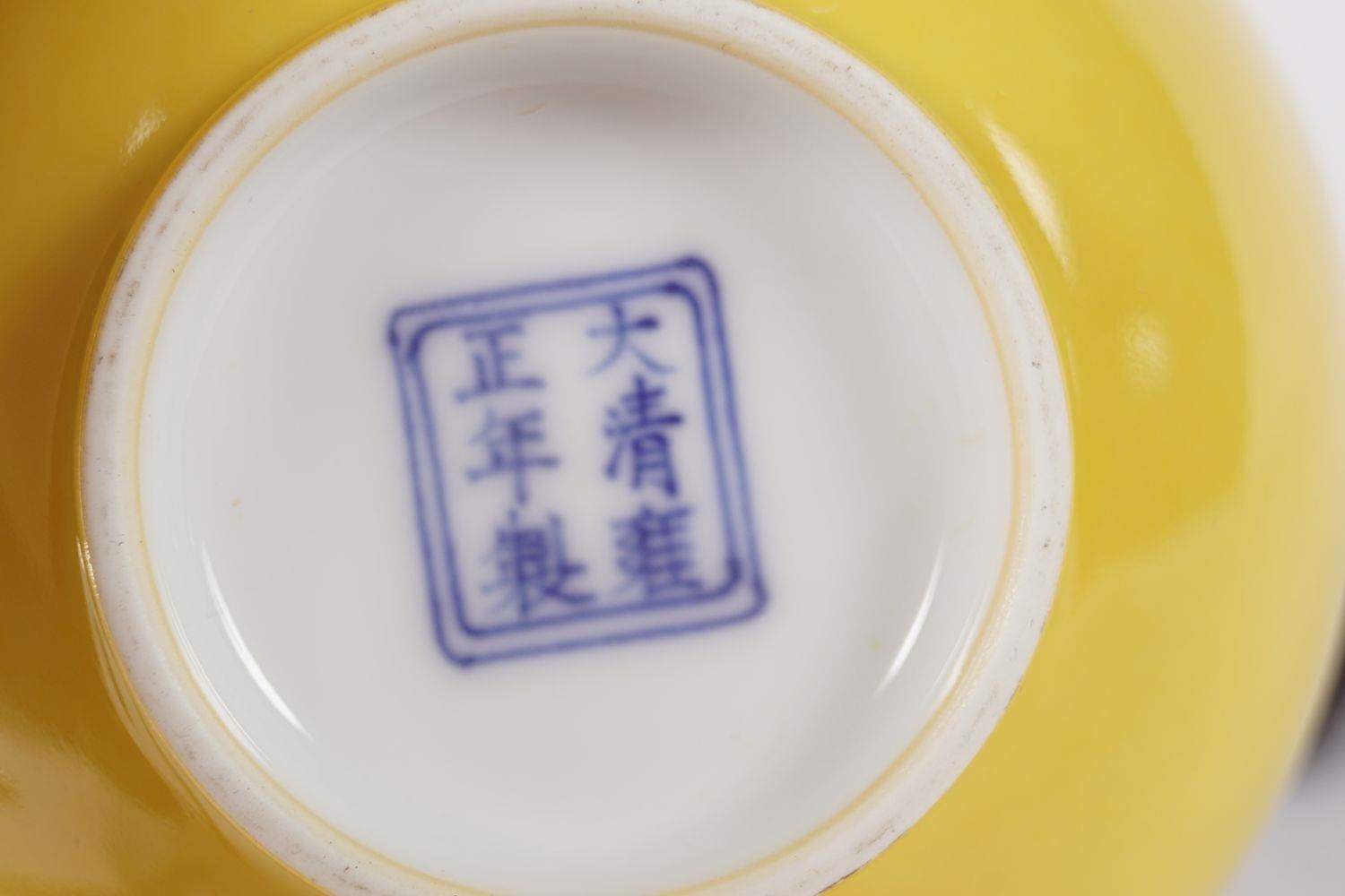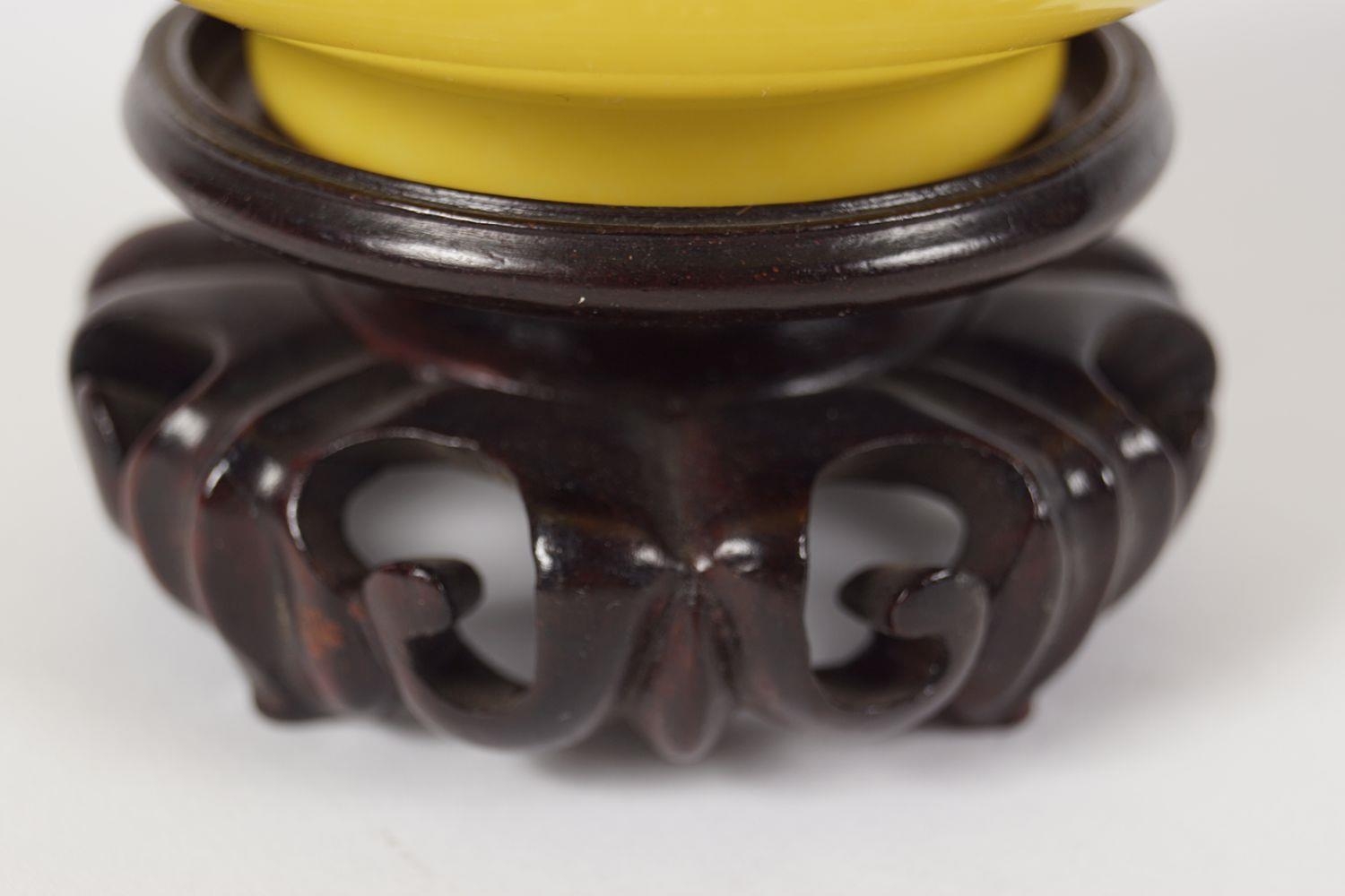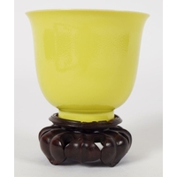of circular tapered form, Yongzheng six character mark to base, raised on a hard wood base 6 cm. high; 11 cm. diameter