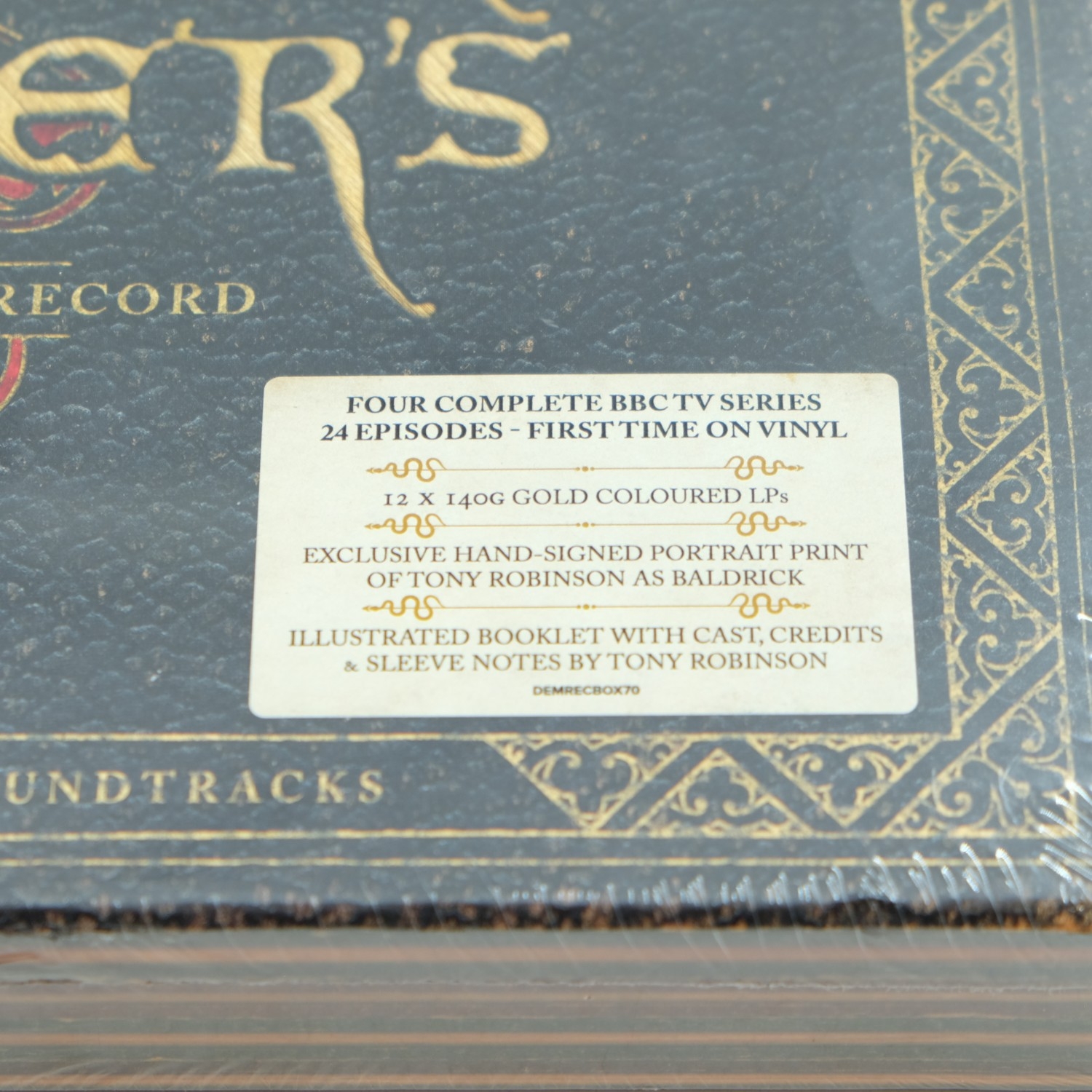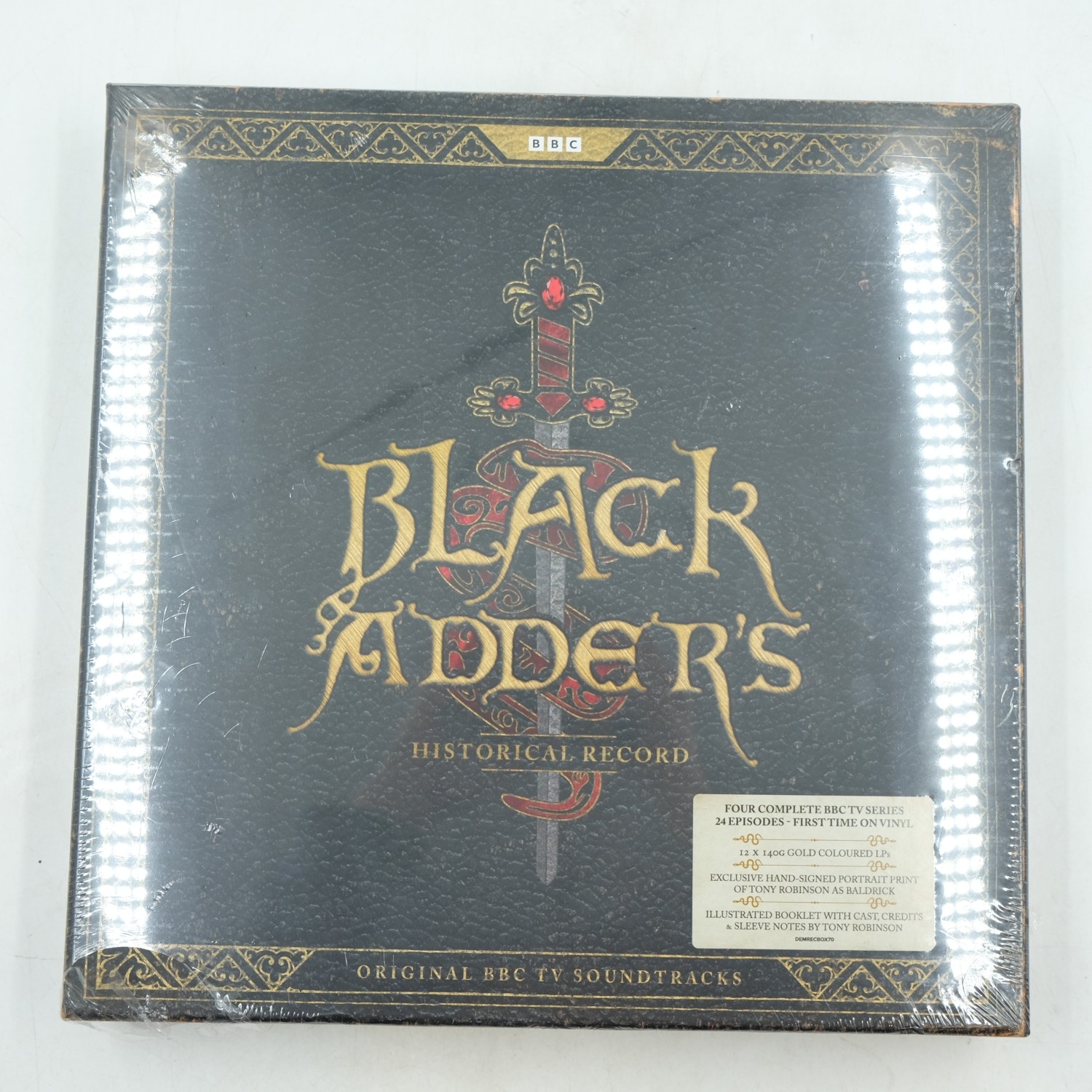 Black Adder's Historical Record BBC TV series twenty-four episodes collection on vinyl, factory sealed, includes gold coloured LPs, and an exclusive hand-signed portrait print of Tony Robinson as Baldrick. UK P&P Group 2 (£24+VAT for the first lot and £5+VAT for subsequent lots)