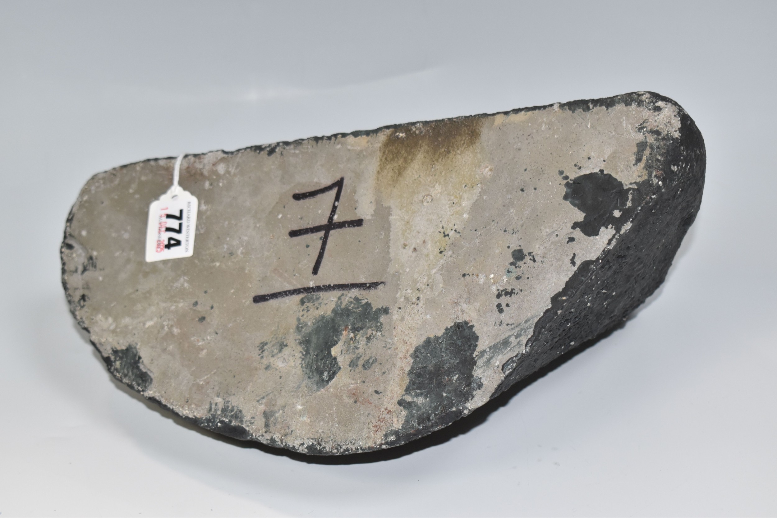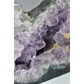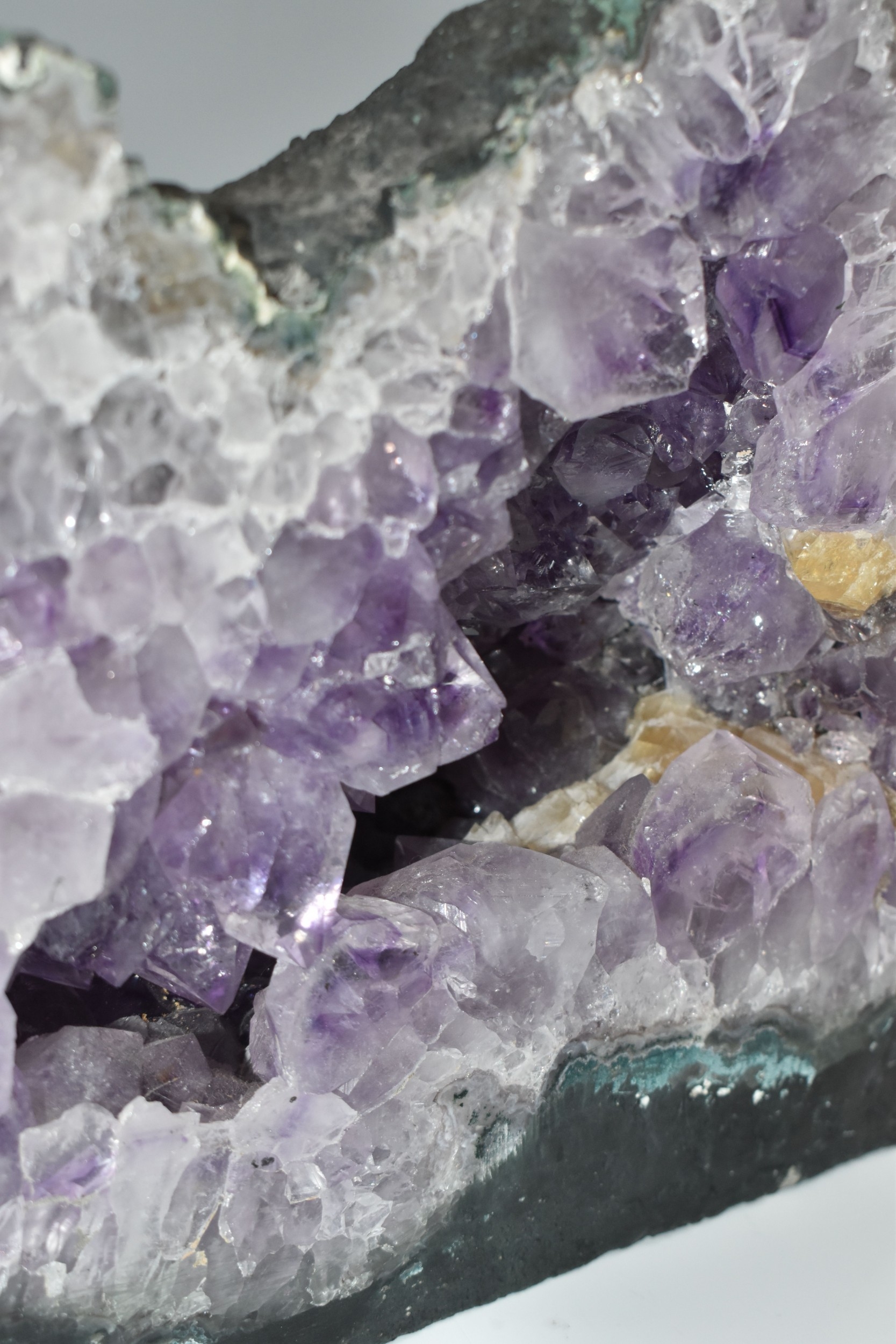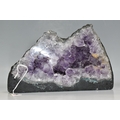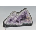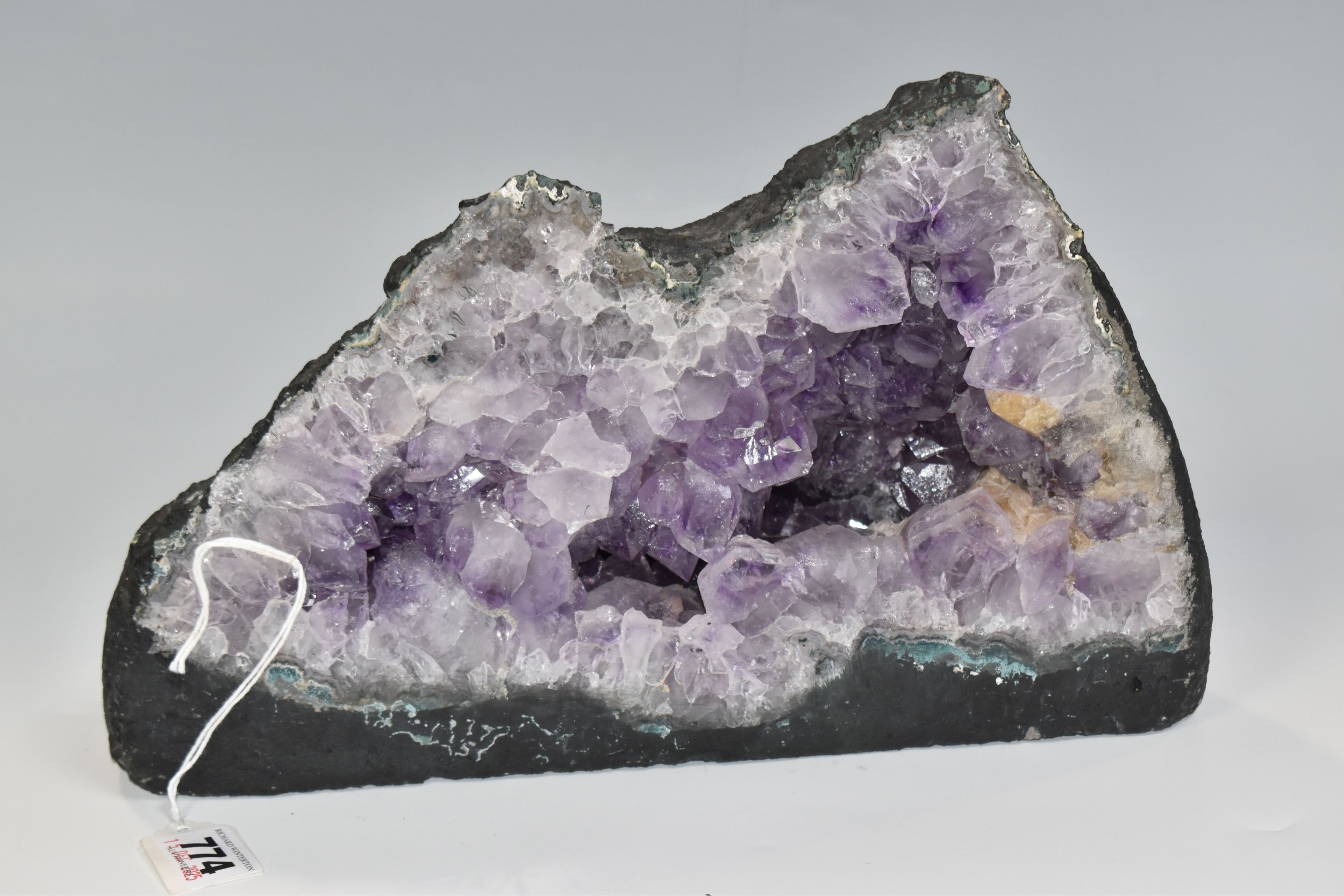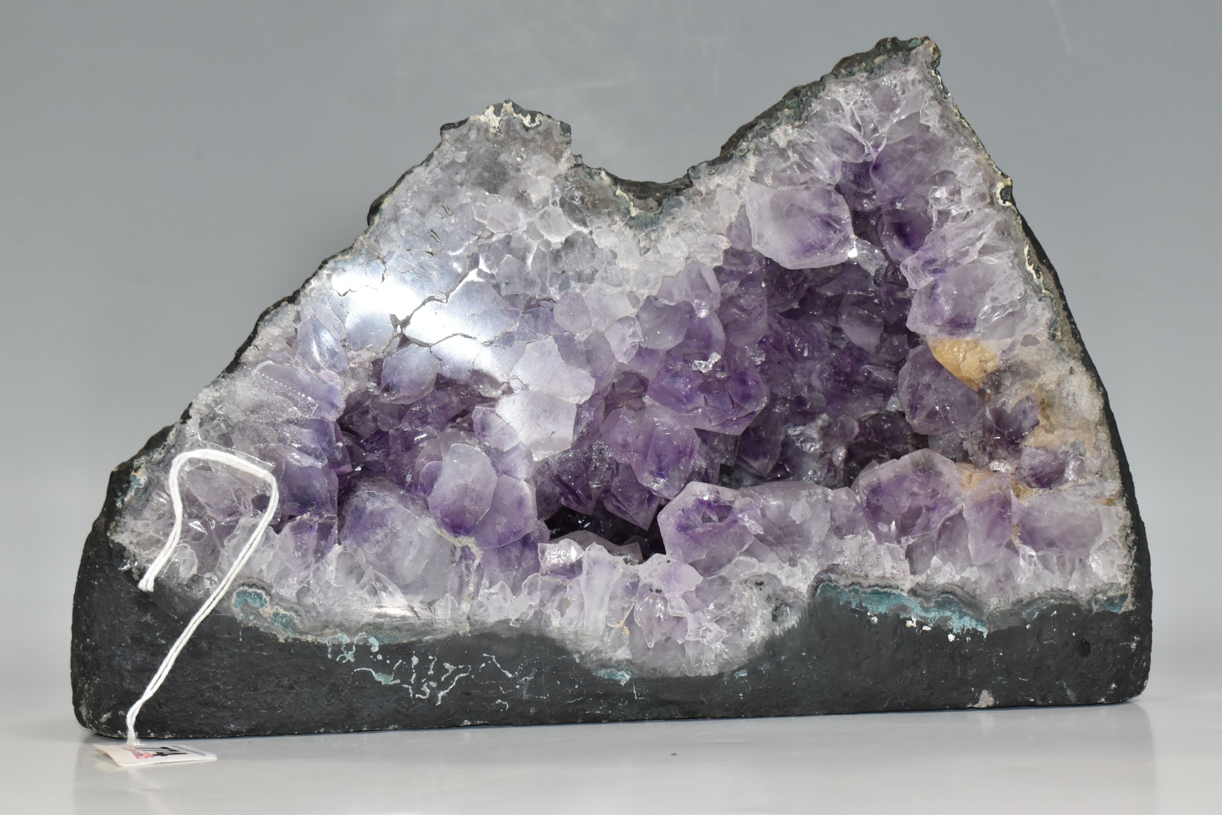 A LARGE AMETHYST GEODE CAVE STONE, free standing with a flat base, well defined crystals of various size within the cavern, cavity to the base leading to the main cavern, over painted external surfaces, height 20cm, width 32cm, (1), (Condition Report: scuffs to the external paint)