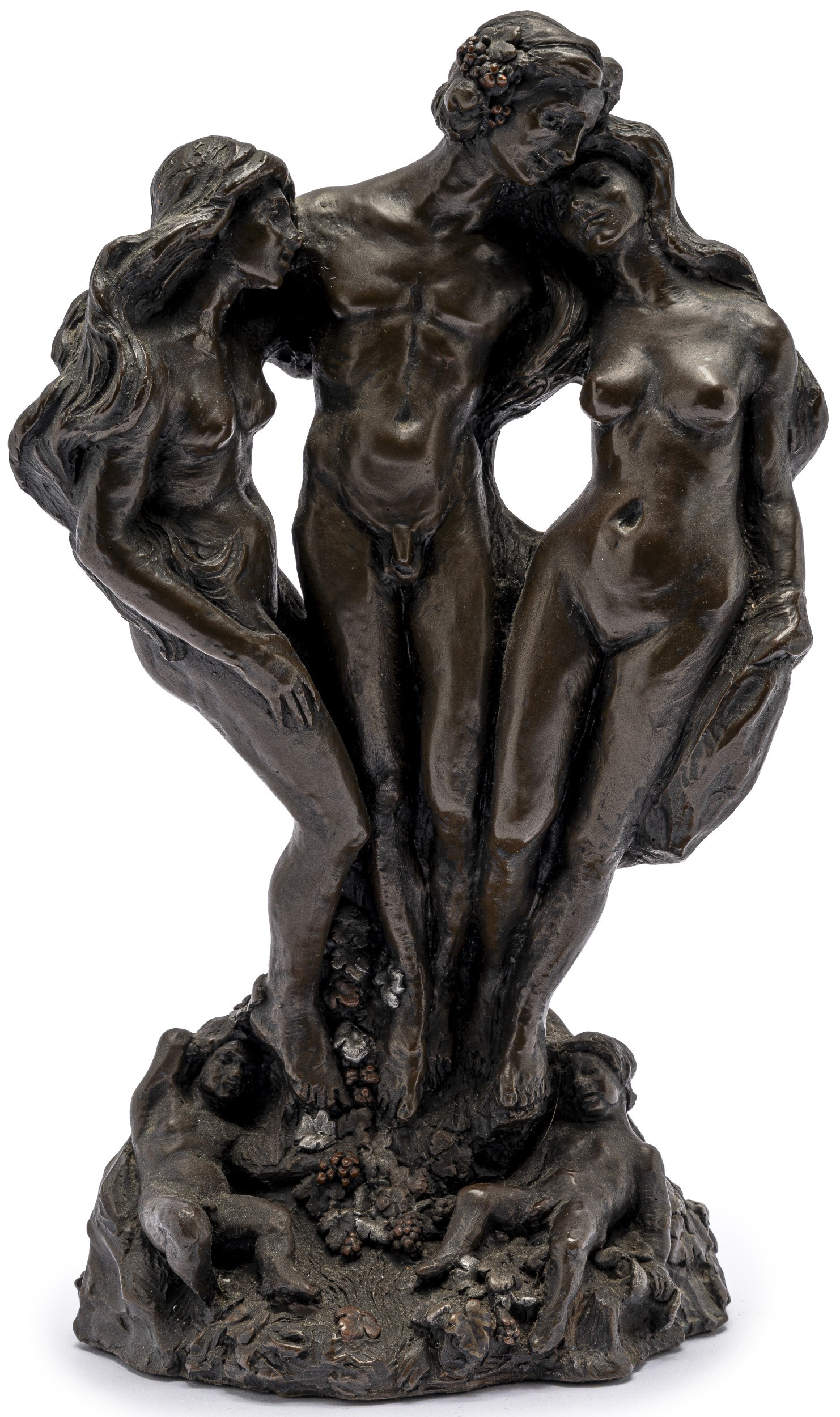 Featuring a naked man in the embrace of two naked woman, with three reclining naked boys at the feet of this group, all resting on a grassy mound, signed