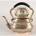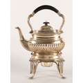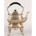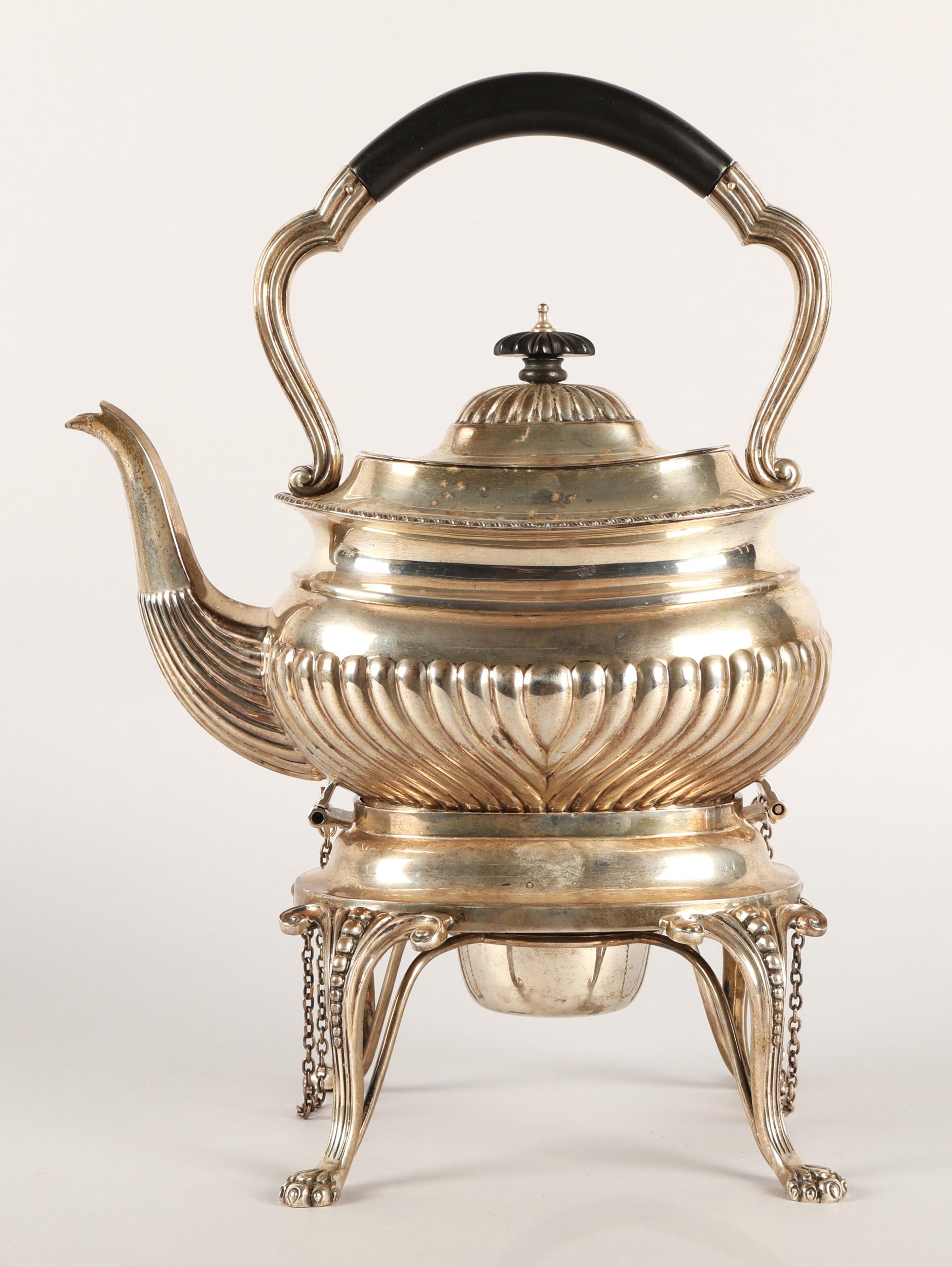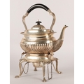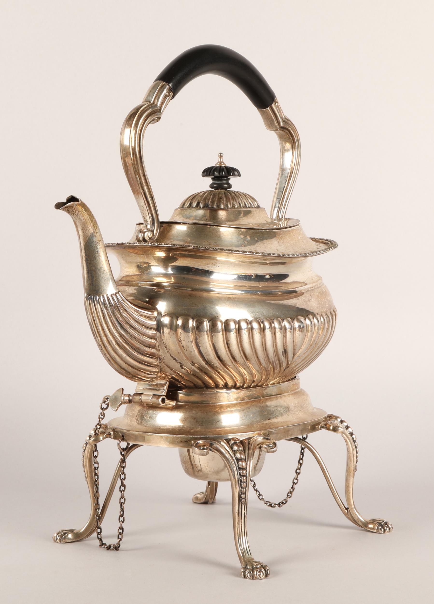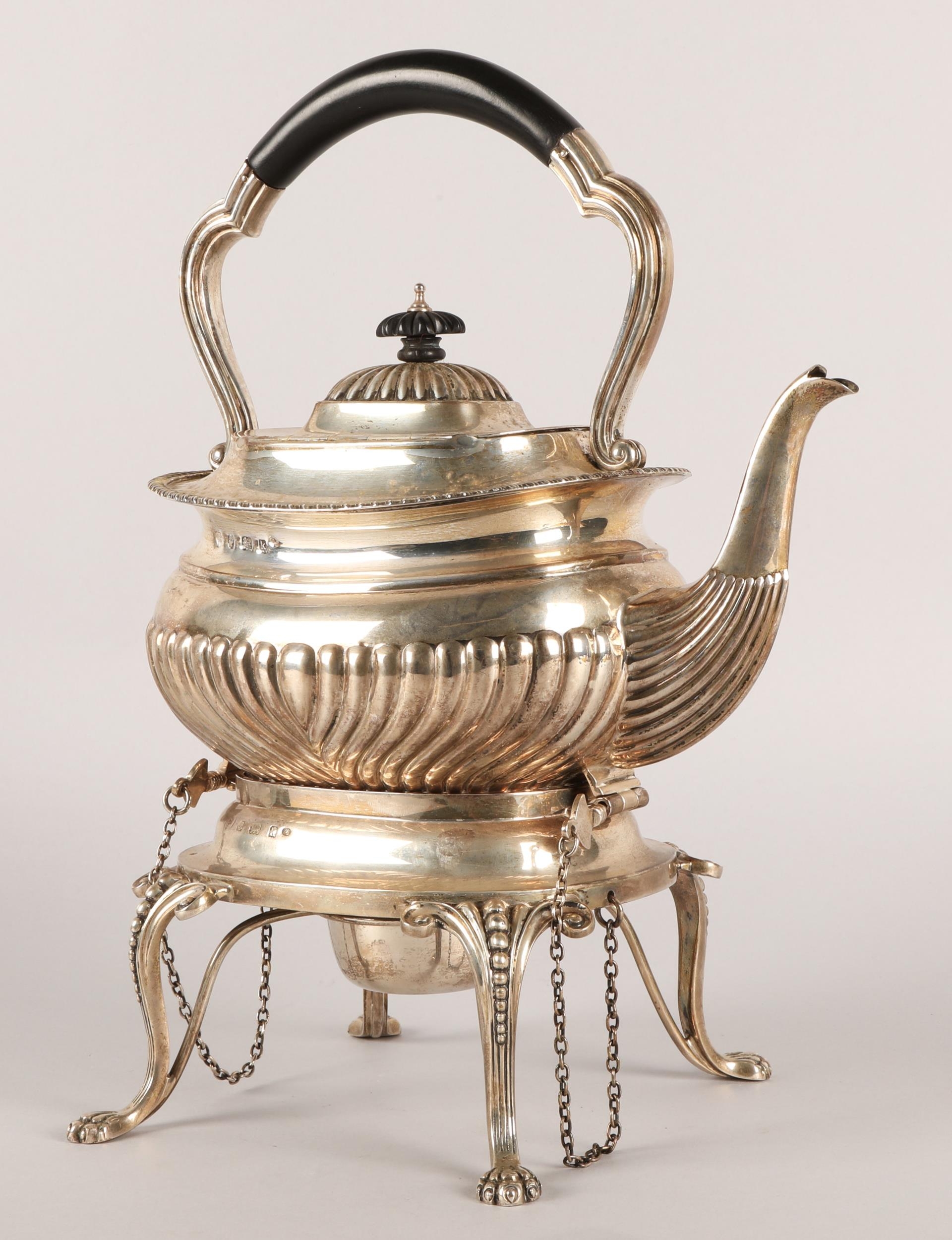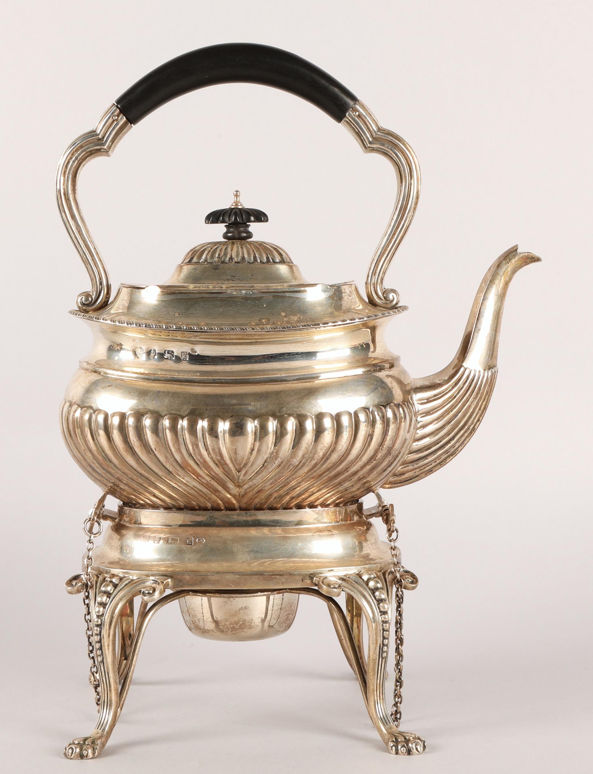 Silver spirit kettle on stand, Birmingham, with gadrooned border and part fluted, silver burner, on animal paw feet, 33cm high, approximate gross weight 1306 grams