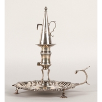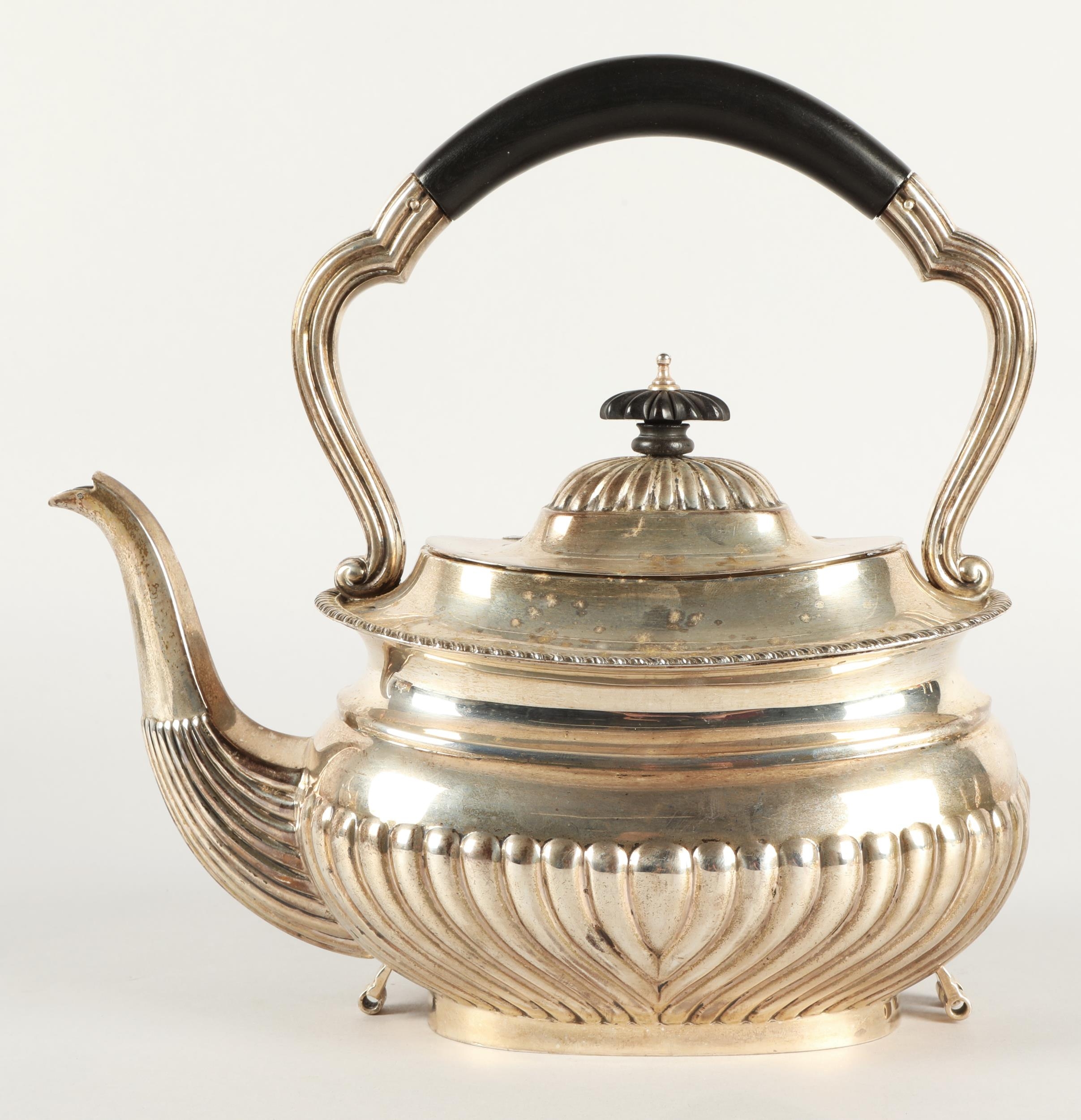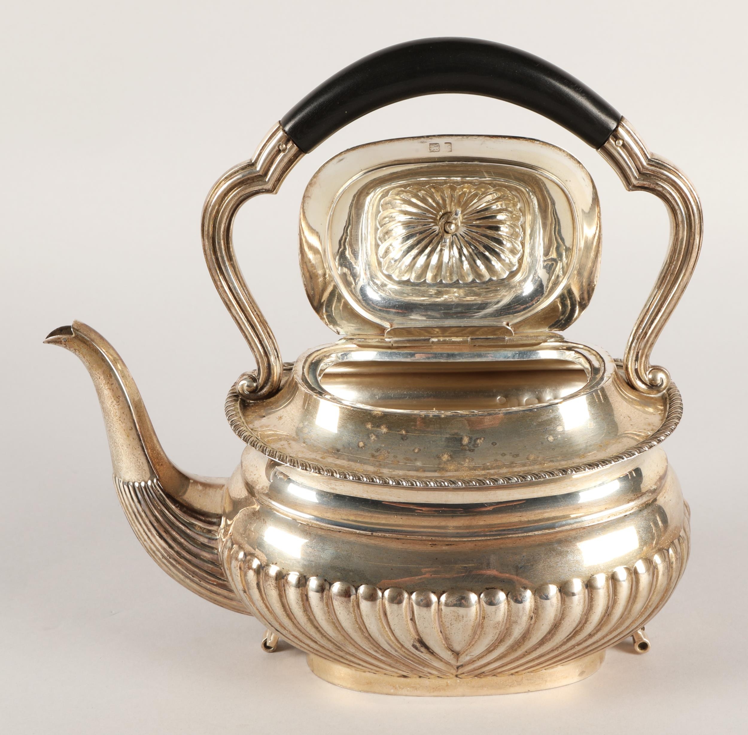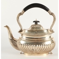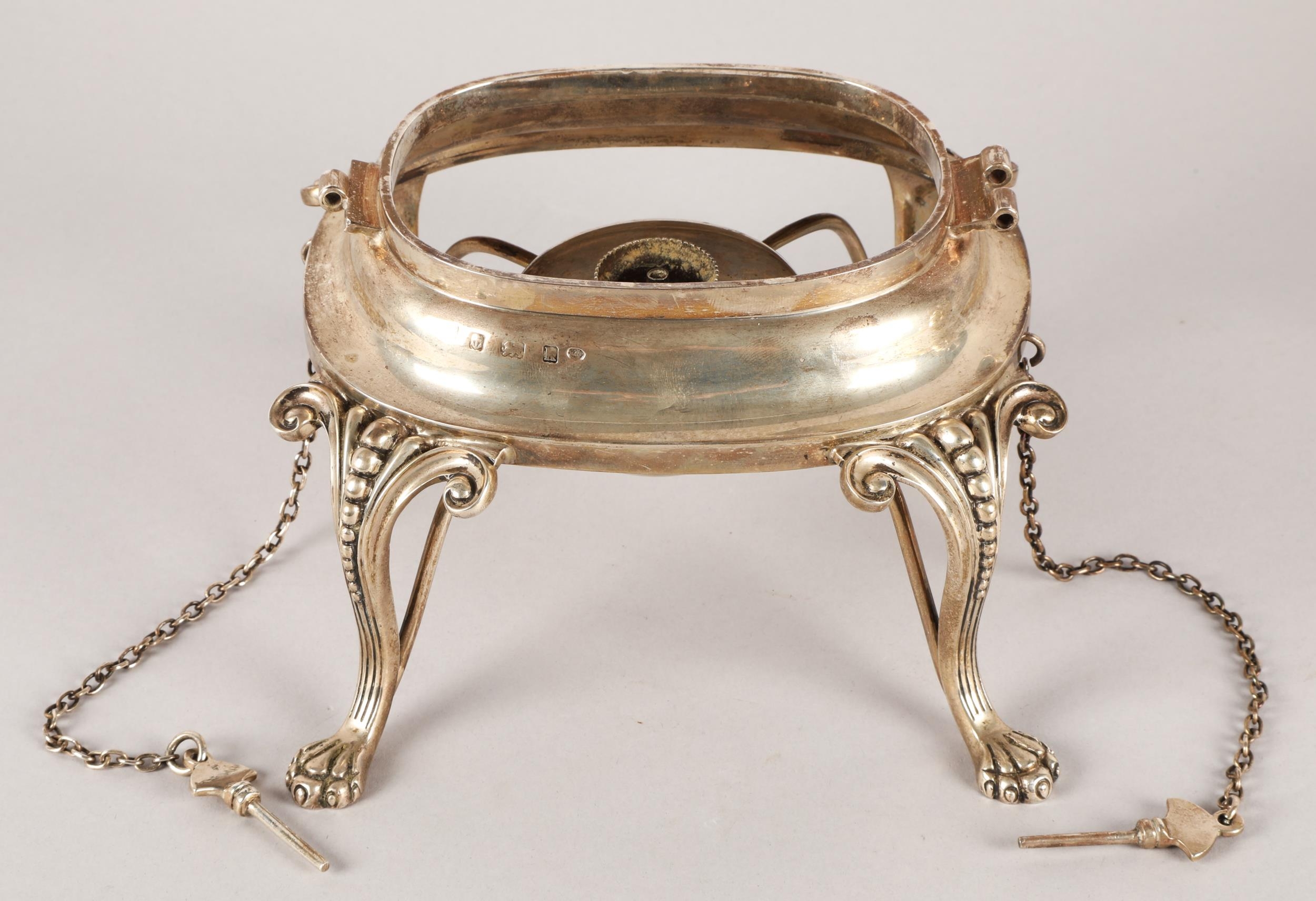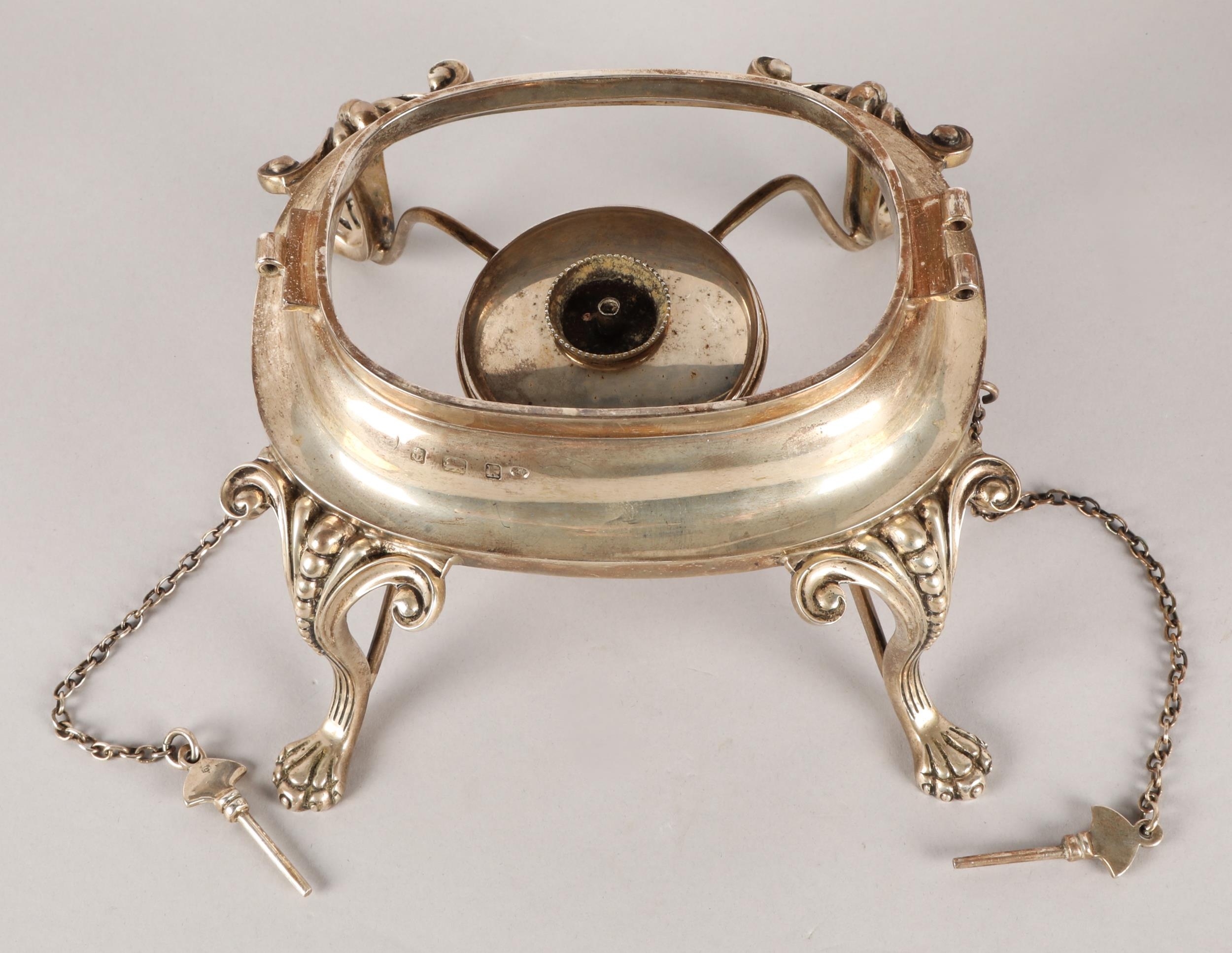 Silver spirit kettle on stand, Birmingham, with gadrooned border and part fluted, silver burner, on animal paw feet, 33cm high, approximate gross weight 1306 grams