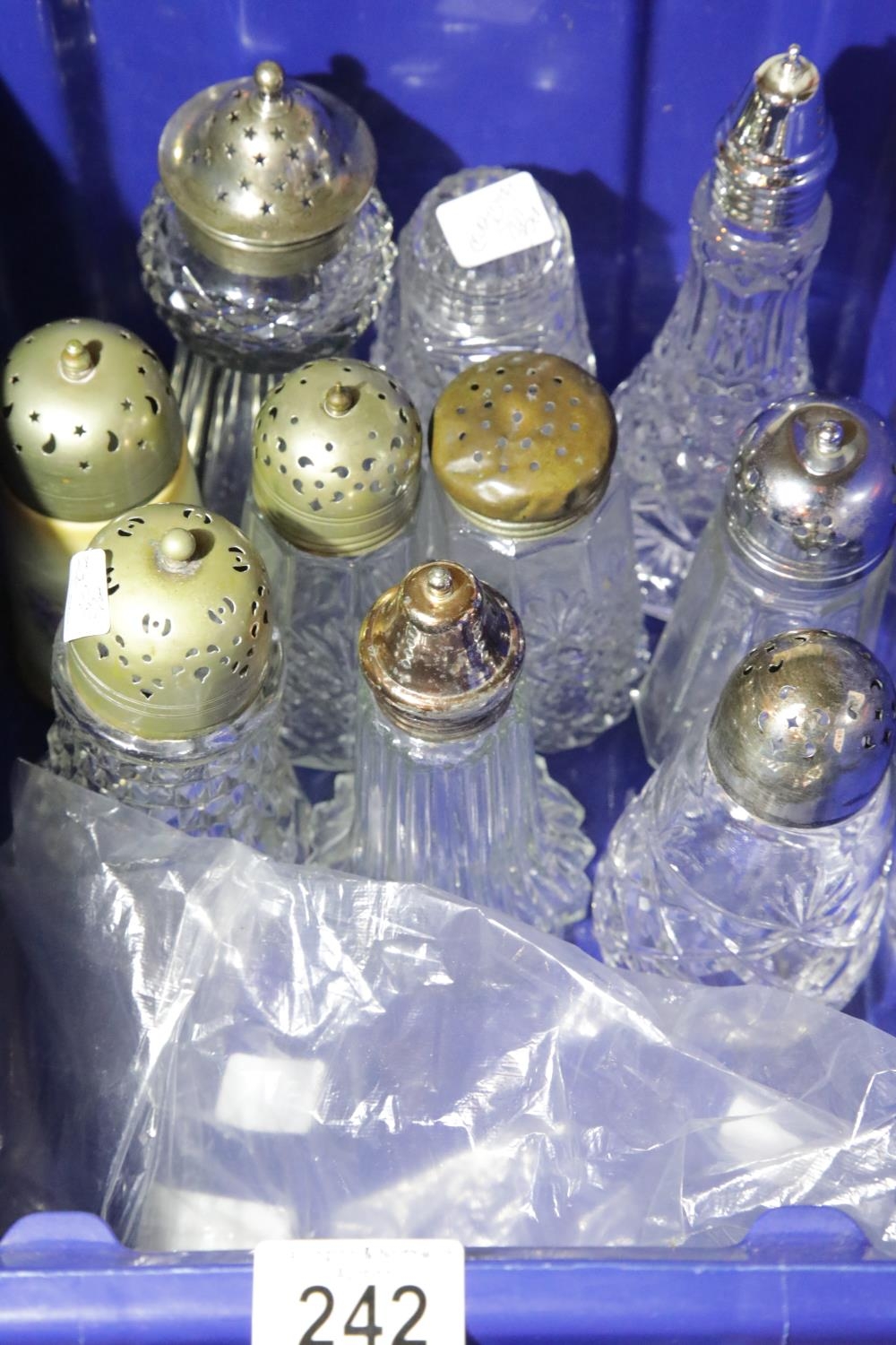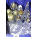 Ten assorted glass sugar casters with silver plated tops. Not available for in-house P&P.