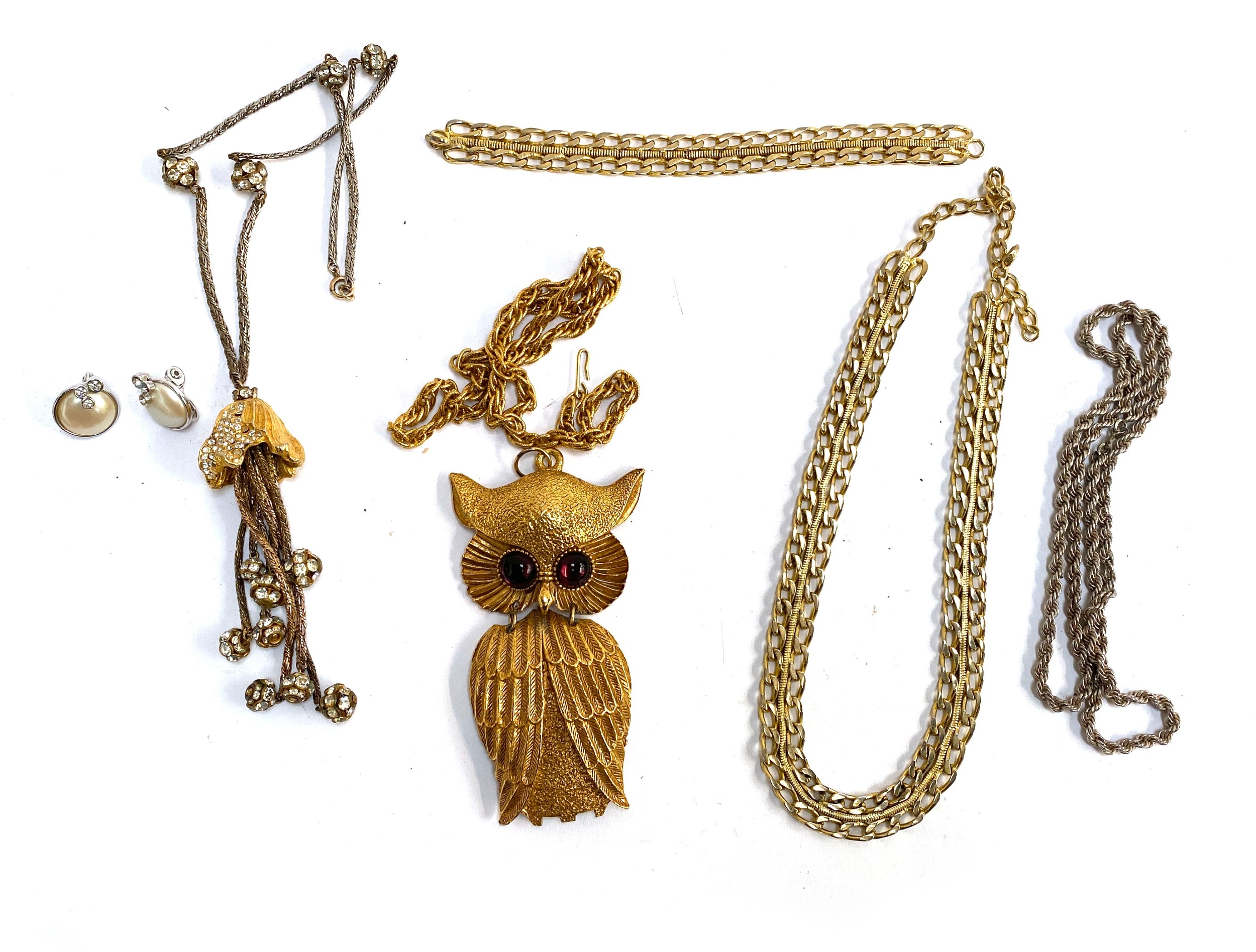 A quantity of costume jewellery to include a large gold tone owl necklace, the pendant 11cmL, Monet faux pearl clip on earrings etc