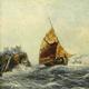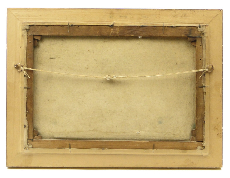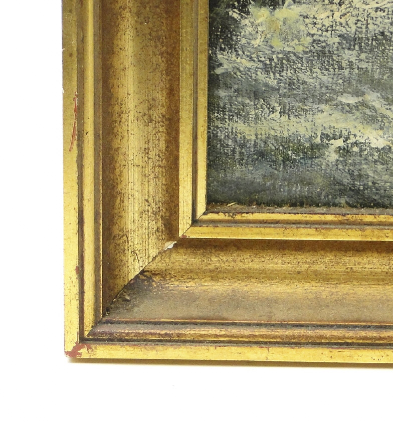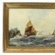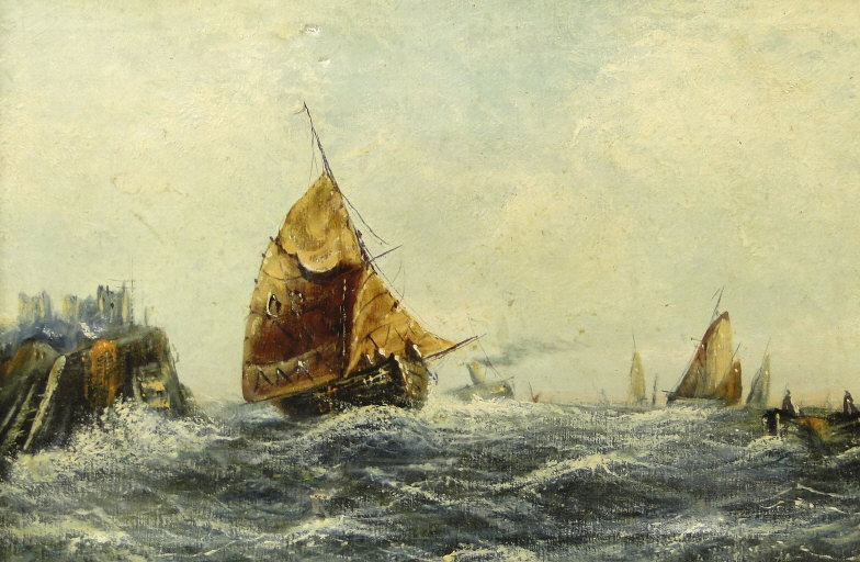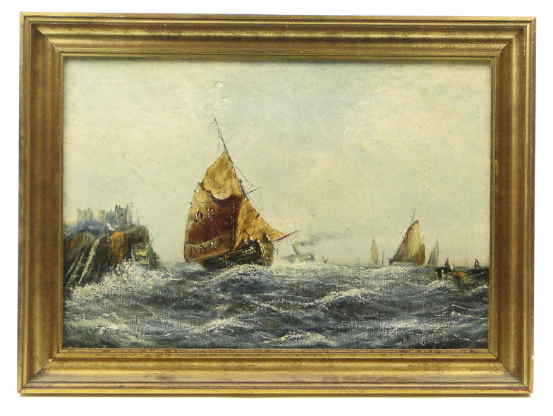 Edwardian oil onto canvas view of sailing barges entering port, gilt framed, 32cm x 46cm